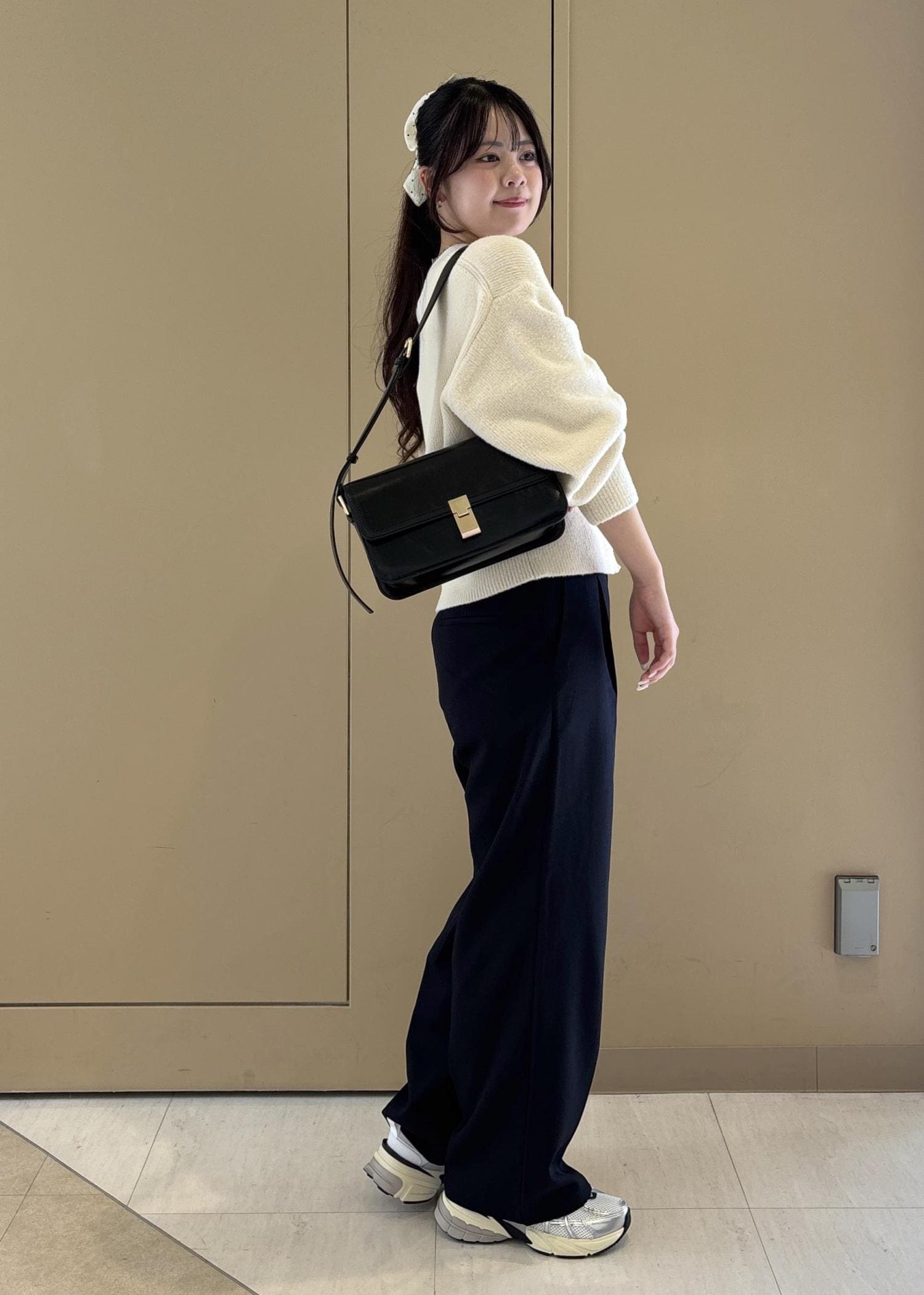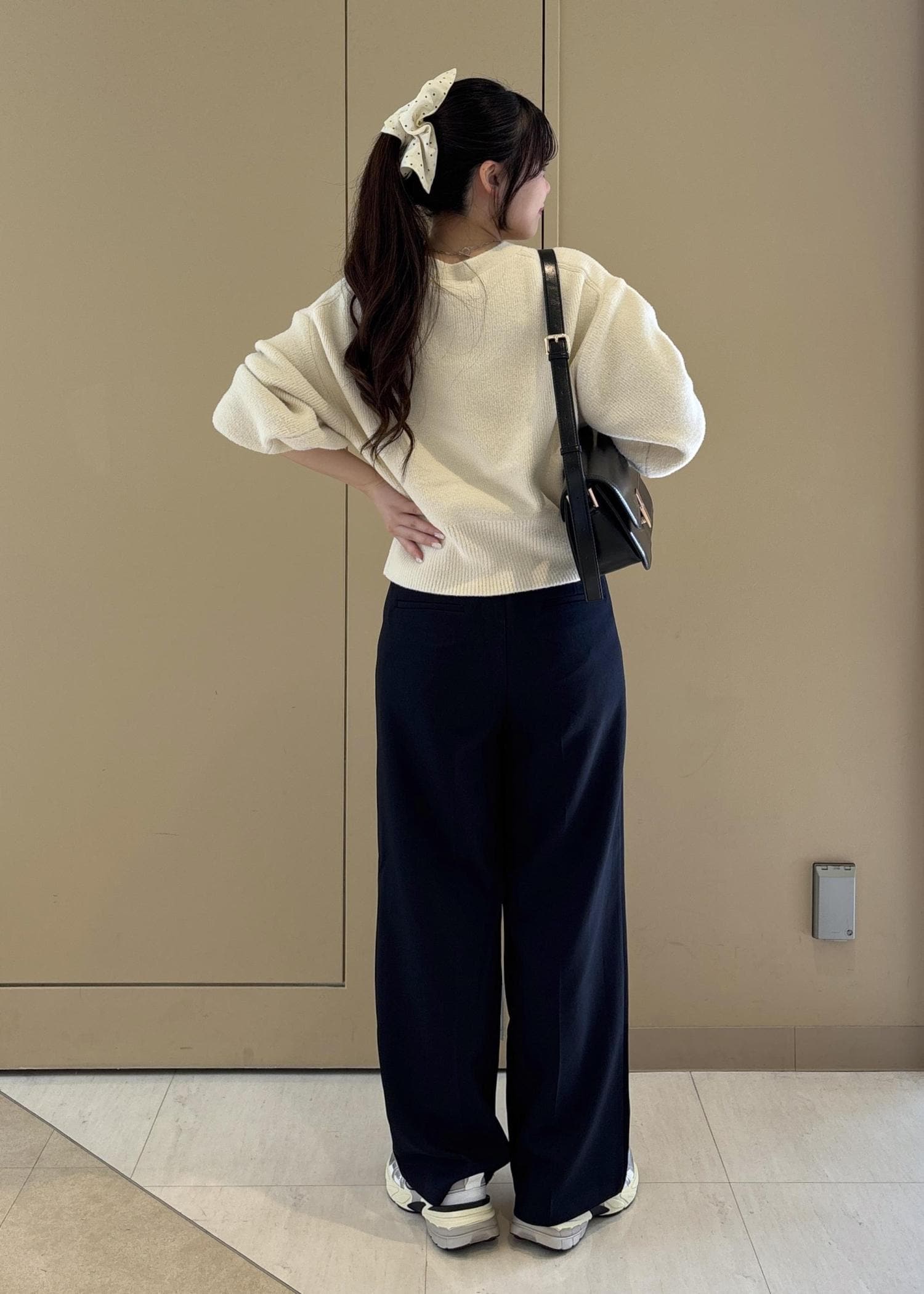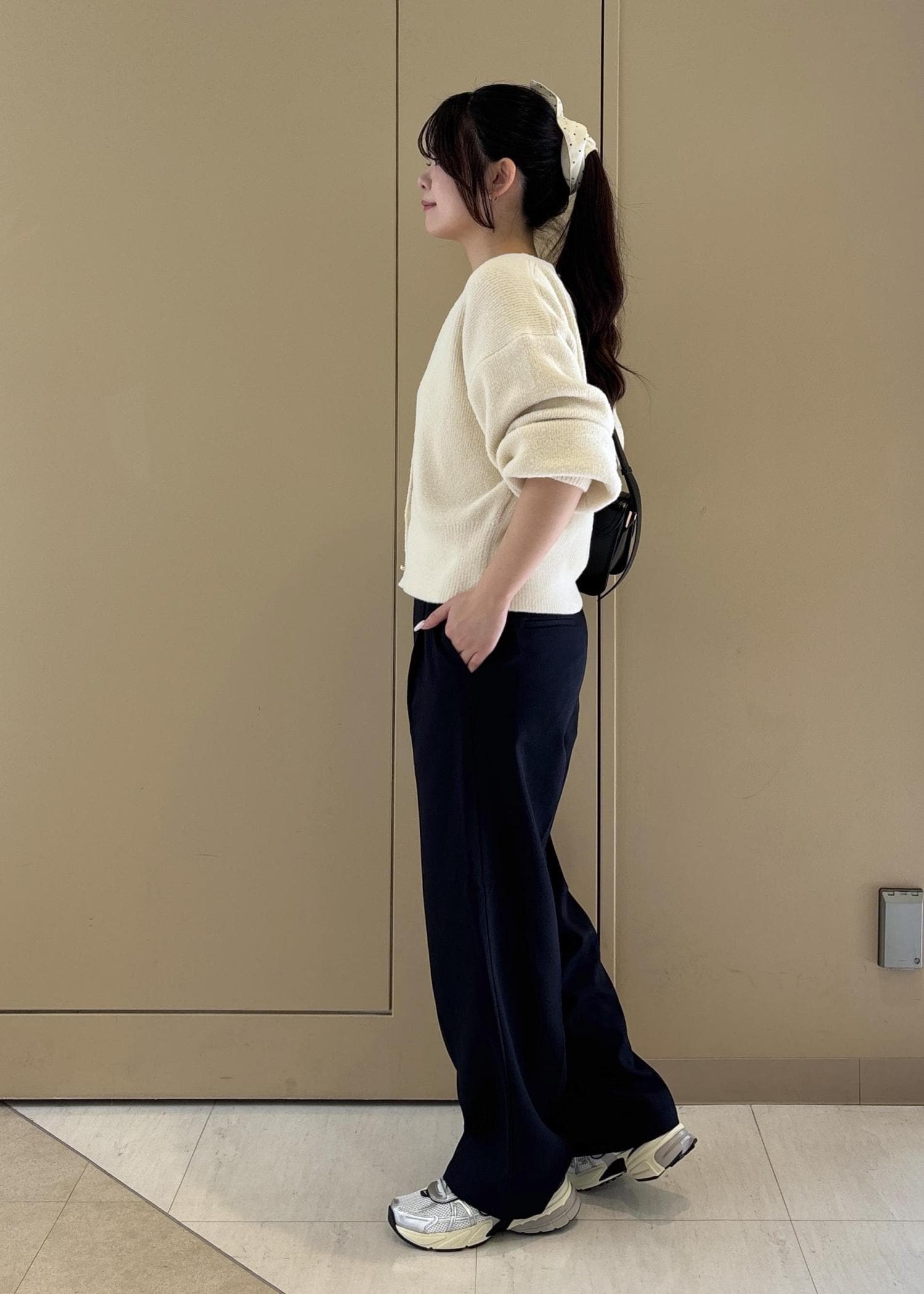 ふんわりとした質感のカーディガンにワイドパンツを合わせ、外しのスニーカーでシンプルながら異素材がハマるカジュアルミックスコーデに。
