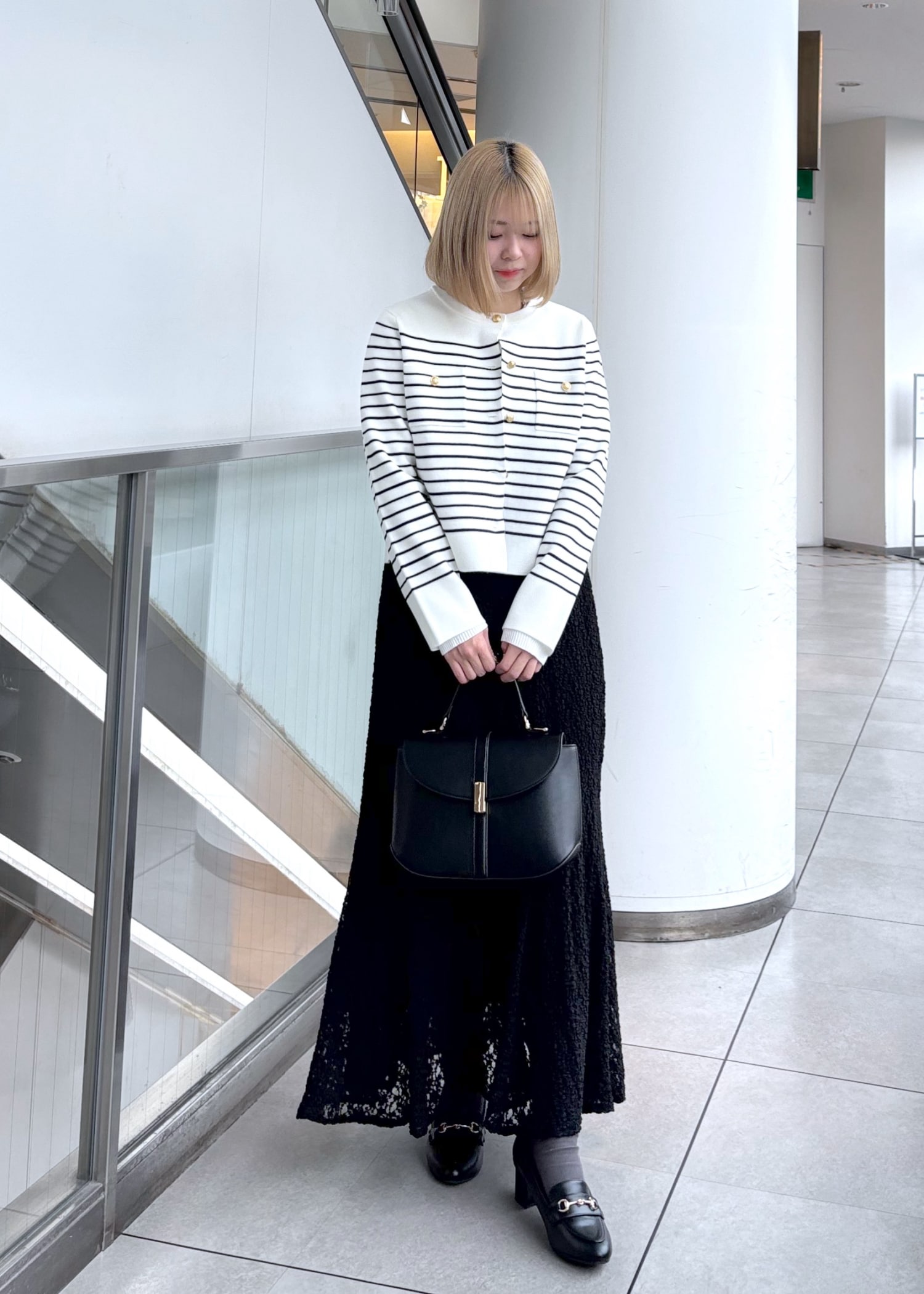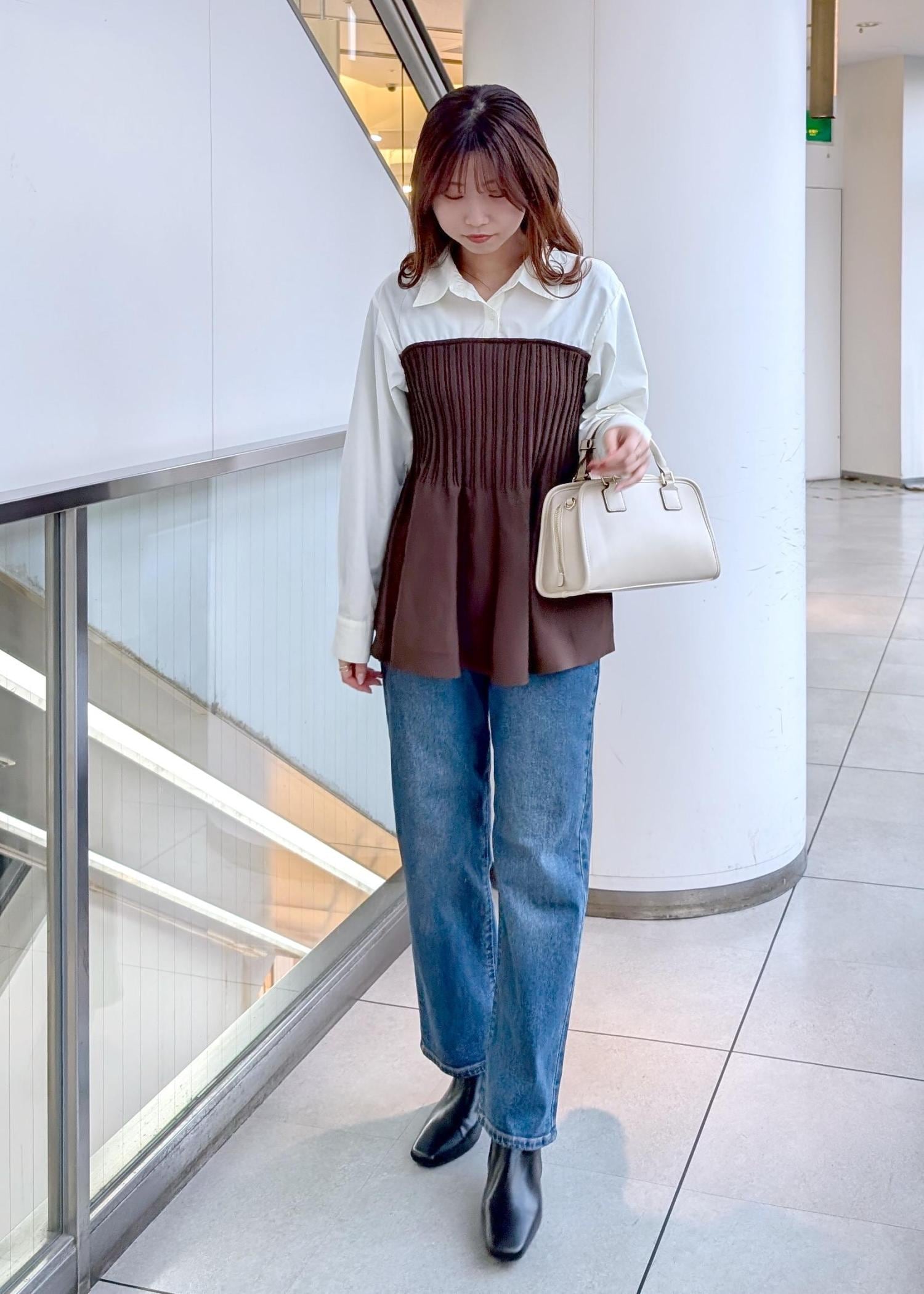ふわふわのショート丈カーディガンとマーメイドスカートを合わせた少しフェミニンな印象のお出掛けスタイルにしました。カーディガンは腰位置くらいの短め丈で、インナーにシャツや薄手のニットを入れると冬まで使っていただけます。