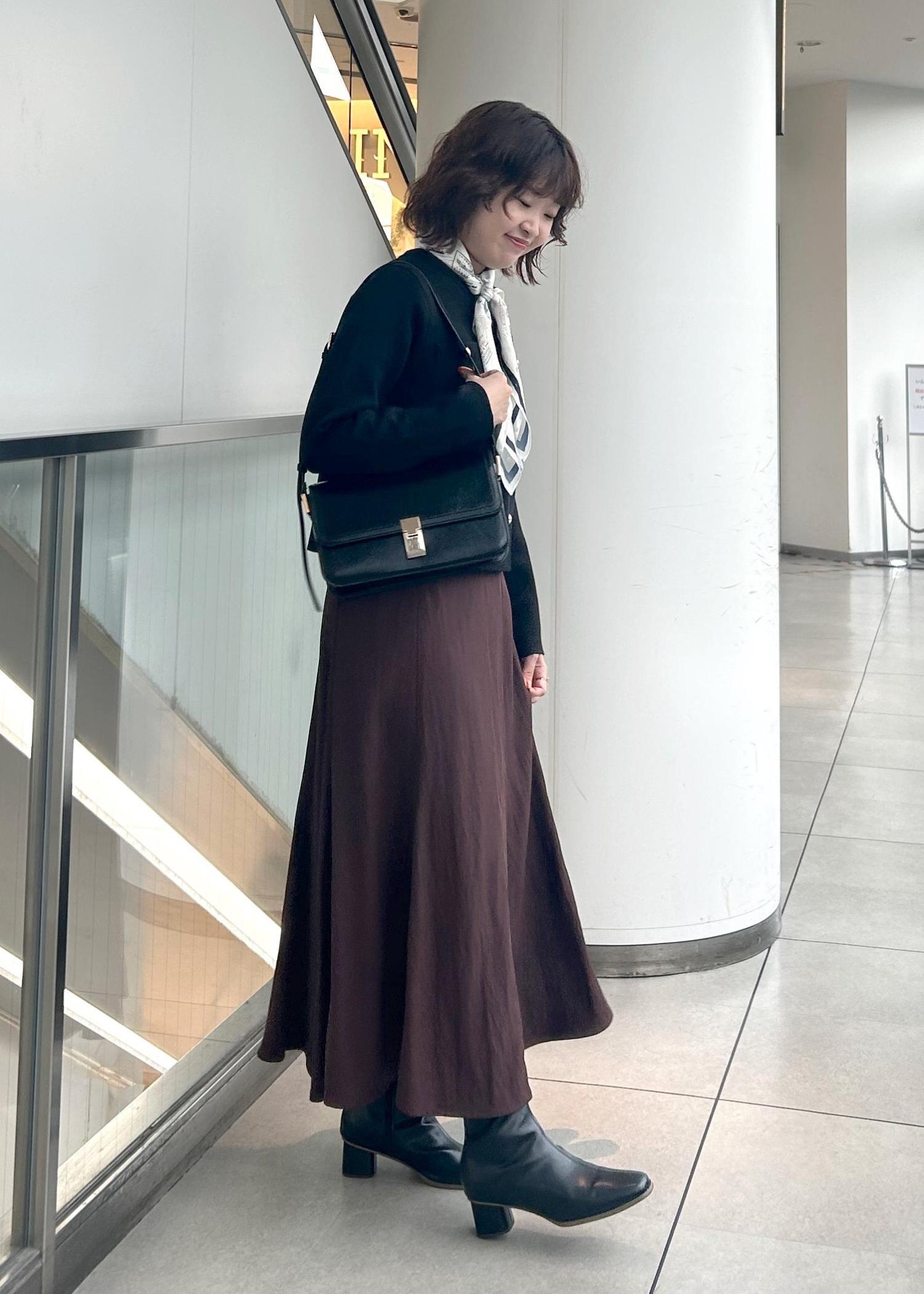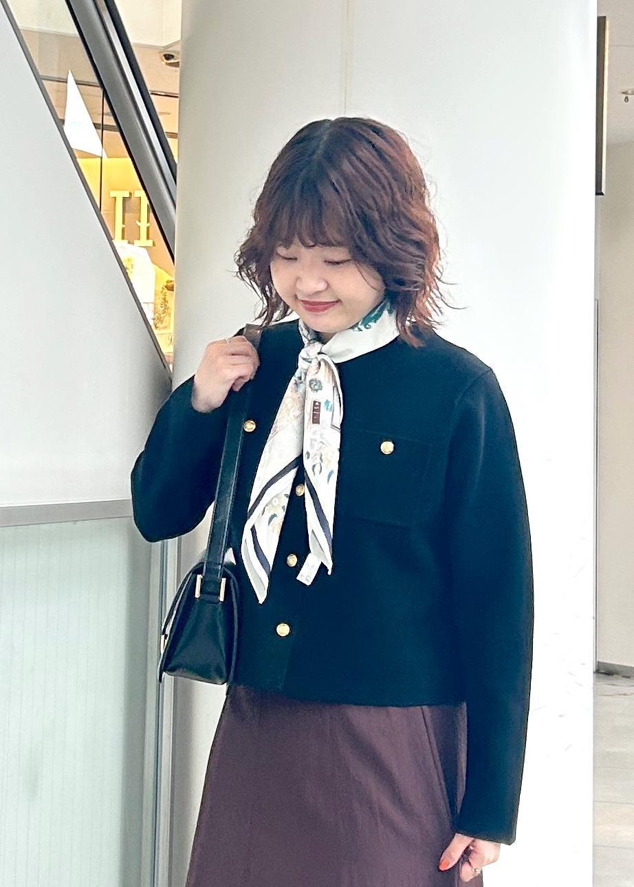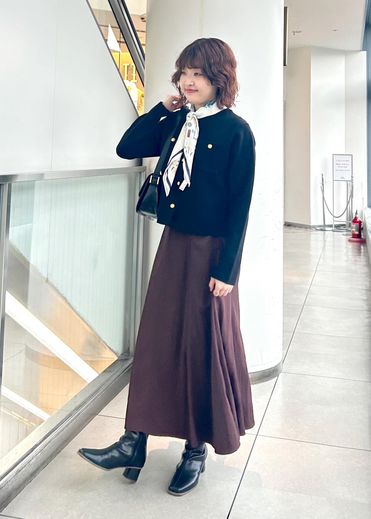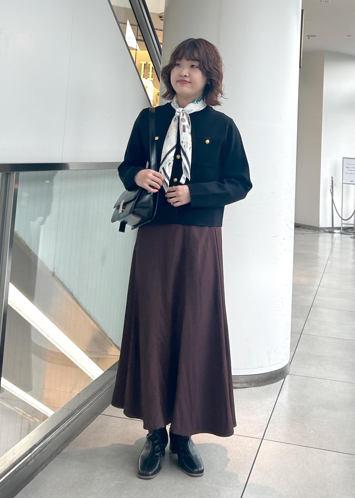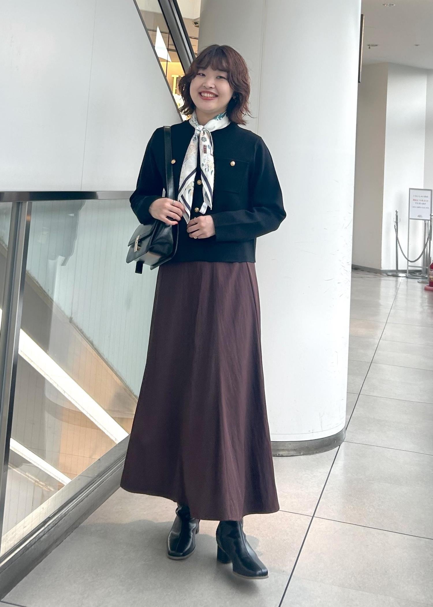 スカーフを巻くことで華やかにみえるコーデにしました。