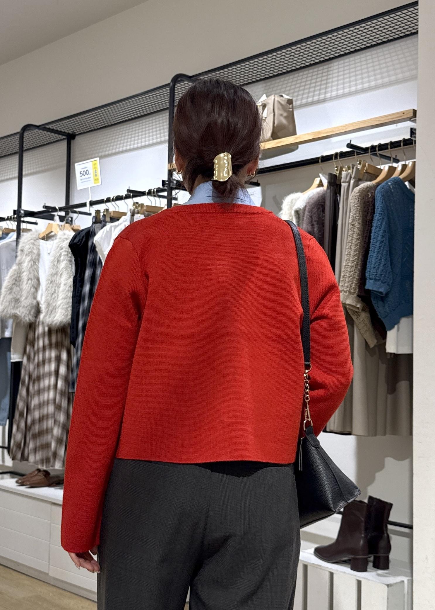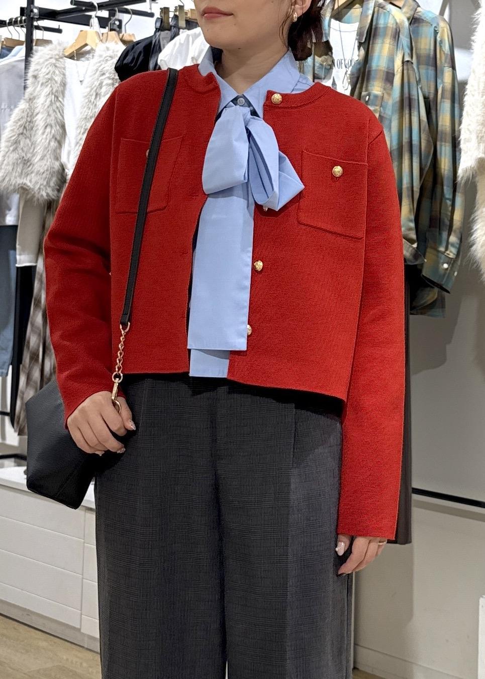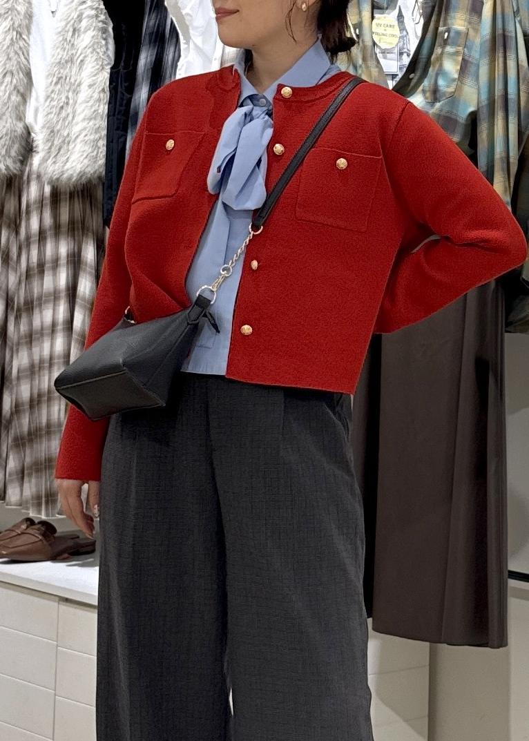 鮮やかな赤のカラーのミラノリブカーディガンをポイントに