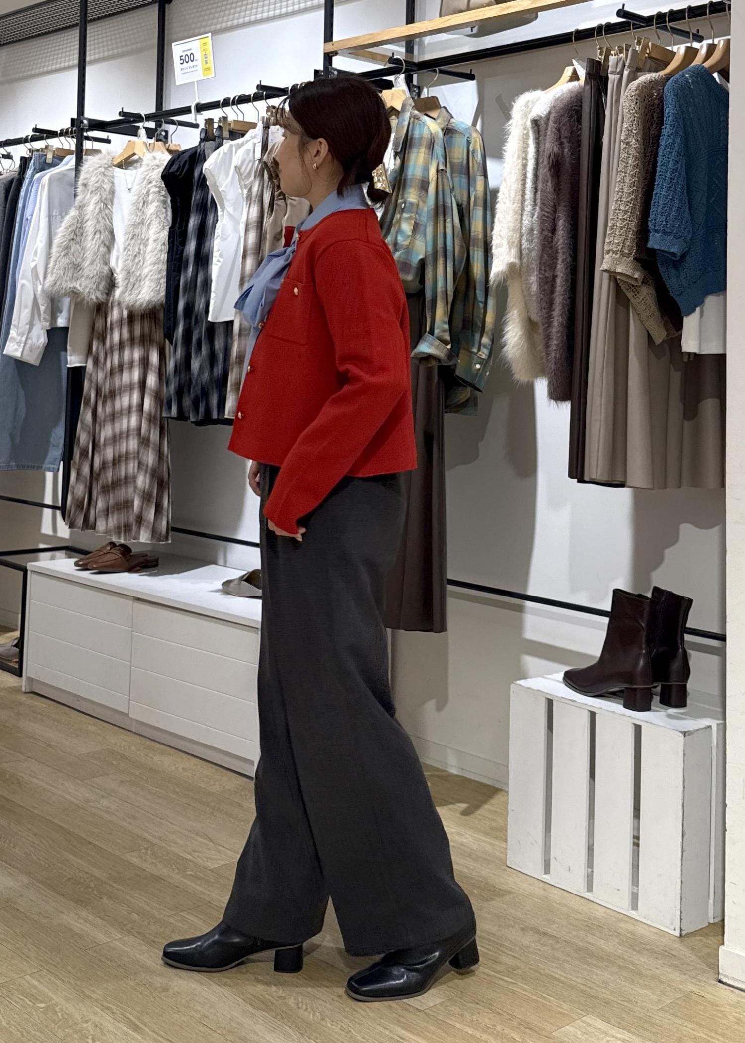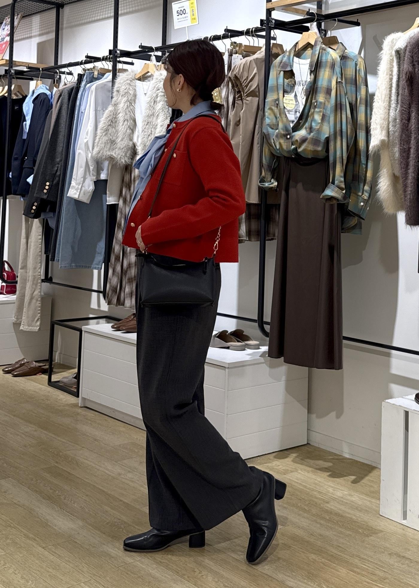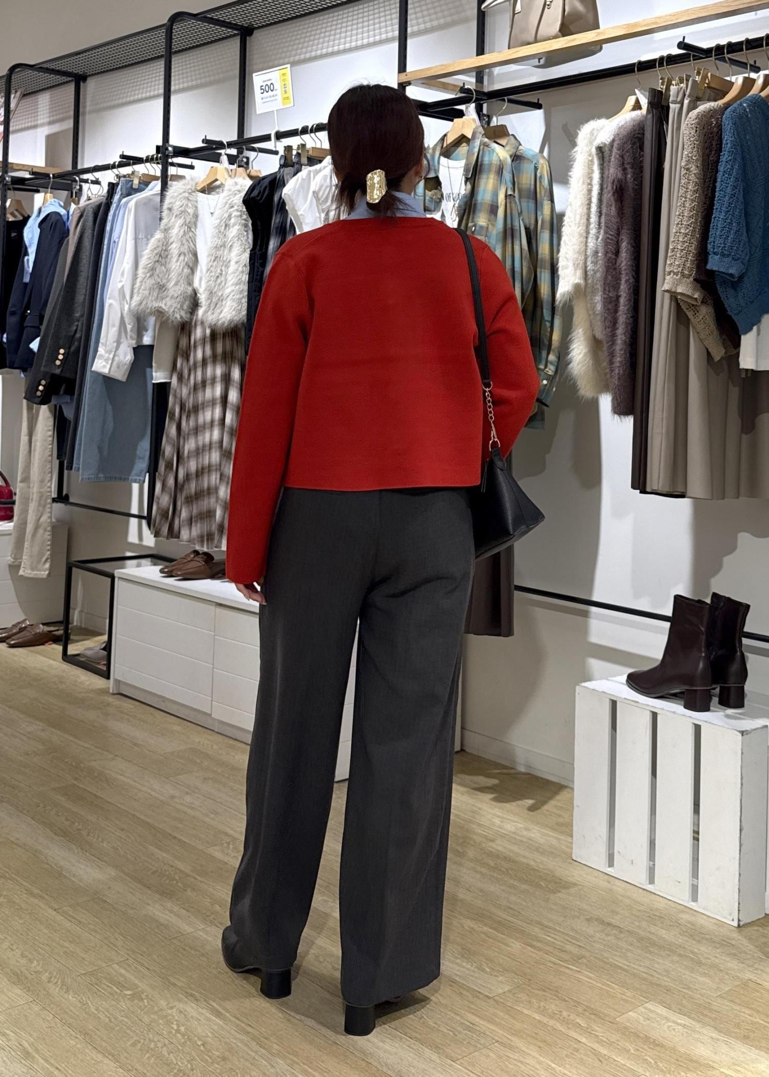 鮮やかな赤のカラーのミラノリブカーディガンをポイントに