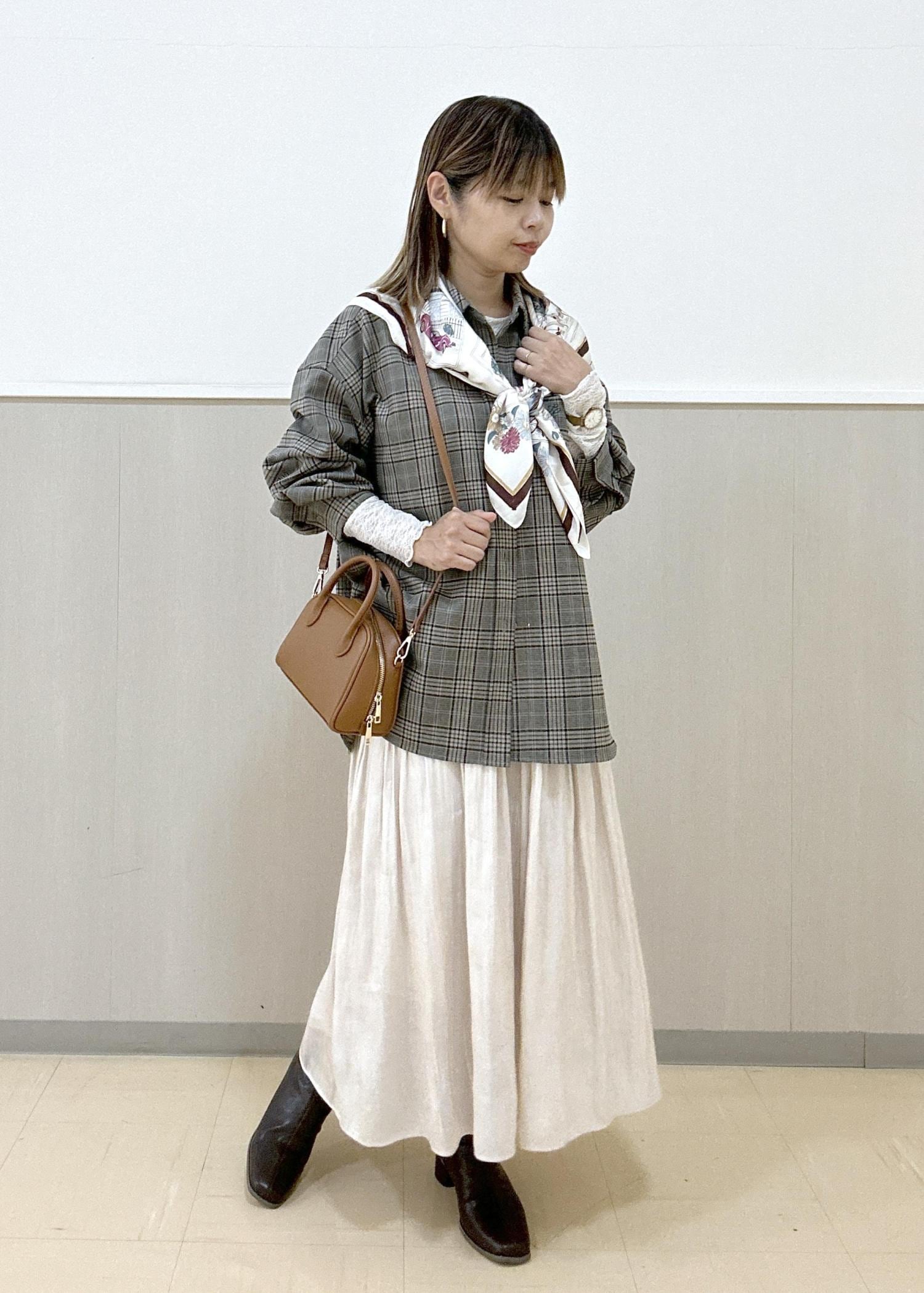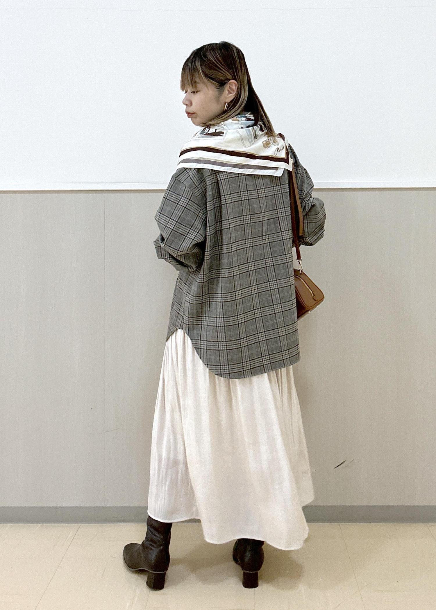 カジュアルなチェックのシャツにシャイニープリーツスカートを合わせてレディライクに。