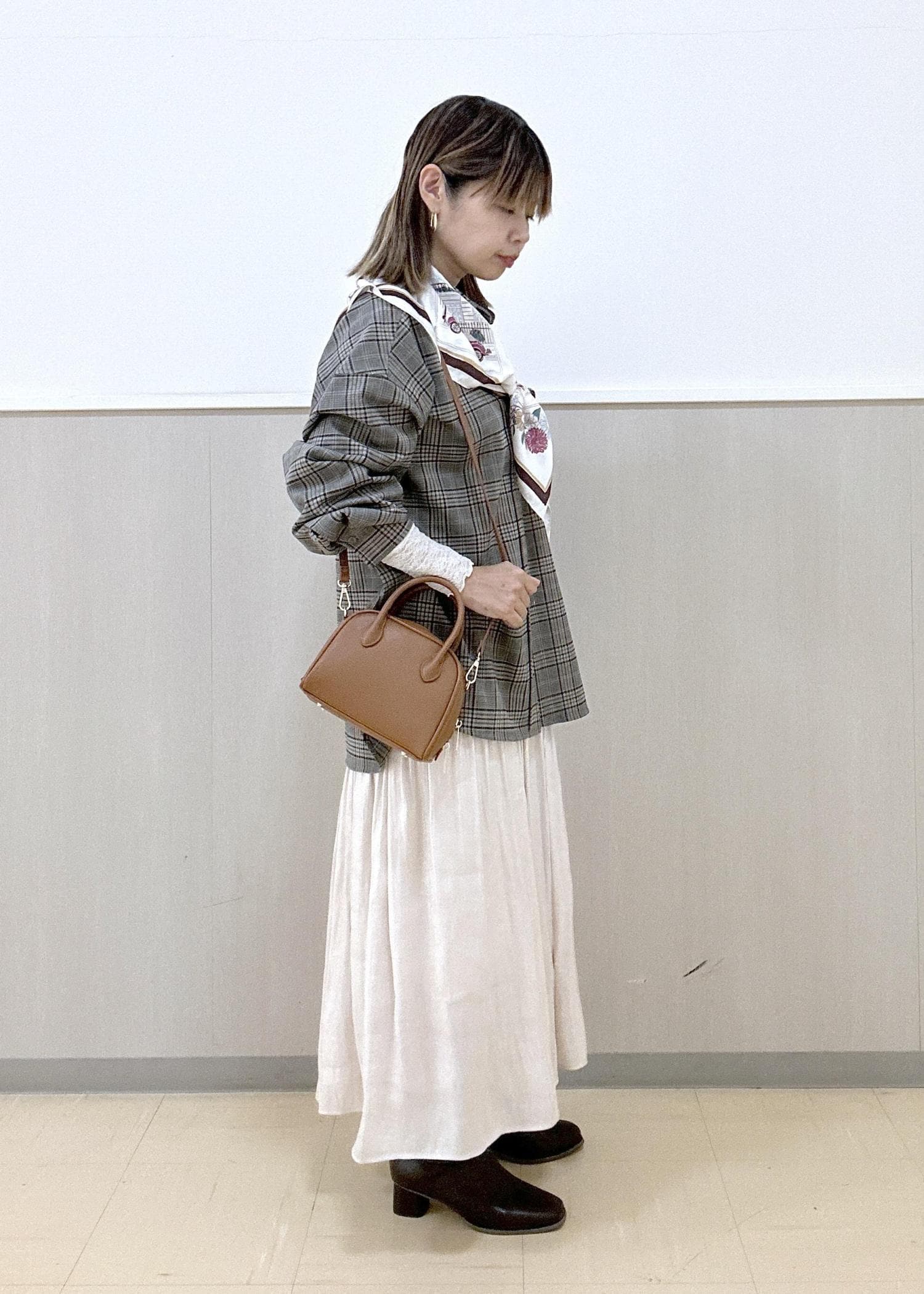 ベージュとブラウンの色使いで秋らしく。小物もブラウンで秋カラーに。