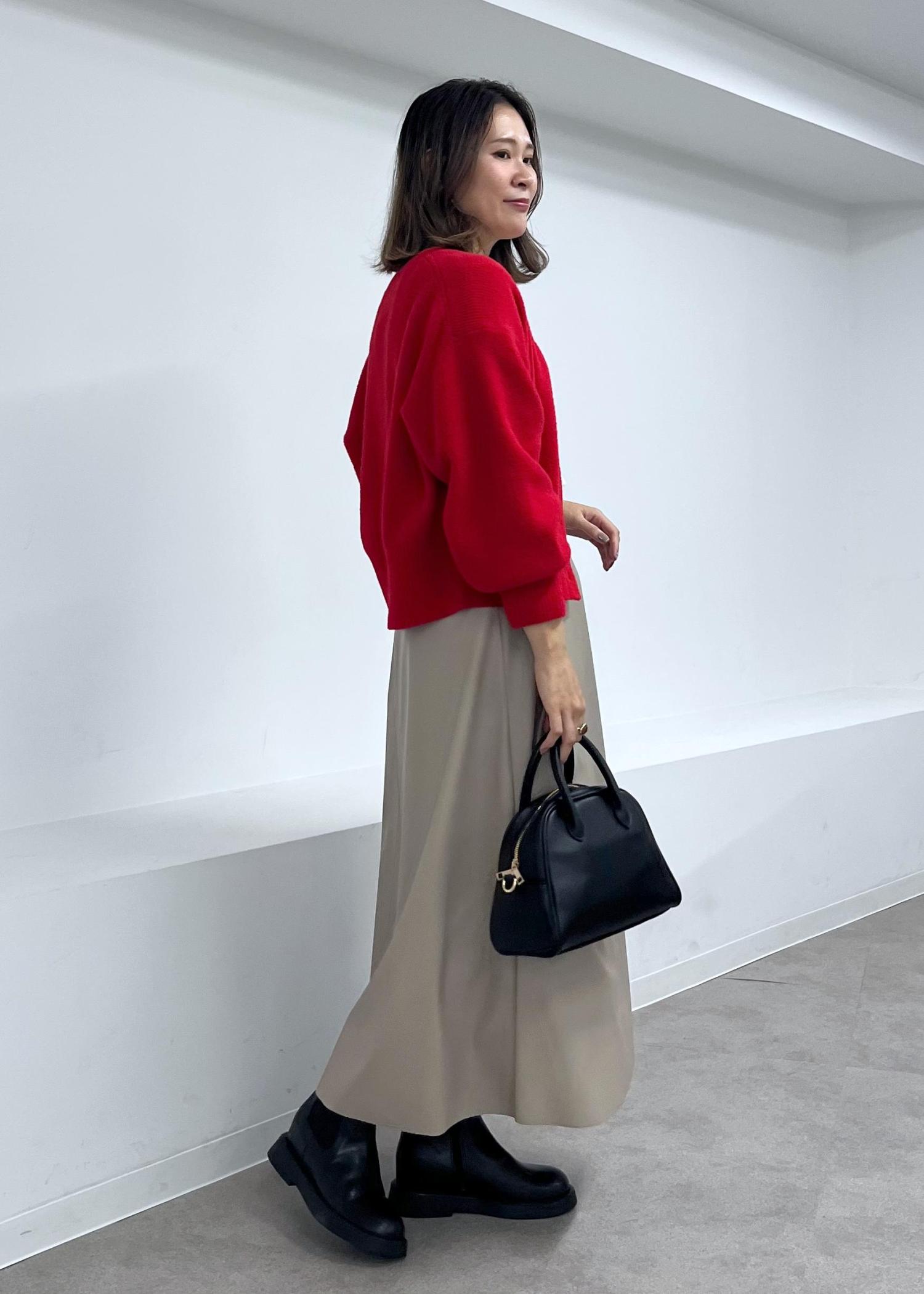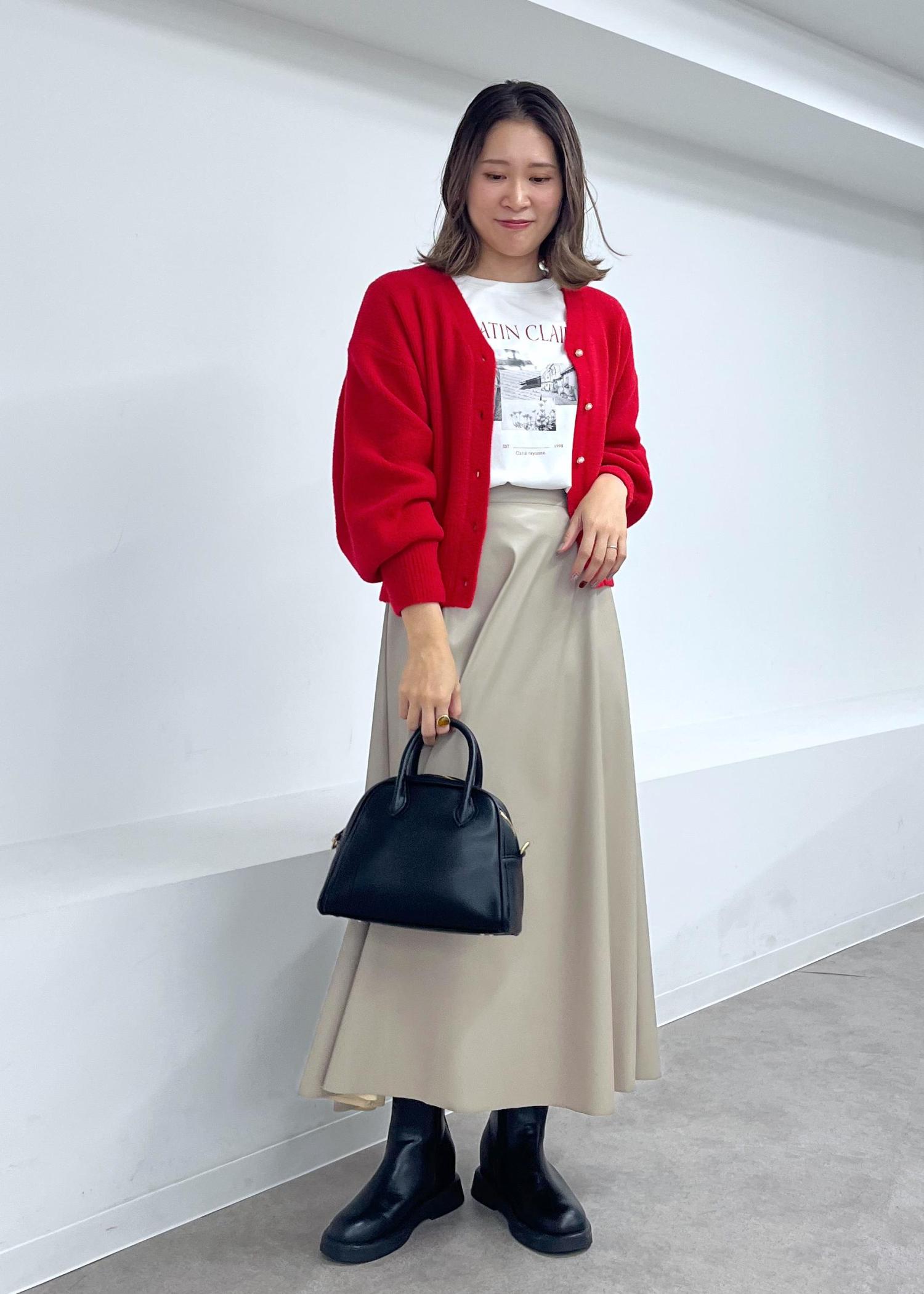 女性らしいボタンデザインのカーディガンにレザースカートを合わせたスタイリング。