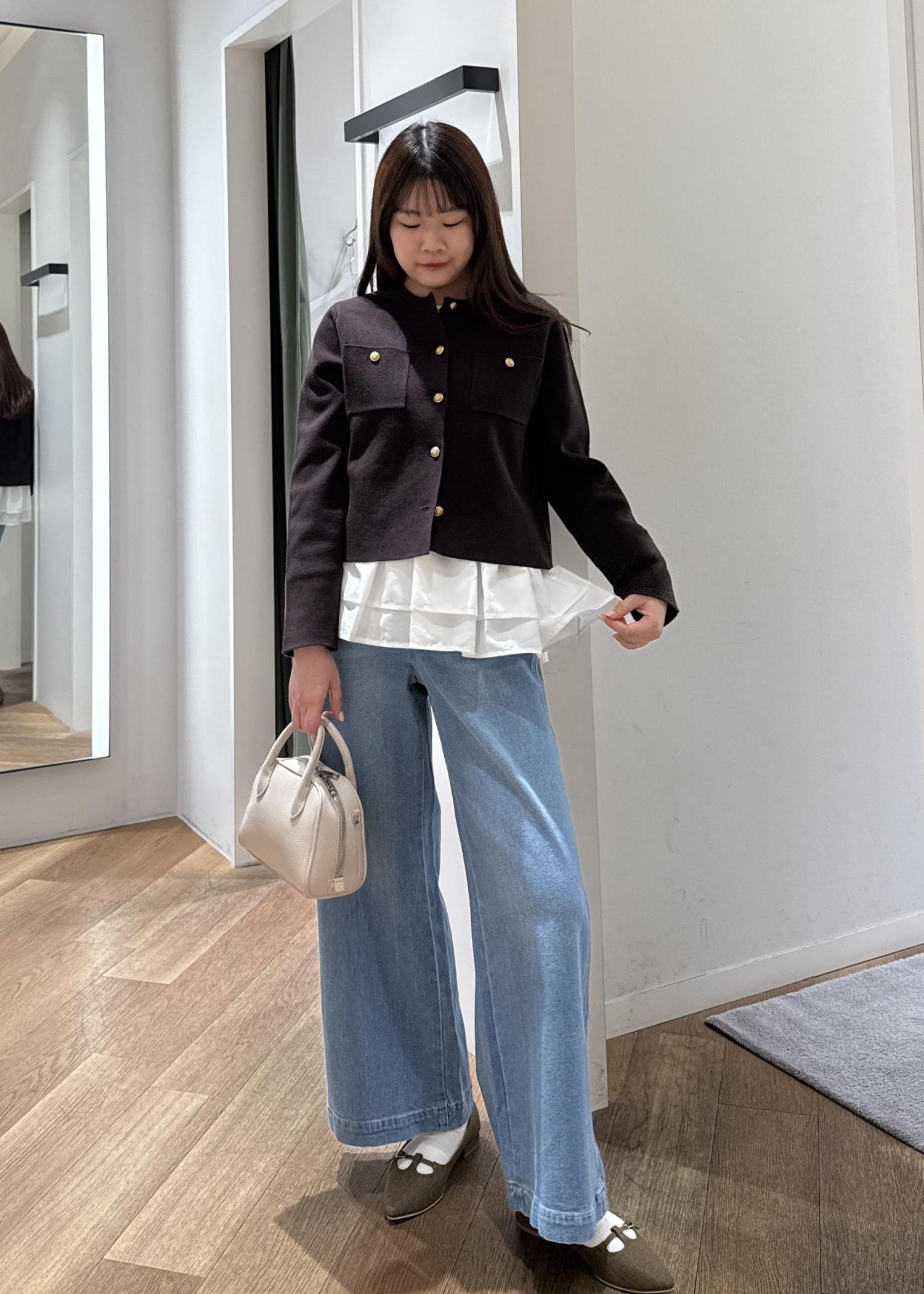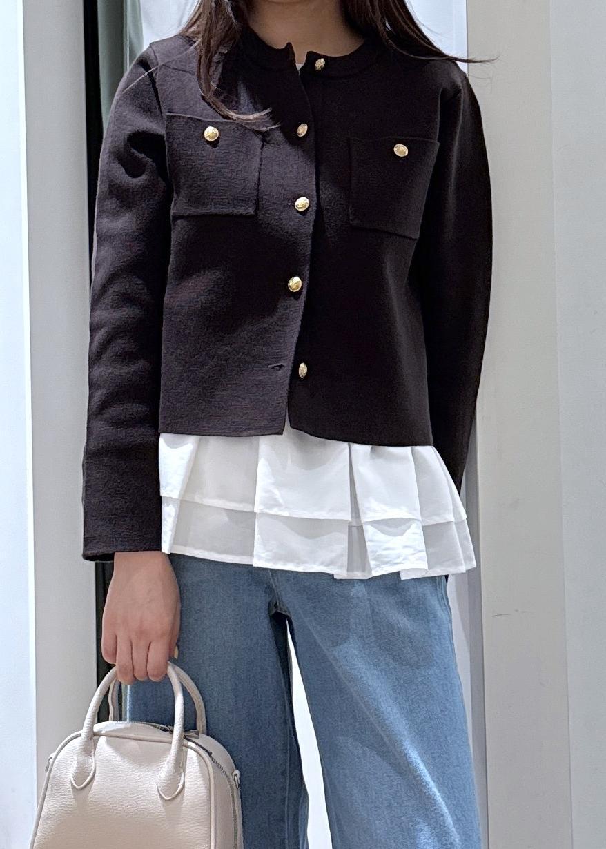 M、Lサイズではボタンの数が異なり、写真ではMサイズを着用。短すぎず、長すぎない扱いやすい丈感で、パンツにもスカートにも合わせやすいと感じました。