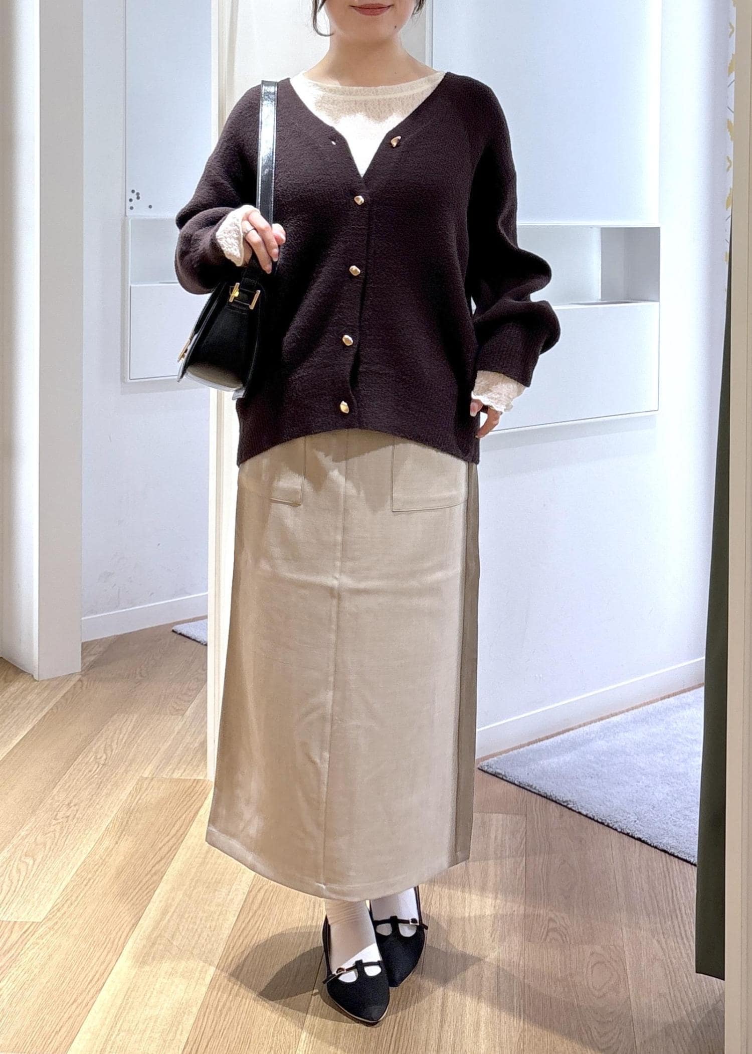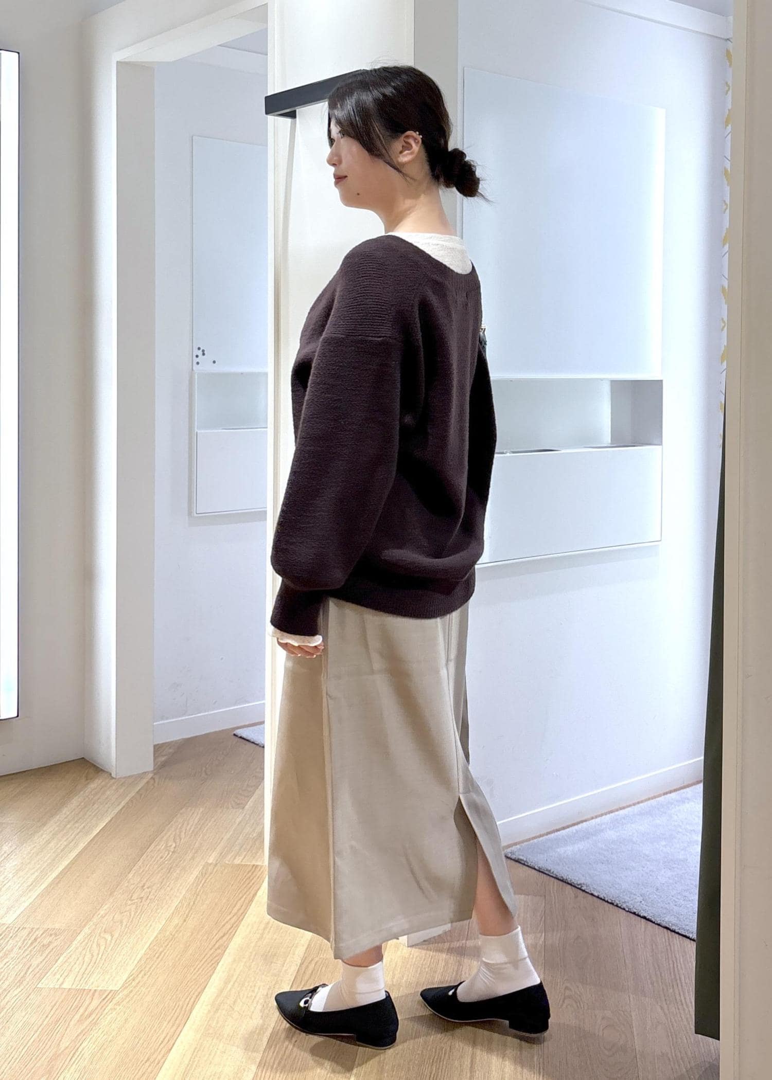 タイトなシルエットのスカートを合わせて、可愛くなりすぎない大人のゆるっとコーデにしました◎