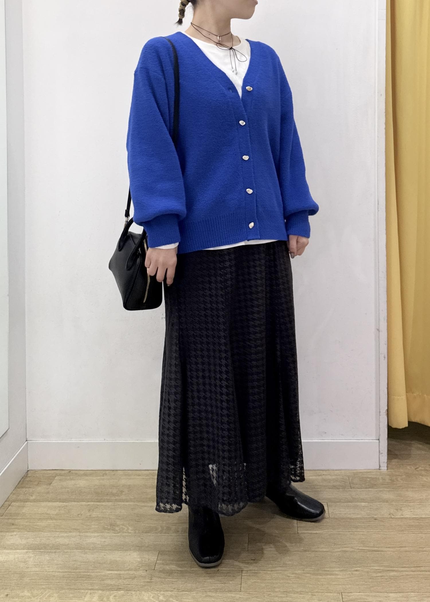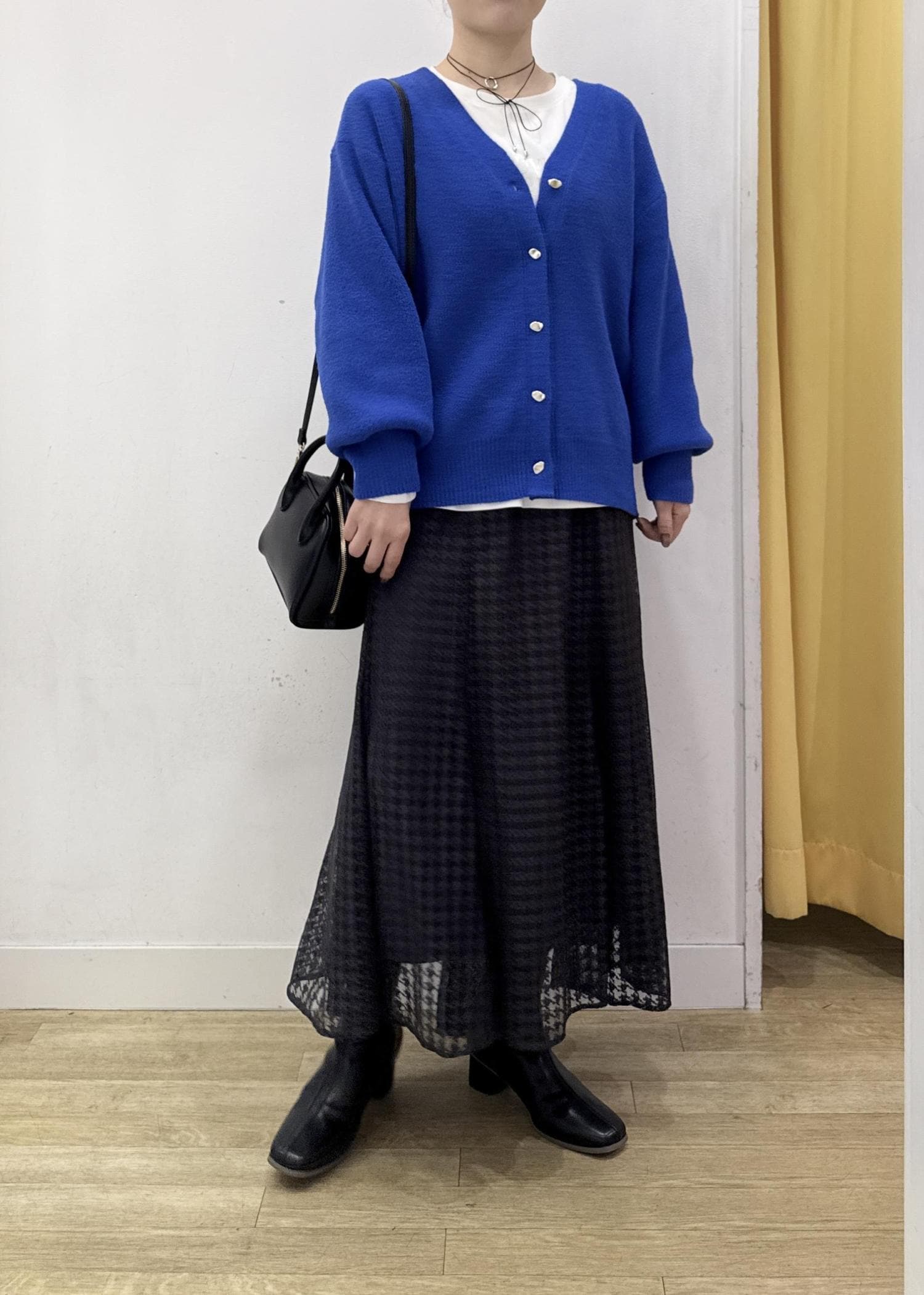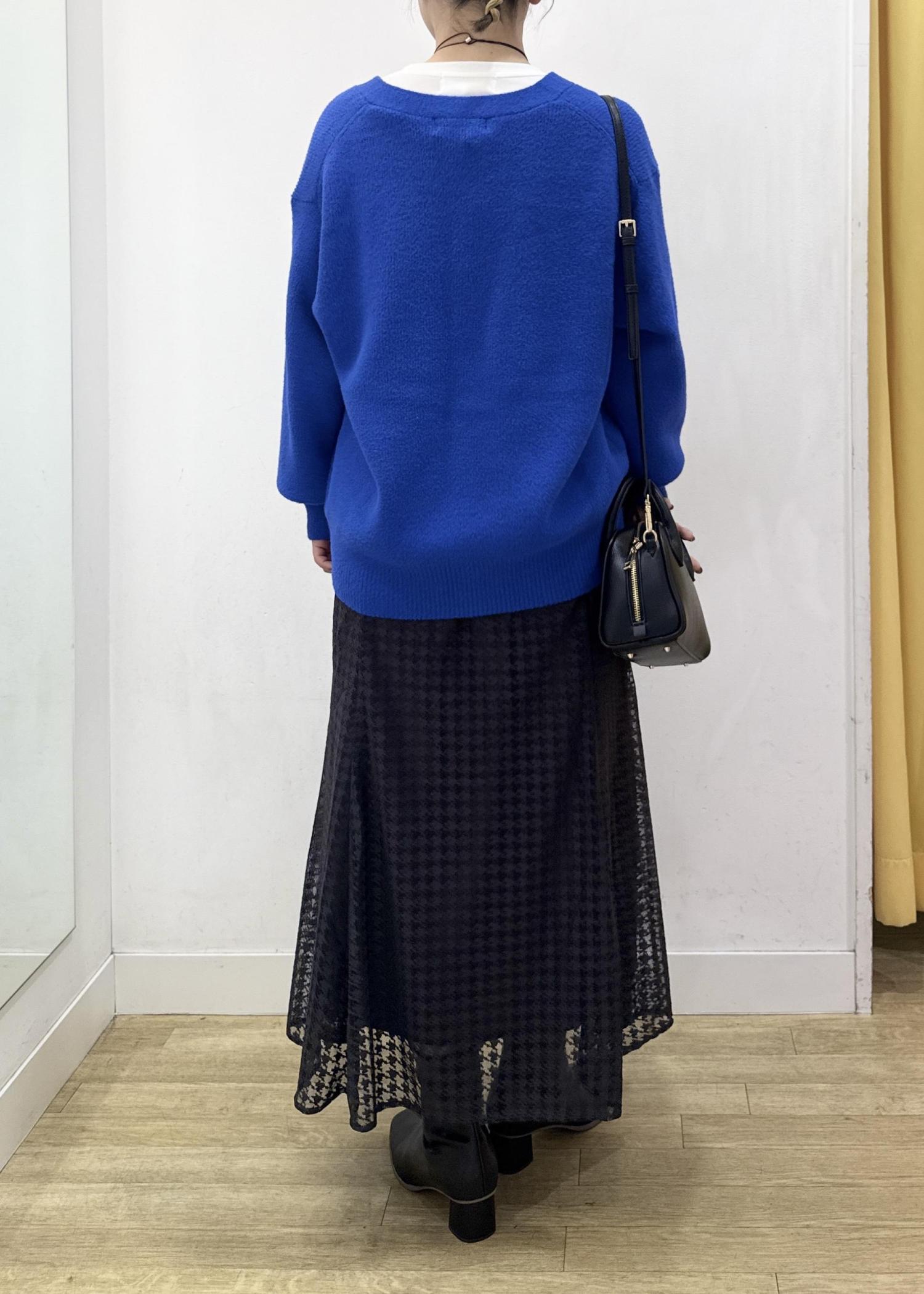 ブルーの鮮やかなカラーのふわふわニットに、マーメイドシルエットのスカートを合わせて大人カジュアルなコーディネートに☺︎