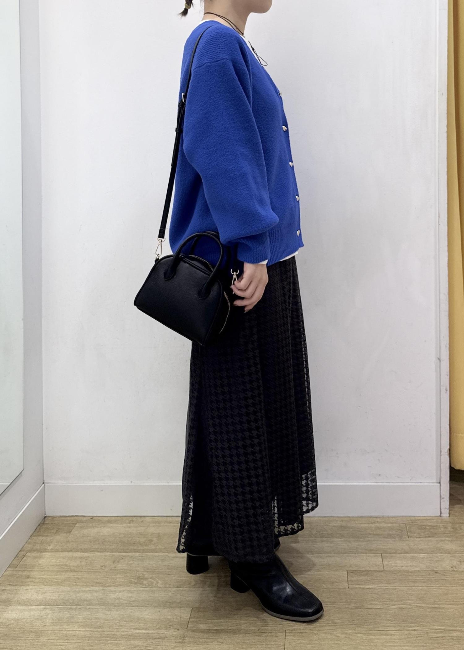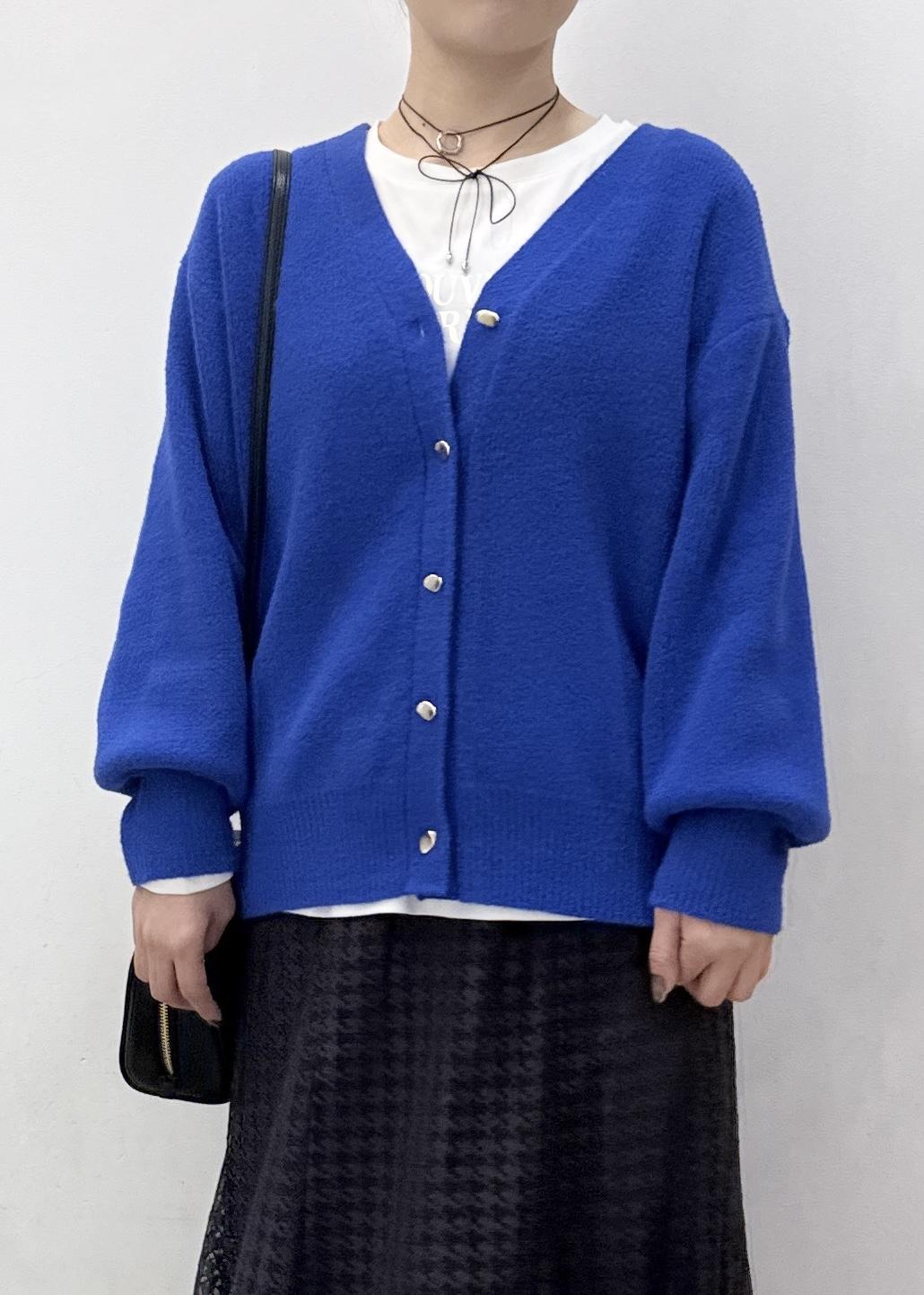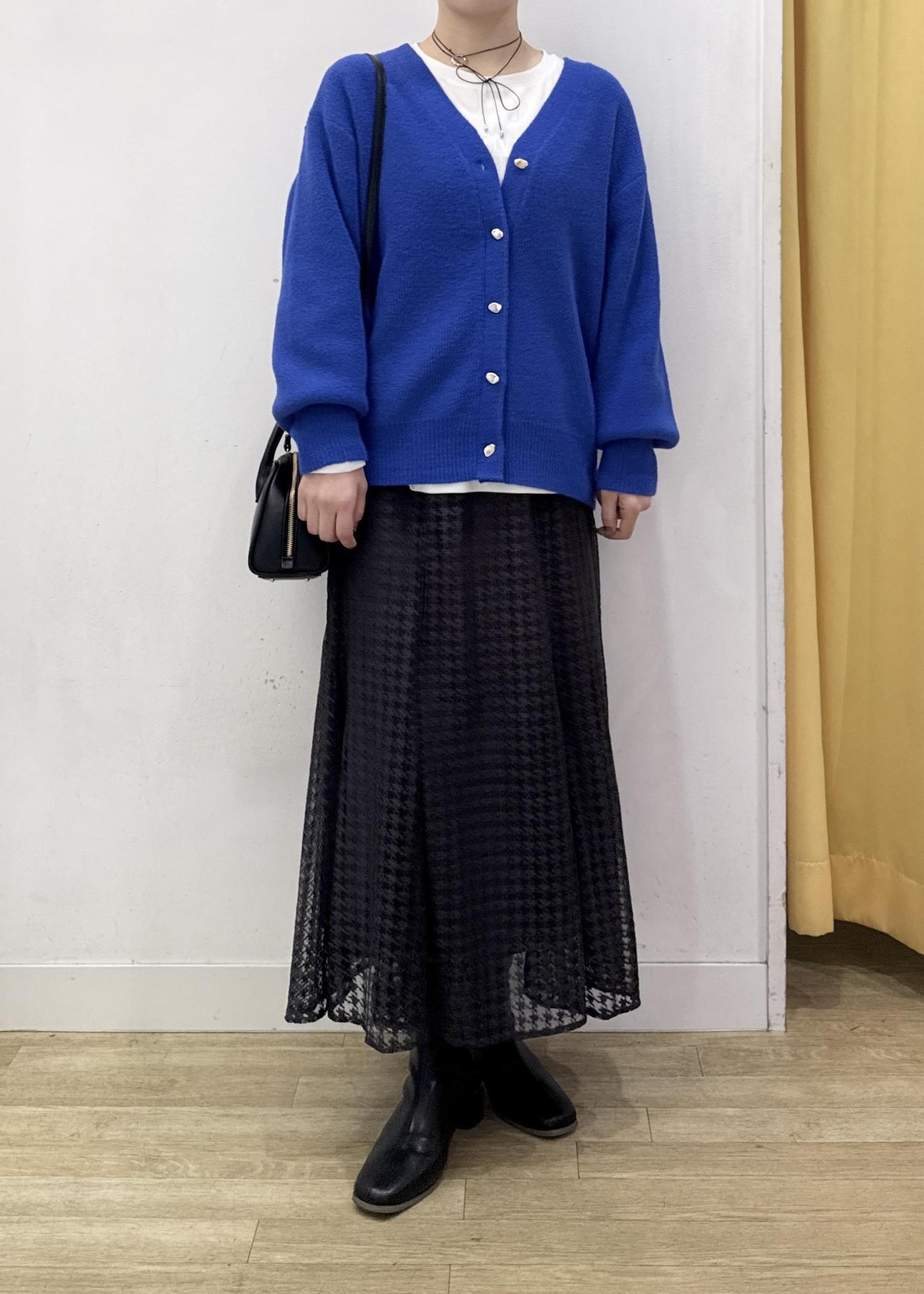 ブルーの鮮やかなカラーのふわふわニットに、マーメイドシルエットのスカートを合わせて大人カジュアルなコーディネートに☺︎