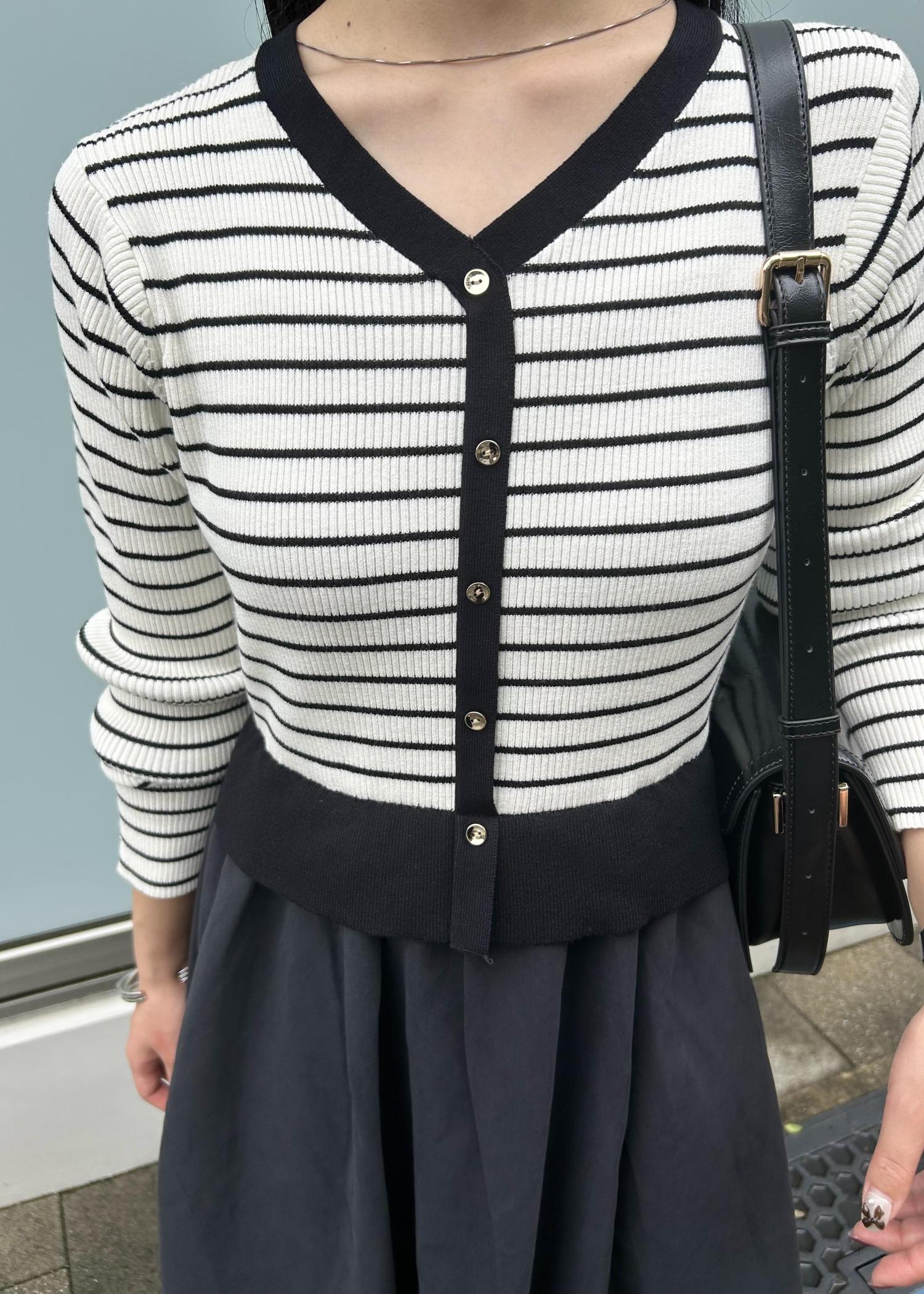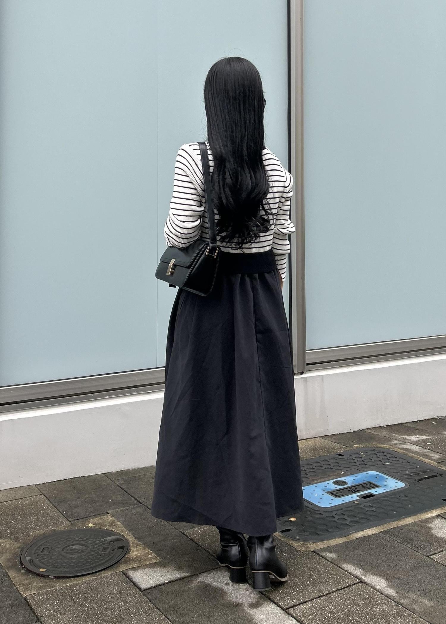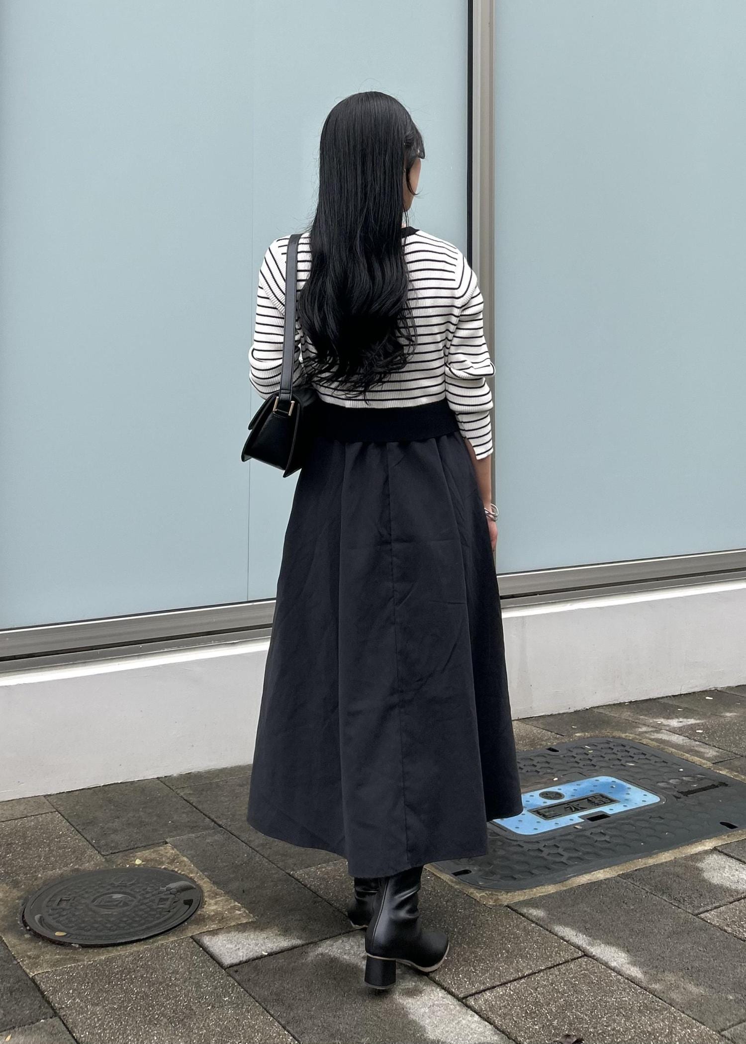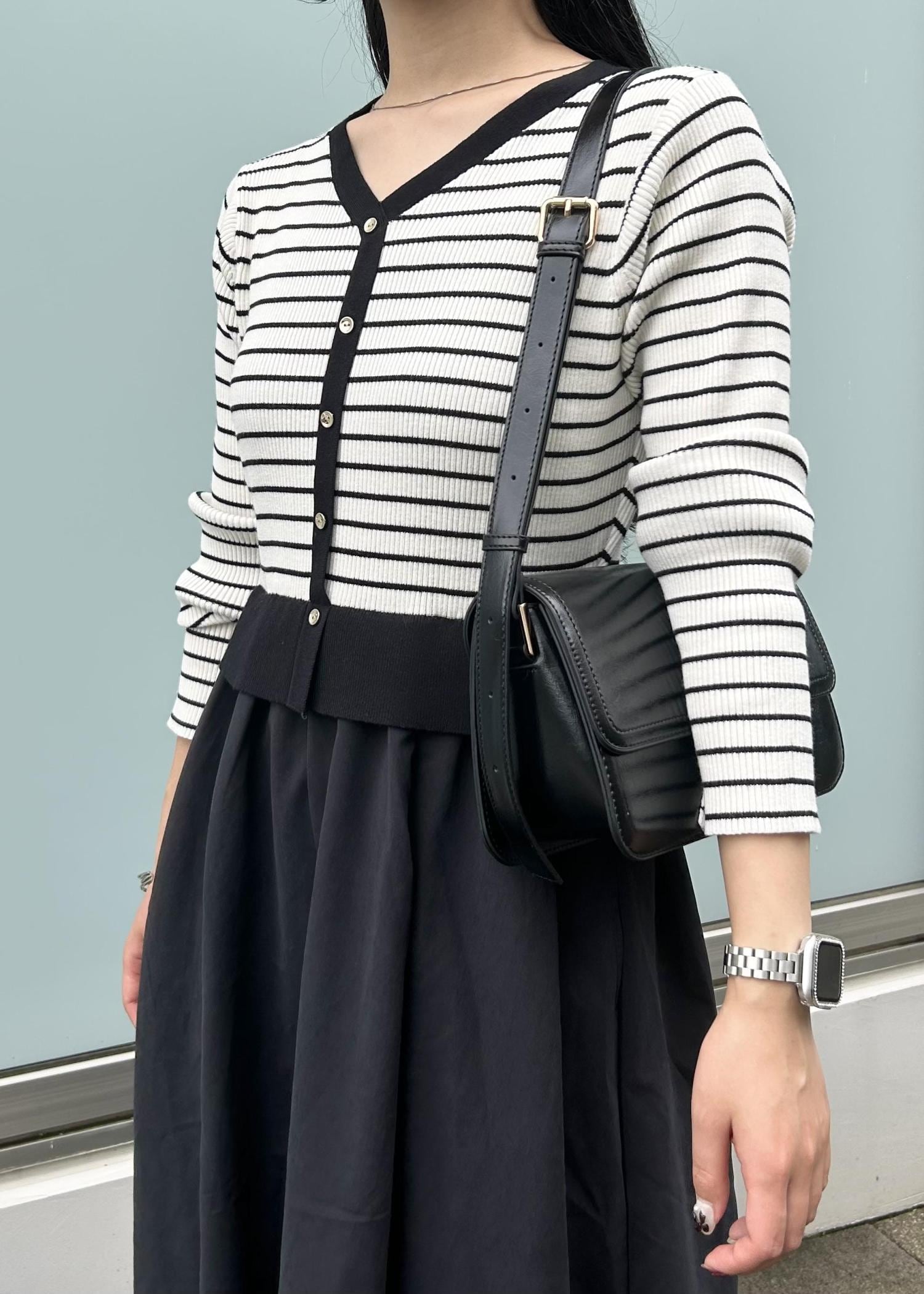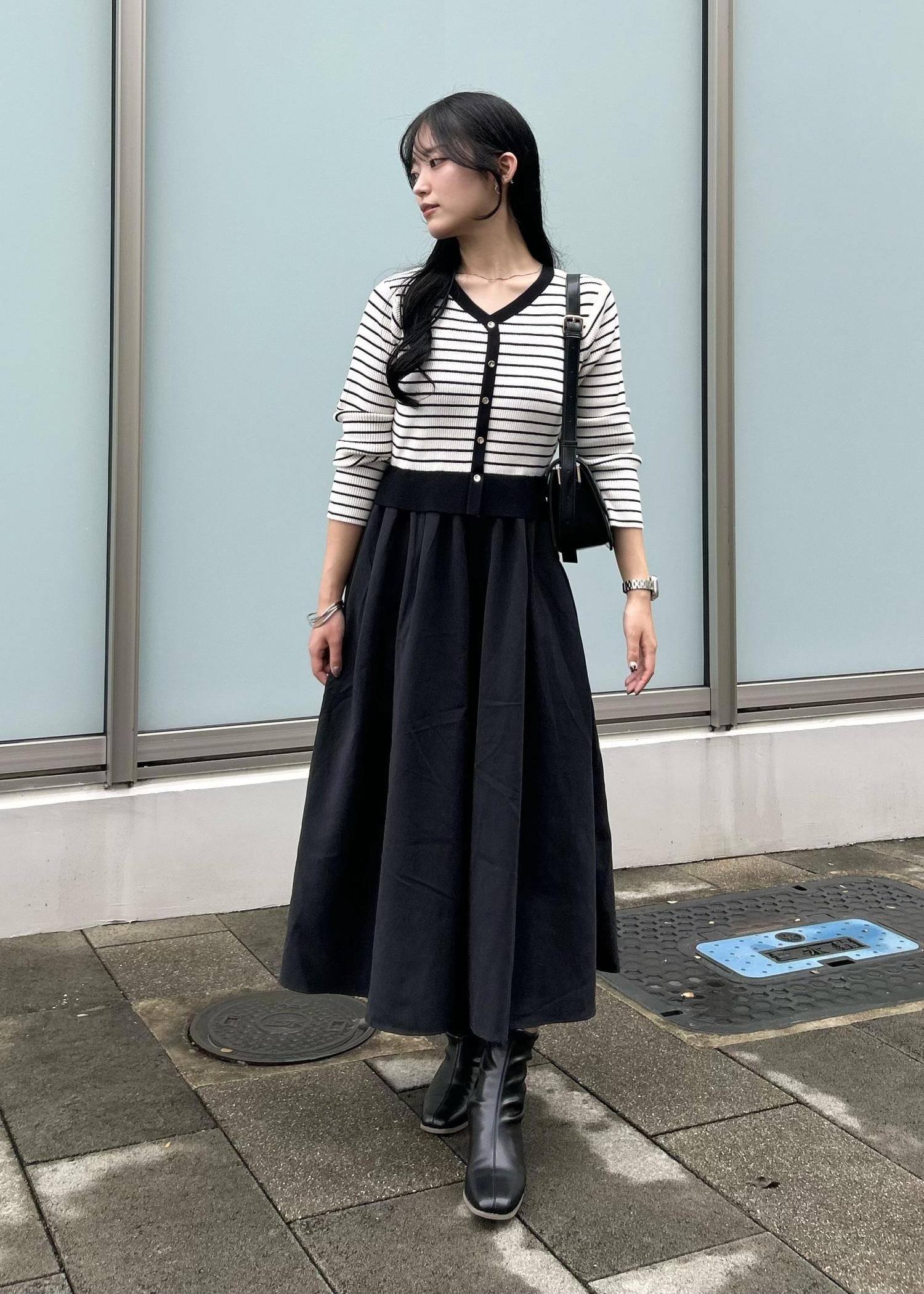 ボーダーのカーディガンとふんわりした黒スカートが一体化したドッキングワンピースで、