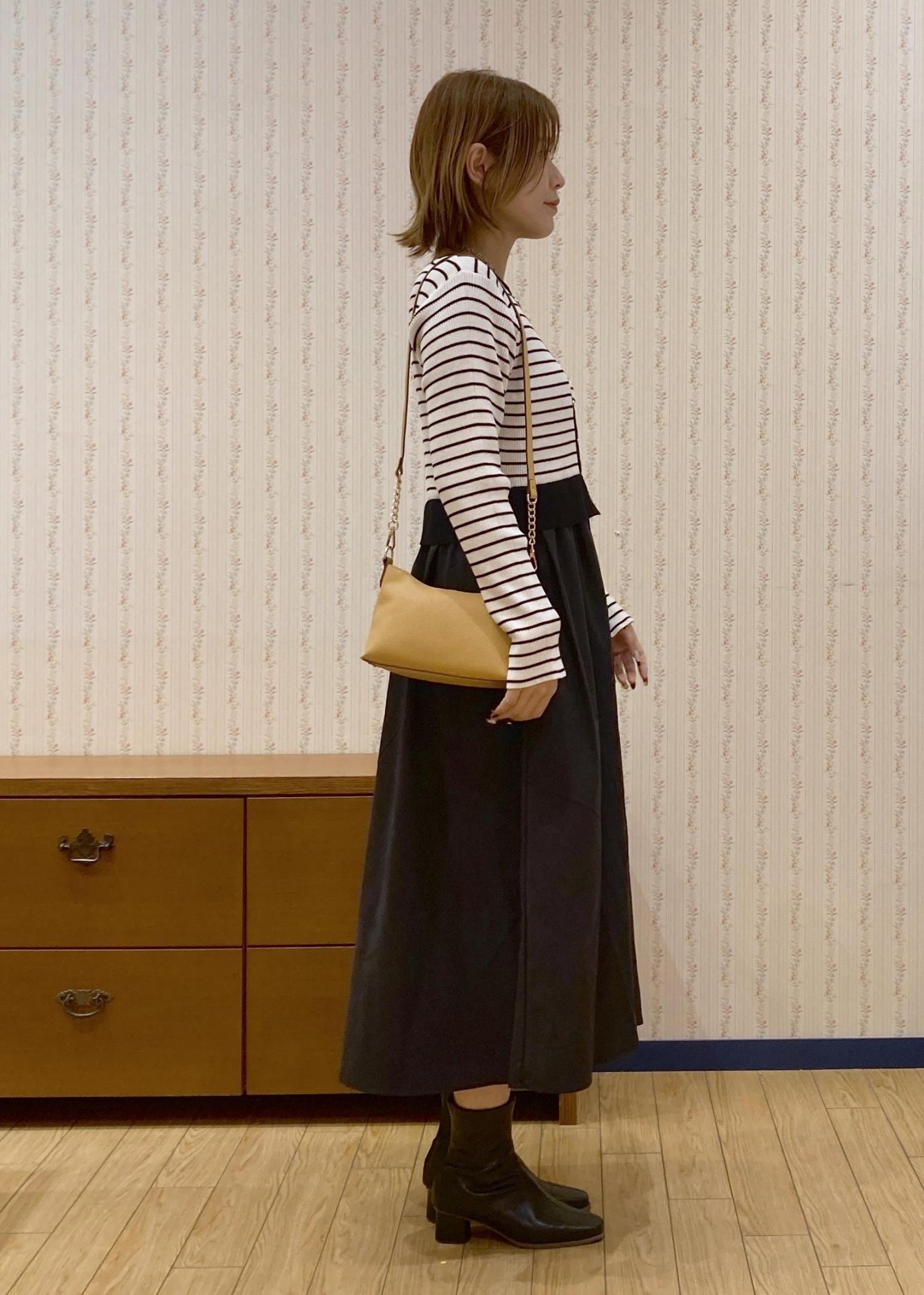 コーディネートが暗くならないようにイエローのミニバックで差し色をプラスしました!