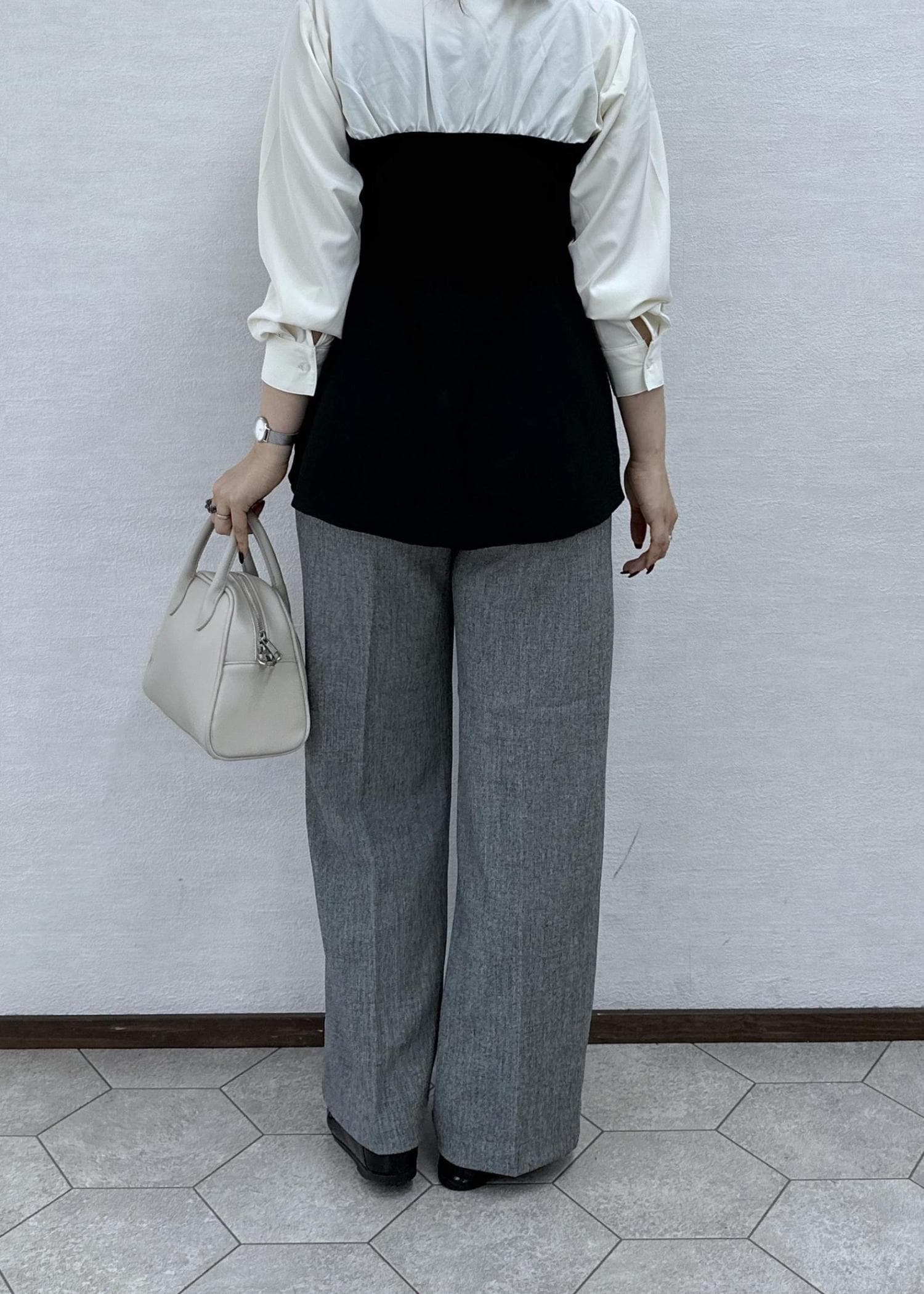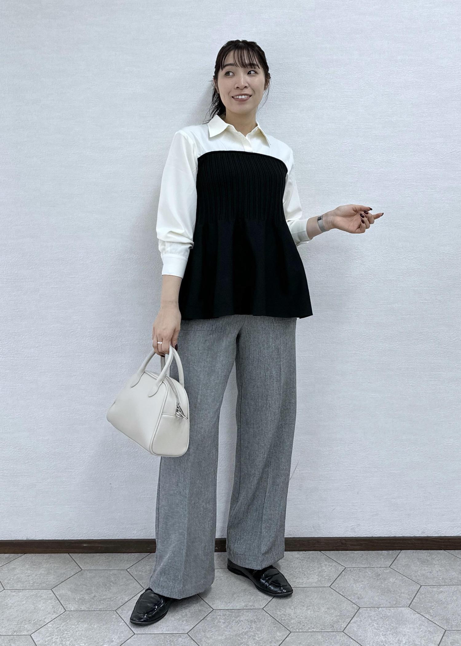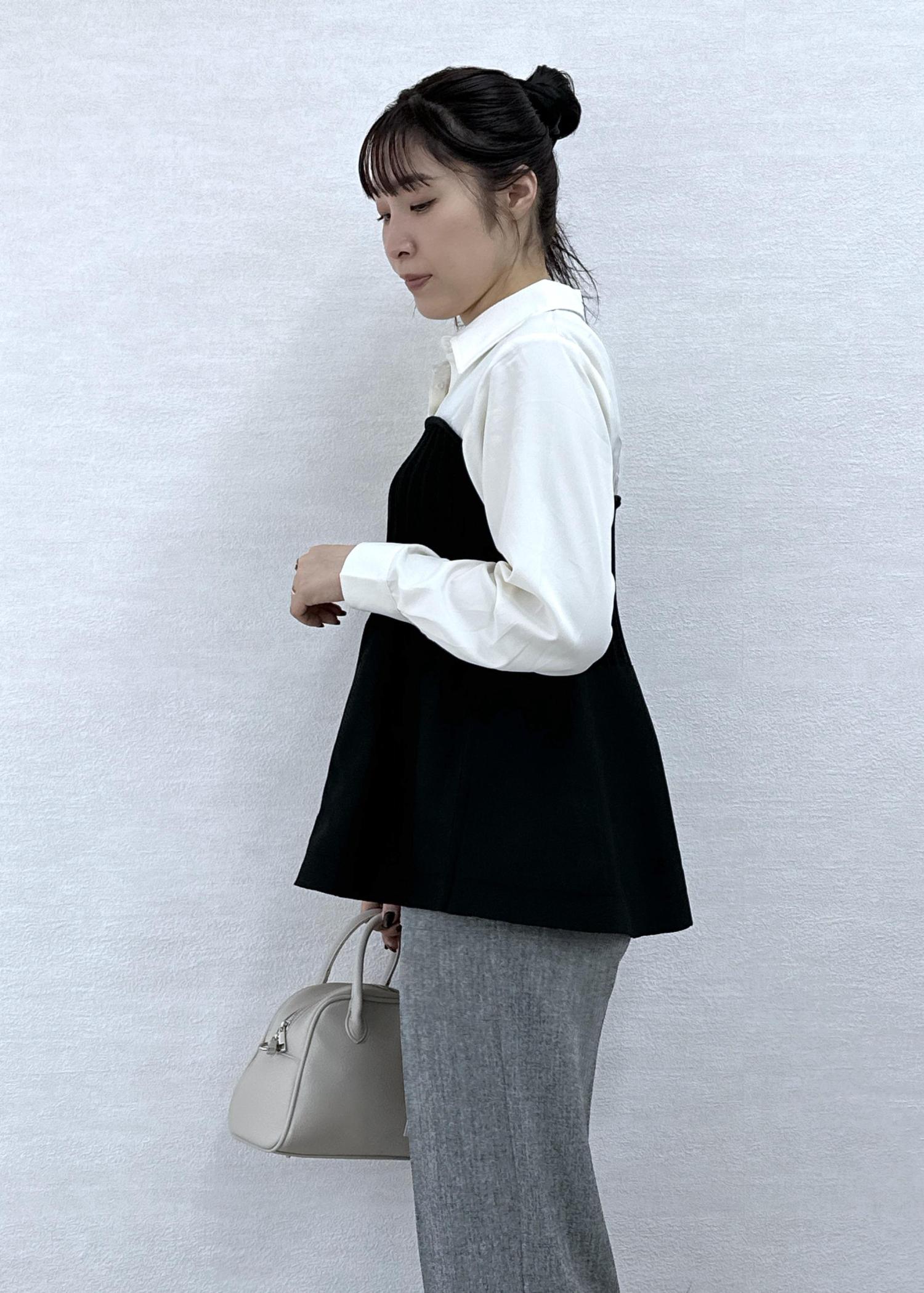 シャツ部分はクリーム色ぽい柔らかなカラーでニット部分がブラックなのでメリハリのあるスッキリとした印象に。