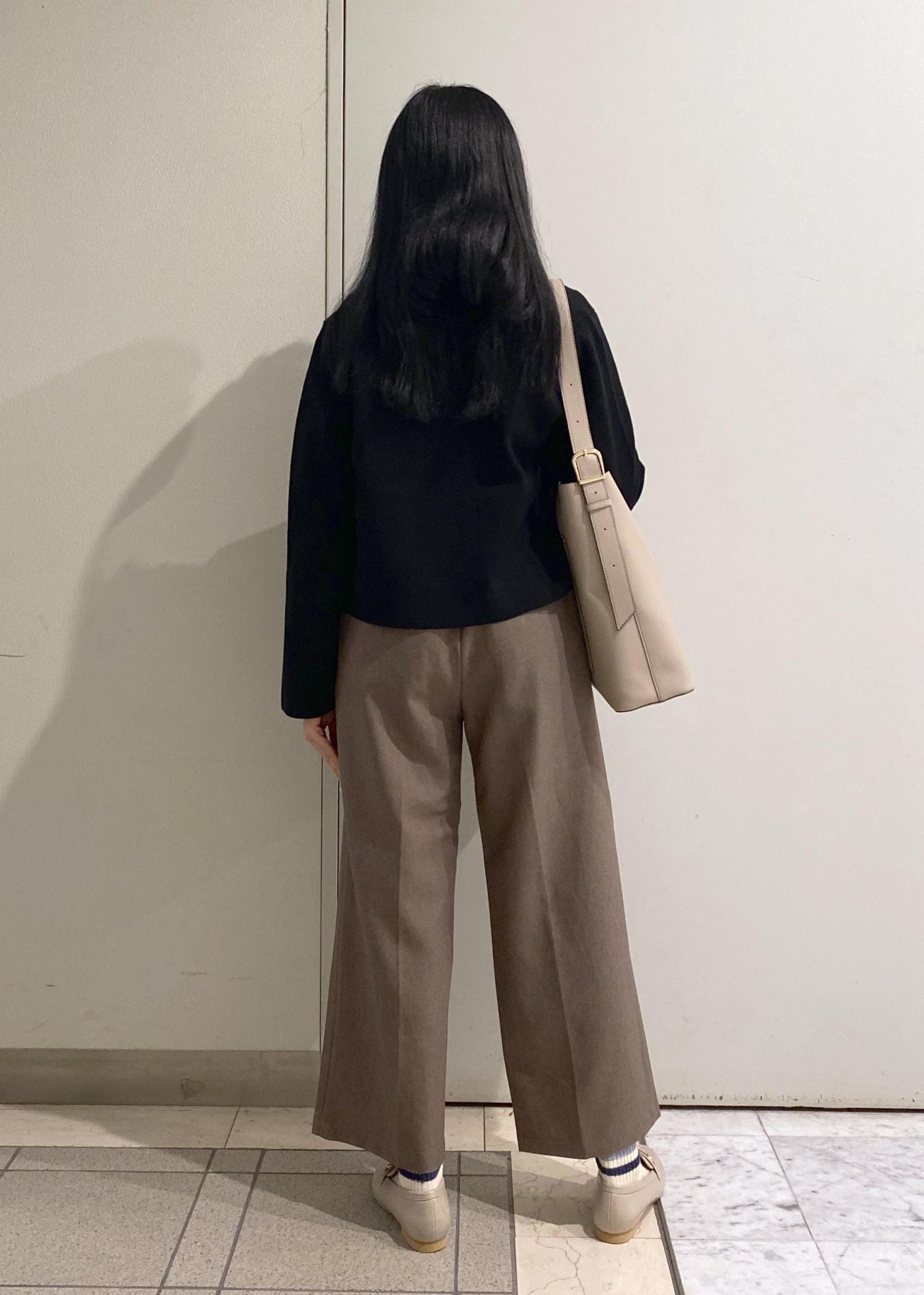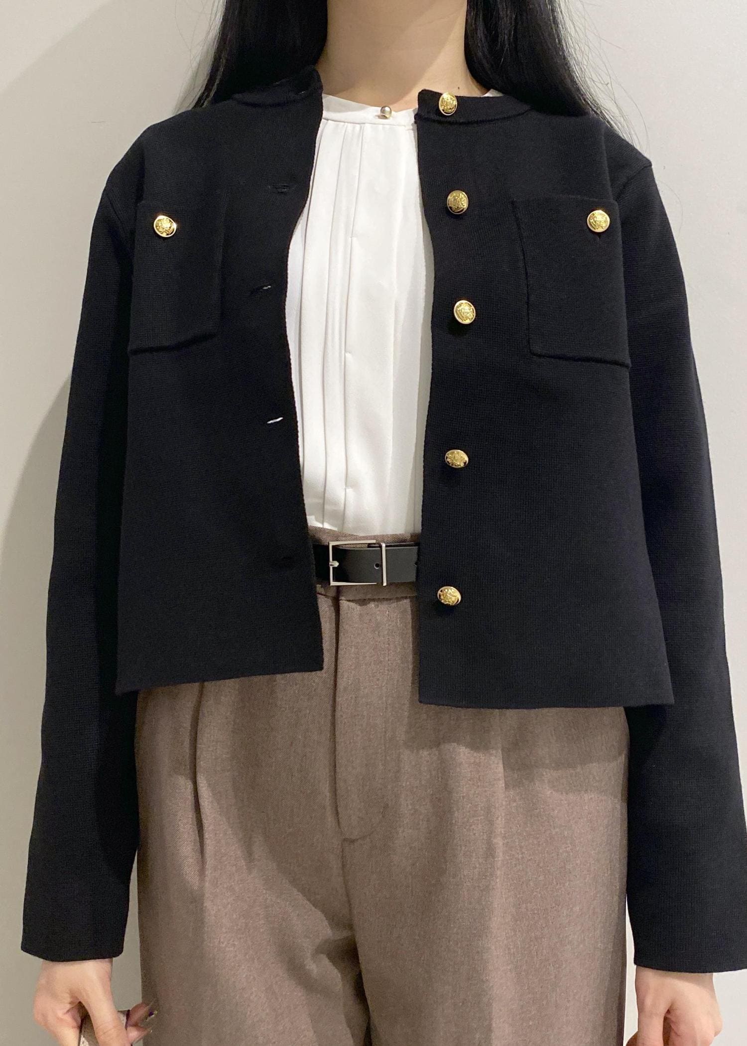 カーディガンは肉厚な生地と金ボタンがジャケットライクな印象になるので、きれいめなコーディネートにもぴったり!