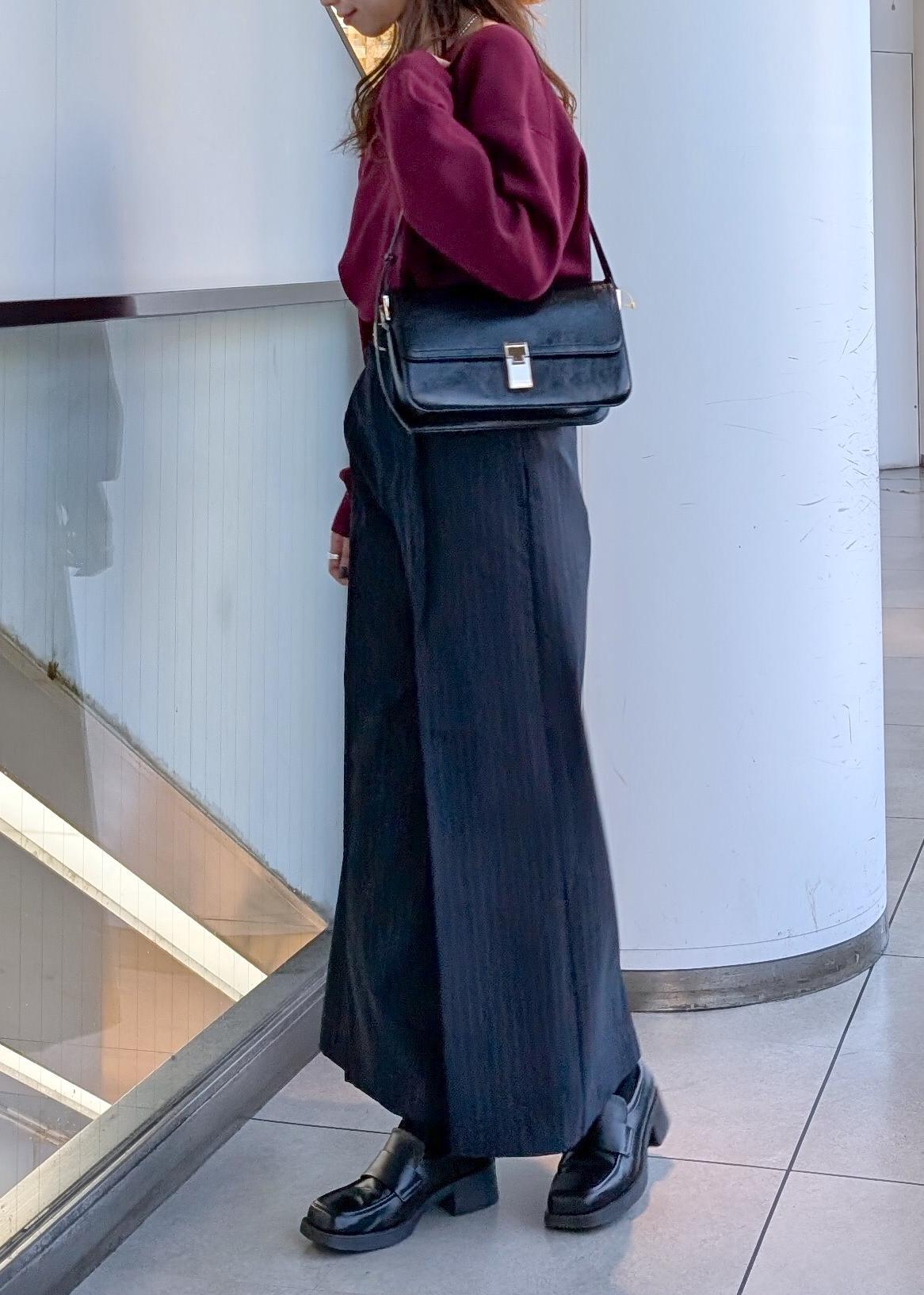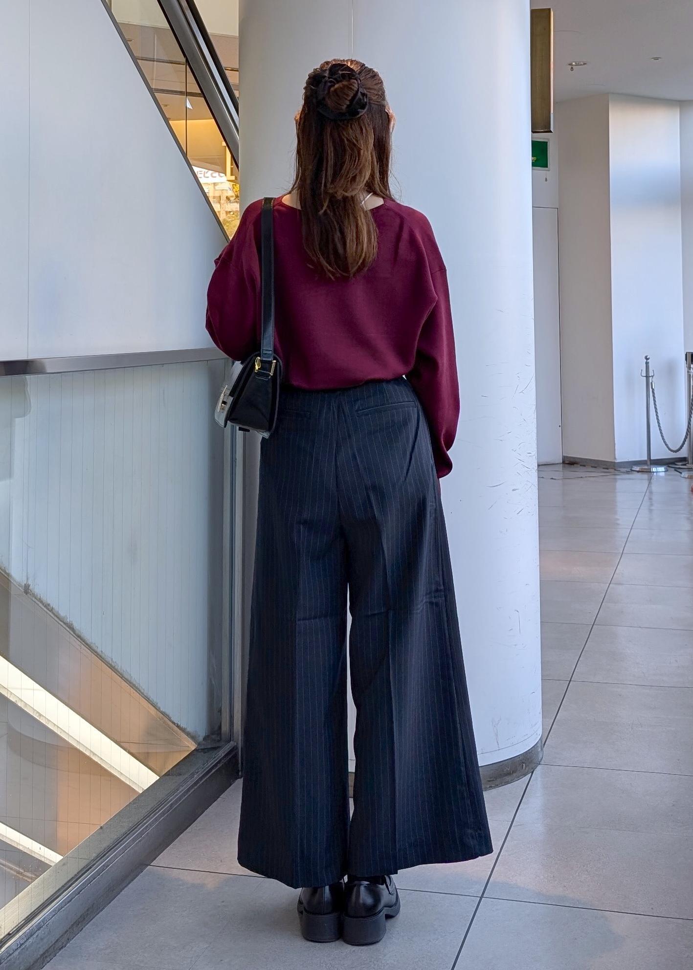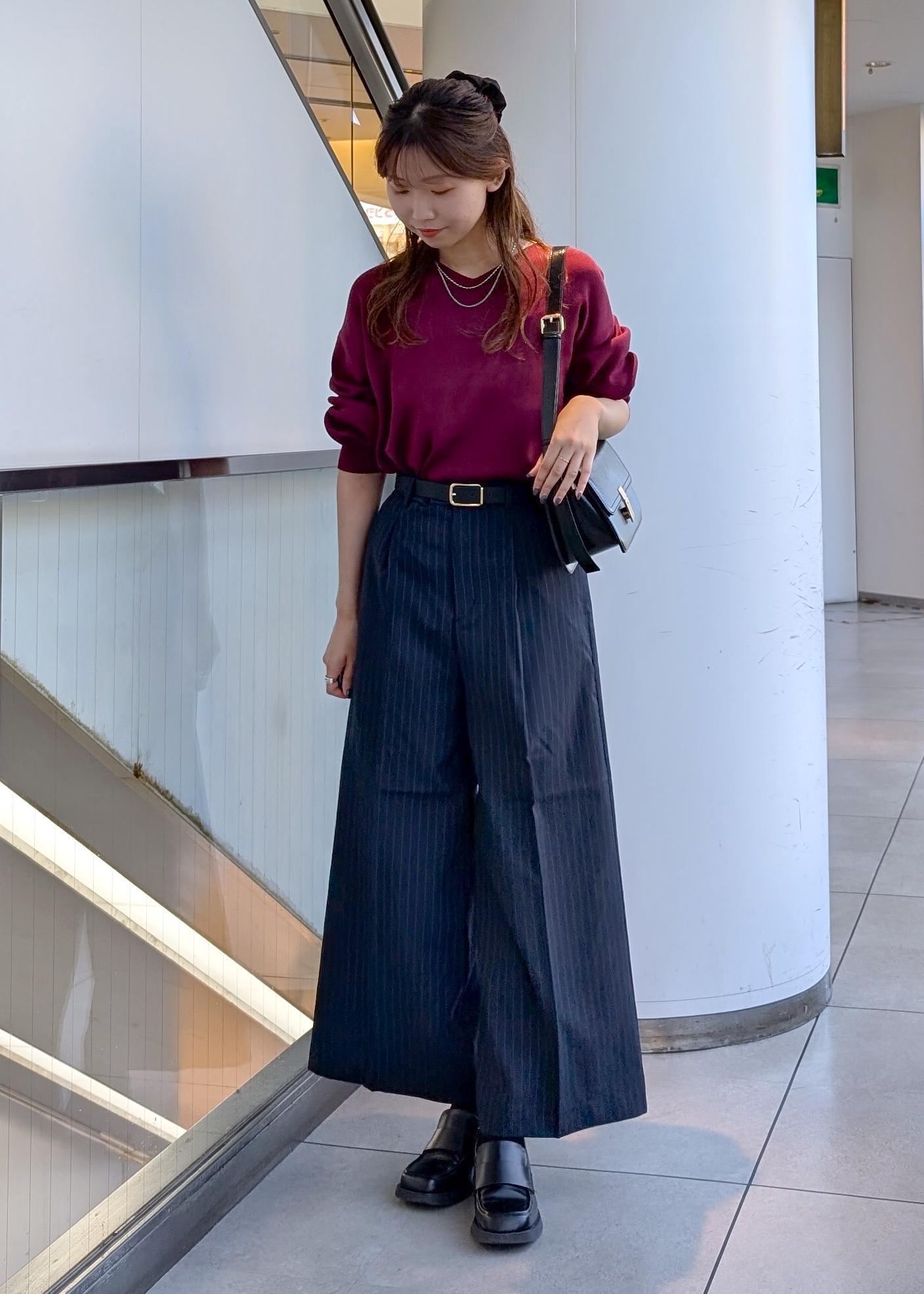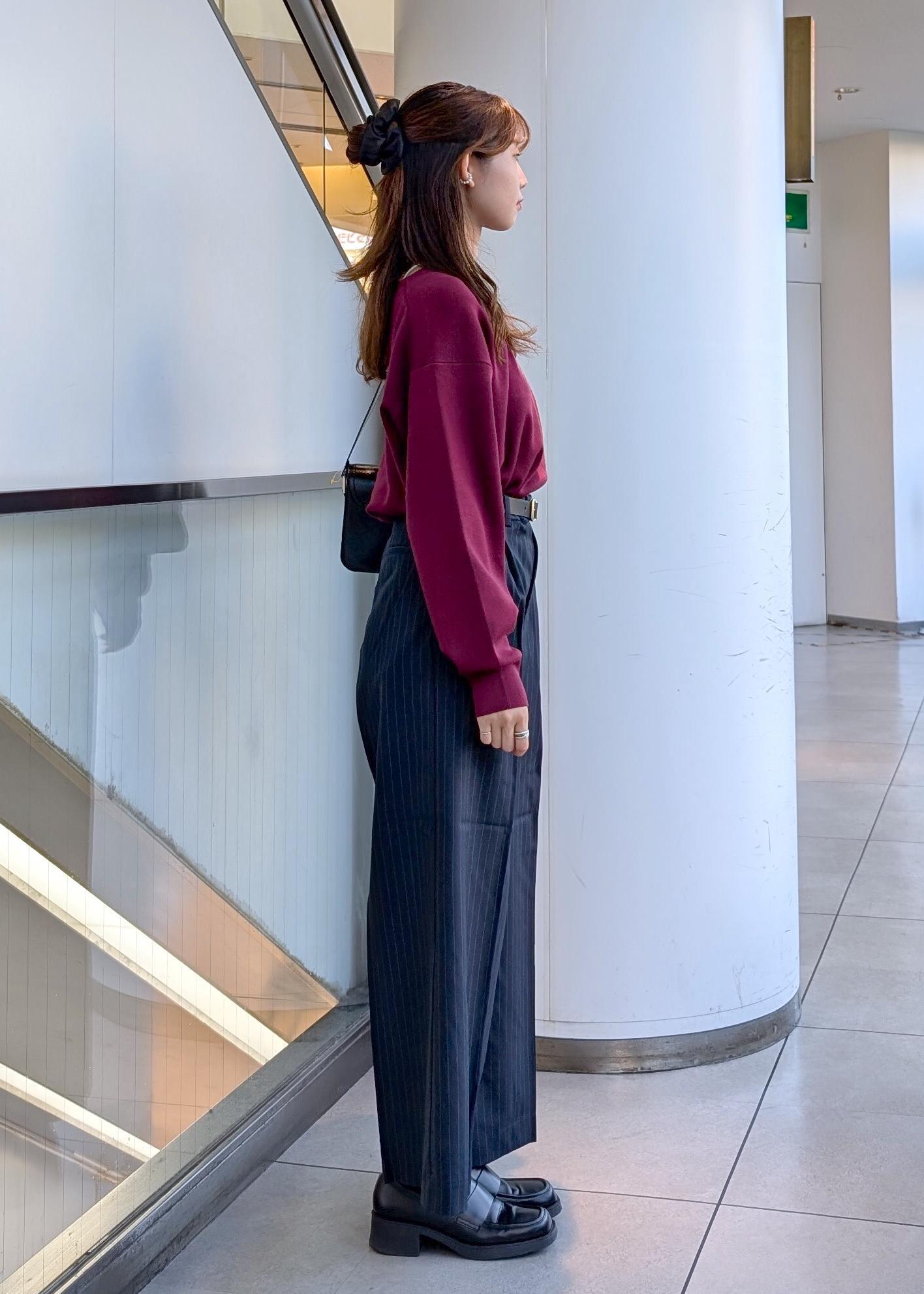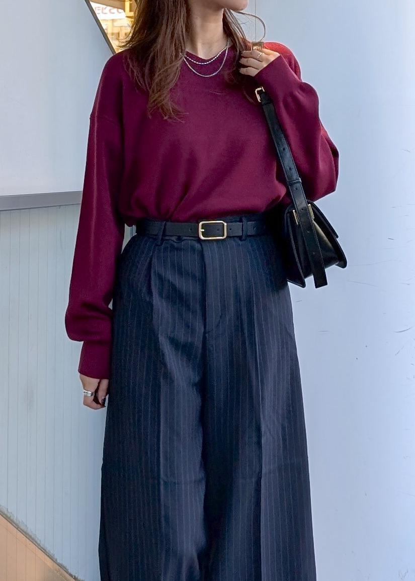 ロペピクニック秋冬定番のマシュマロニット。柔らかい手触りの生地とゆとりのあるサイズ感です。今回はシックなボルドーにネイビーのパンツを合わせてキレイめなスタイリングにしました。