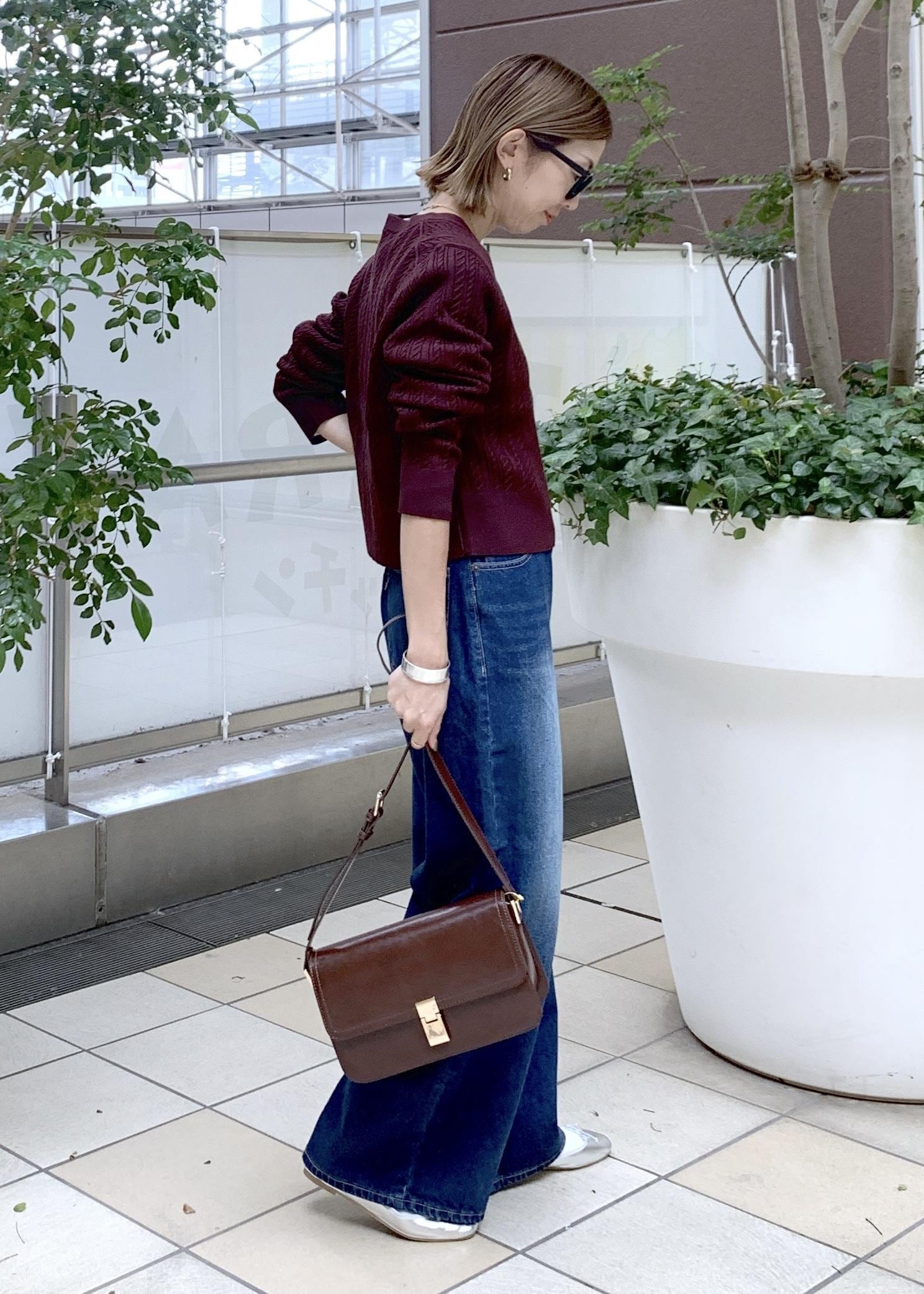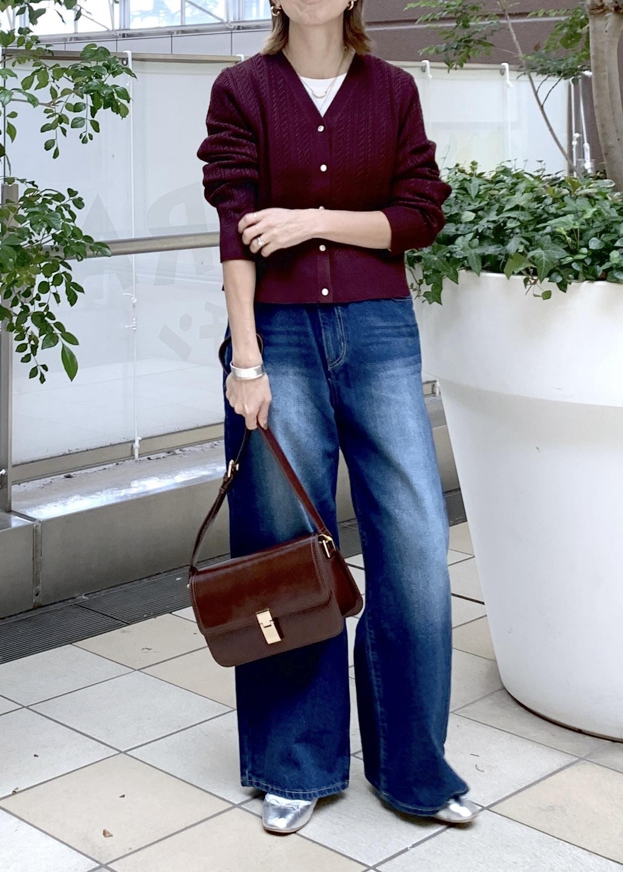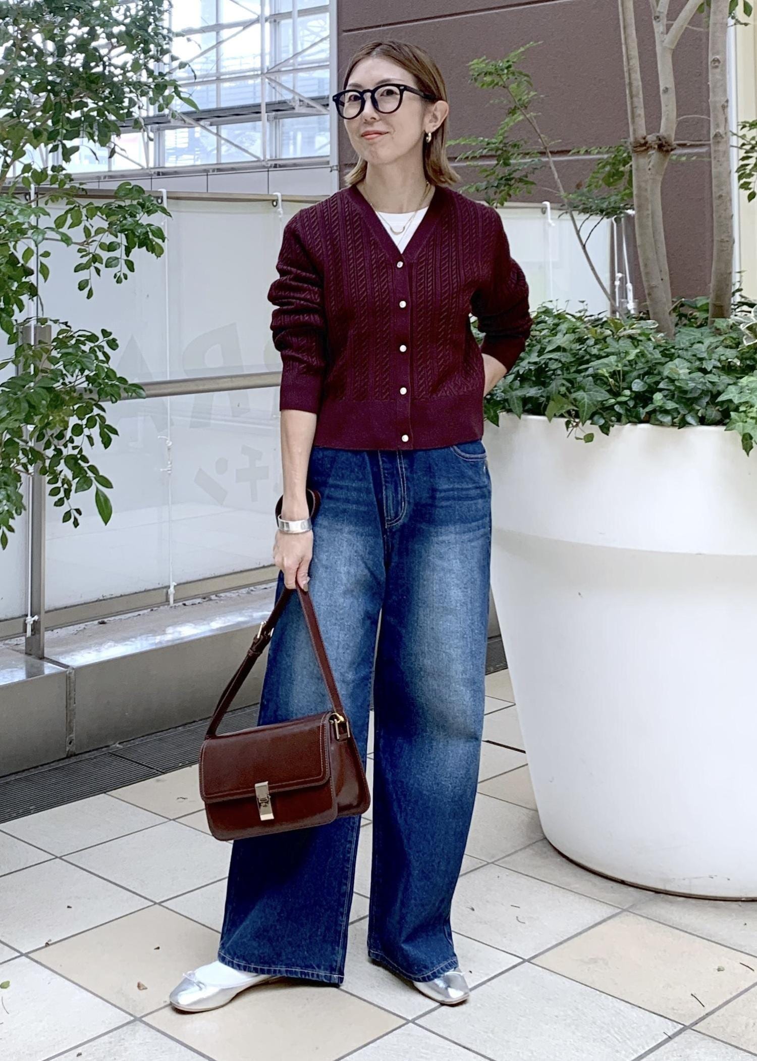 秋口にちょうど良く着られるミニケーブルカーディガン。