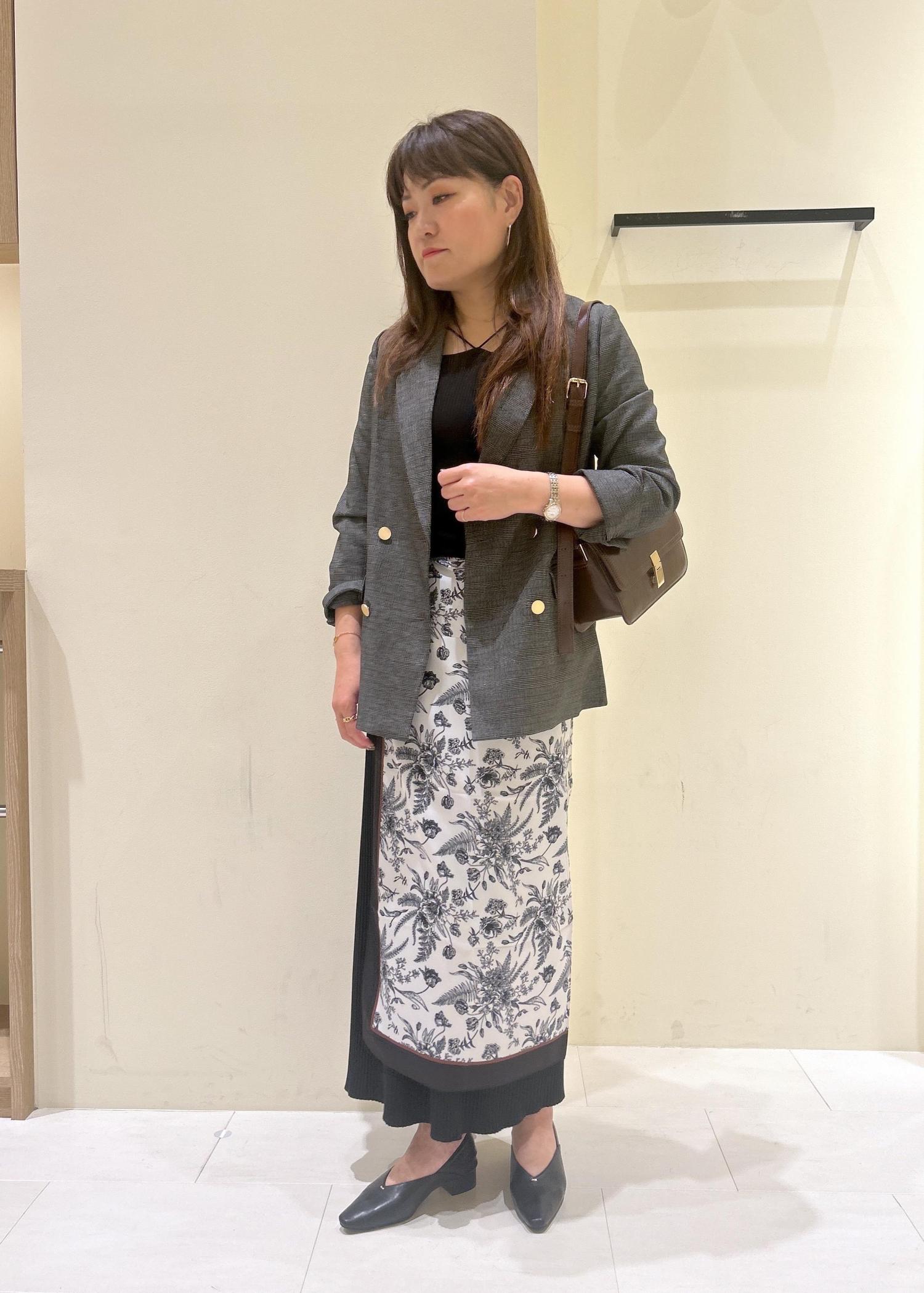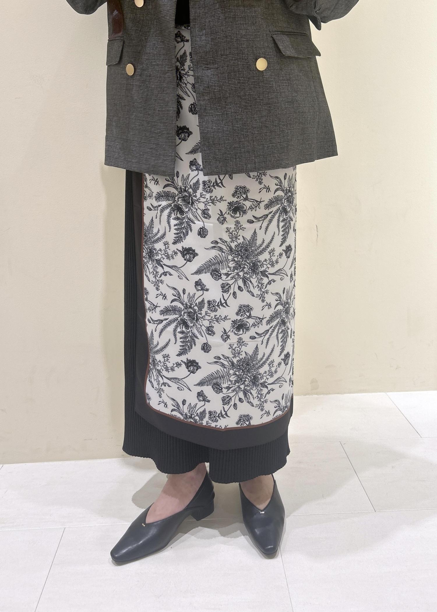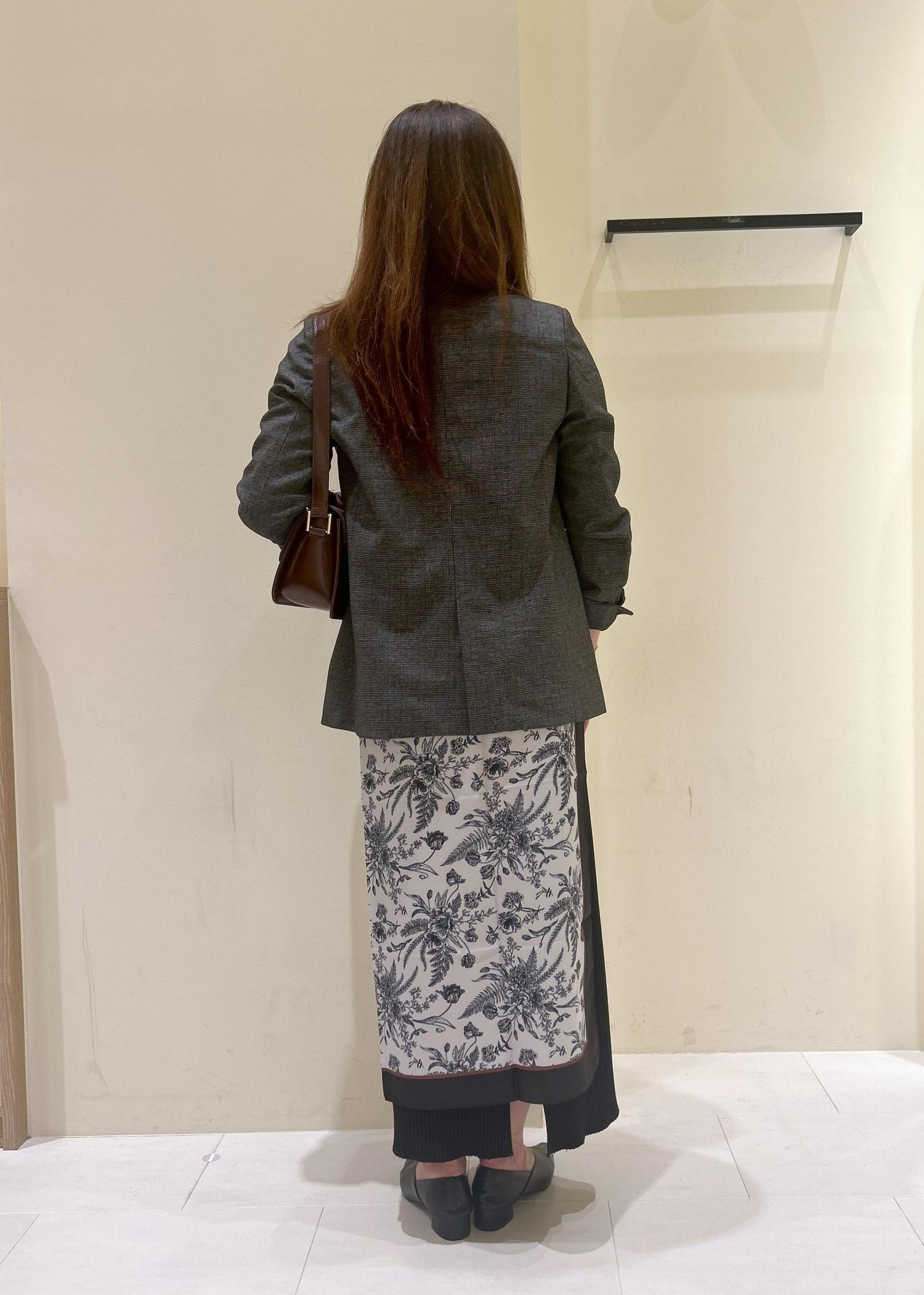 着丈の選べるオーバーサイズのチェック柄ジャケットにタイトスカートを合わせて、アクセントに総柄の大判スカーフを腰巻きにしてみました。