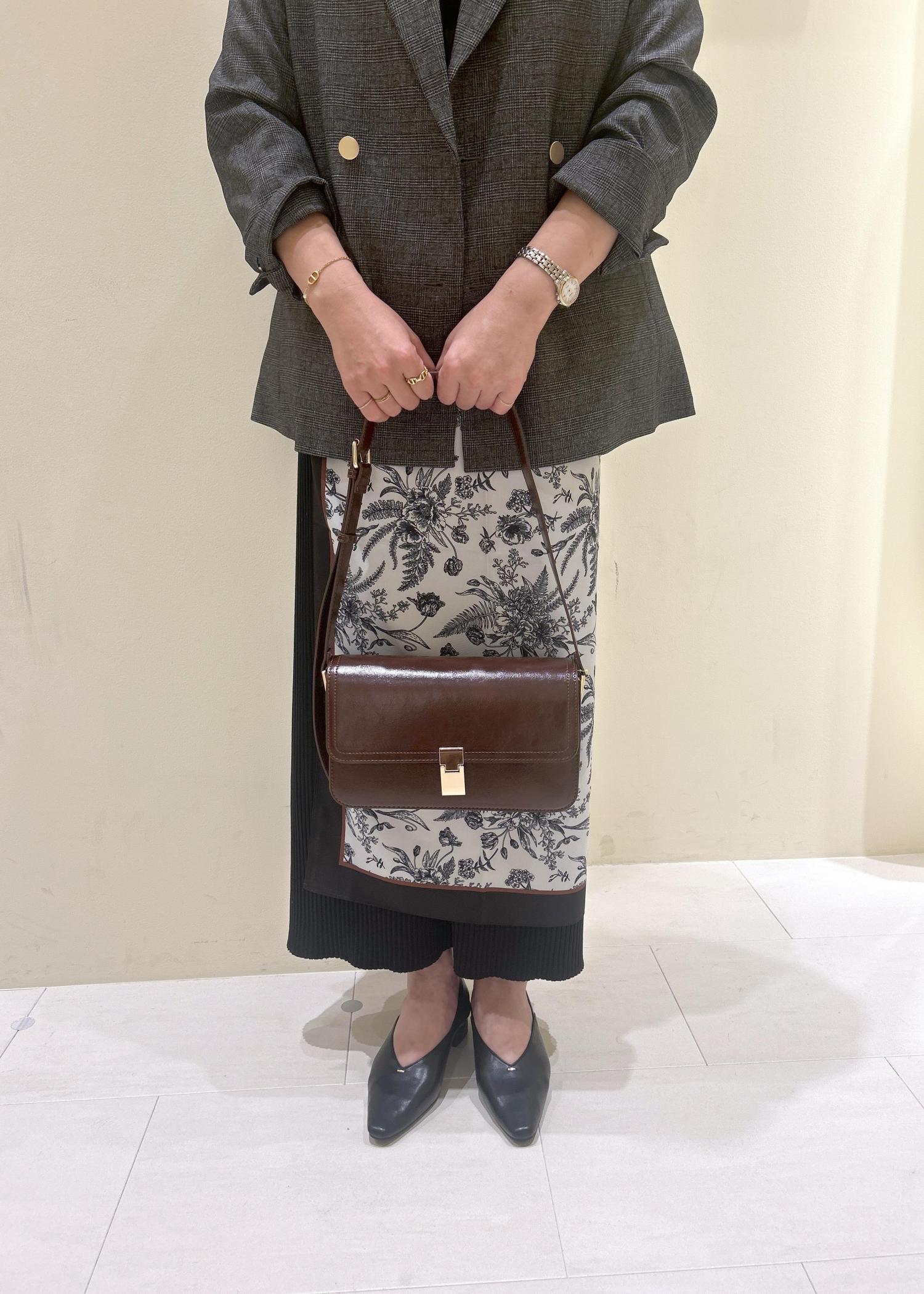 小物は秋らしくブラウンのバッグ合わせで。