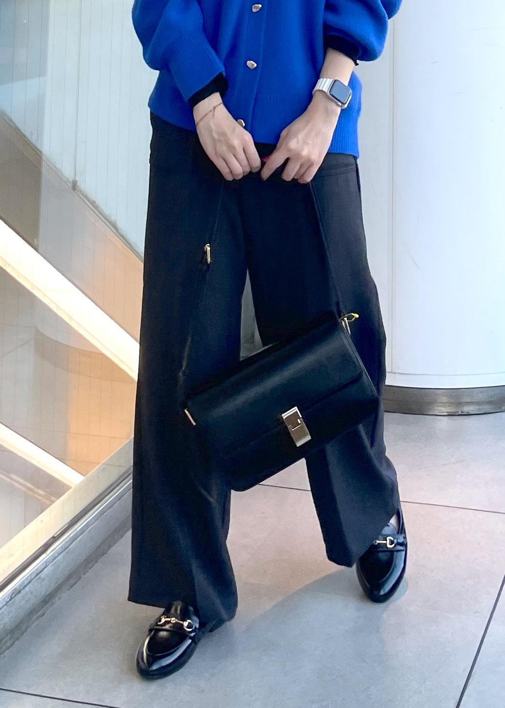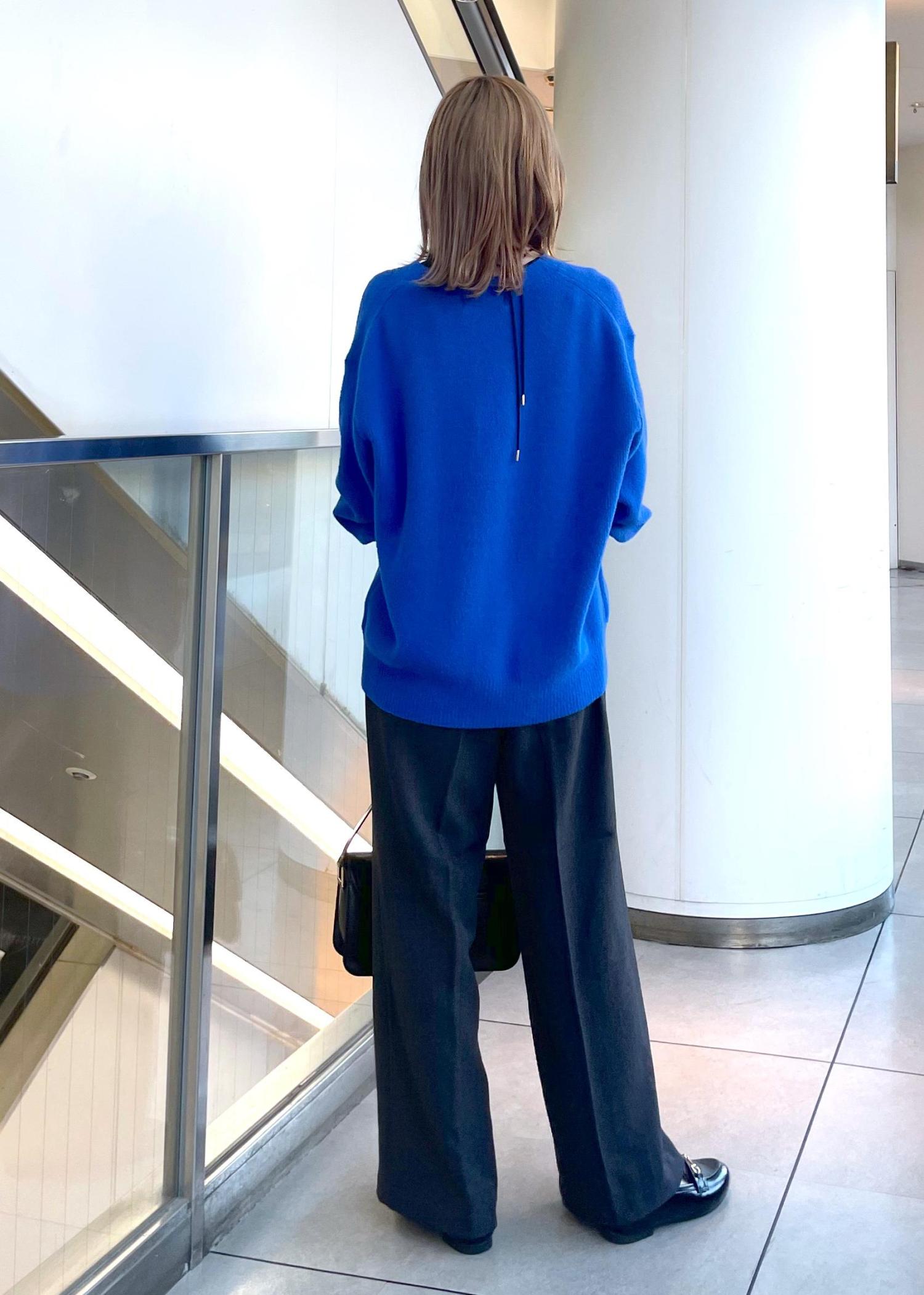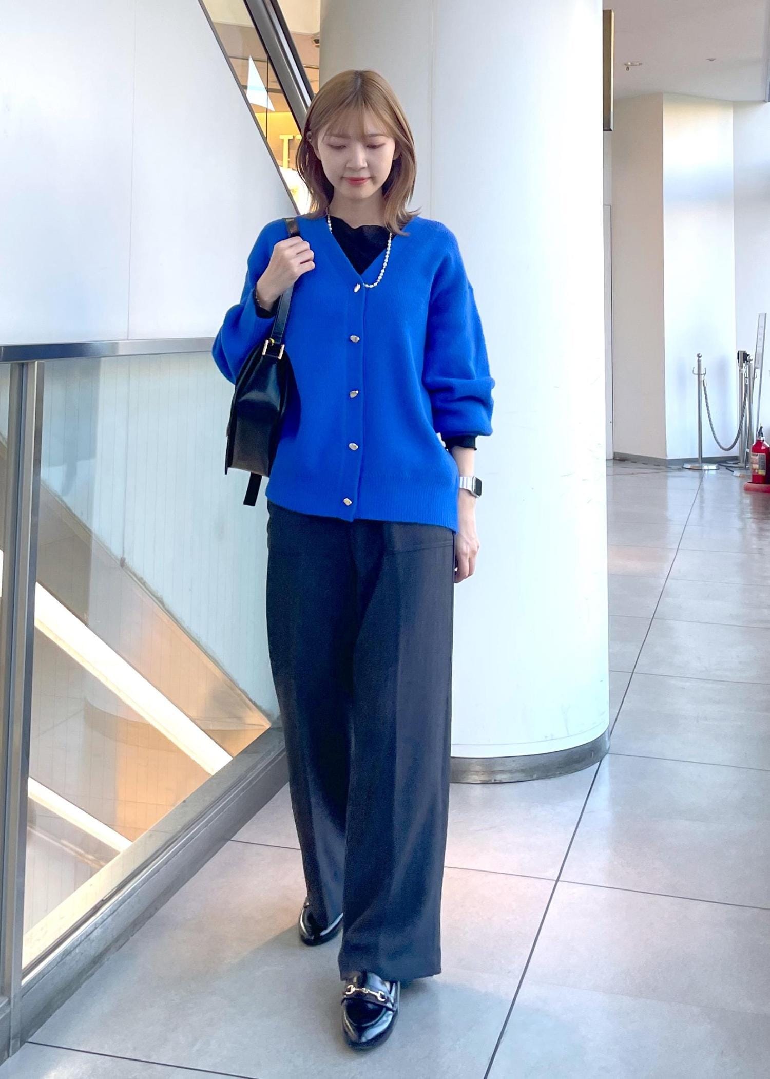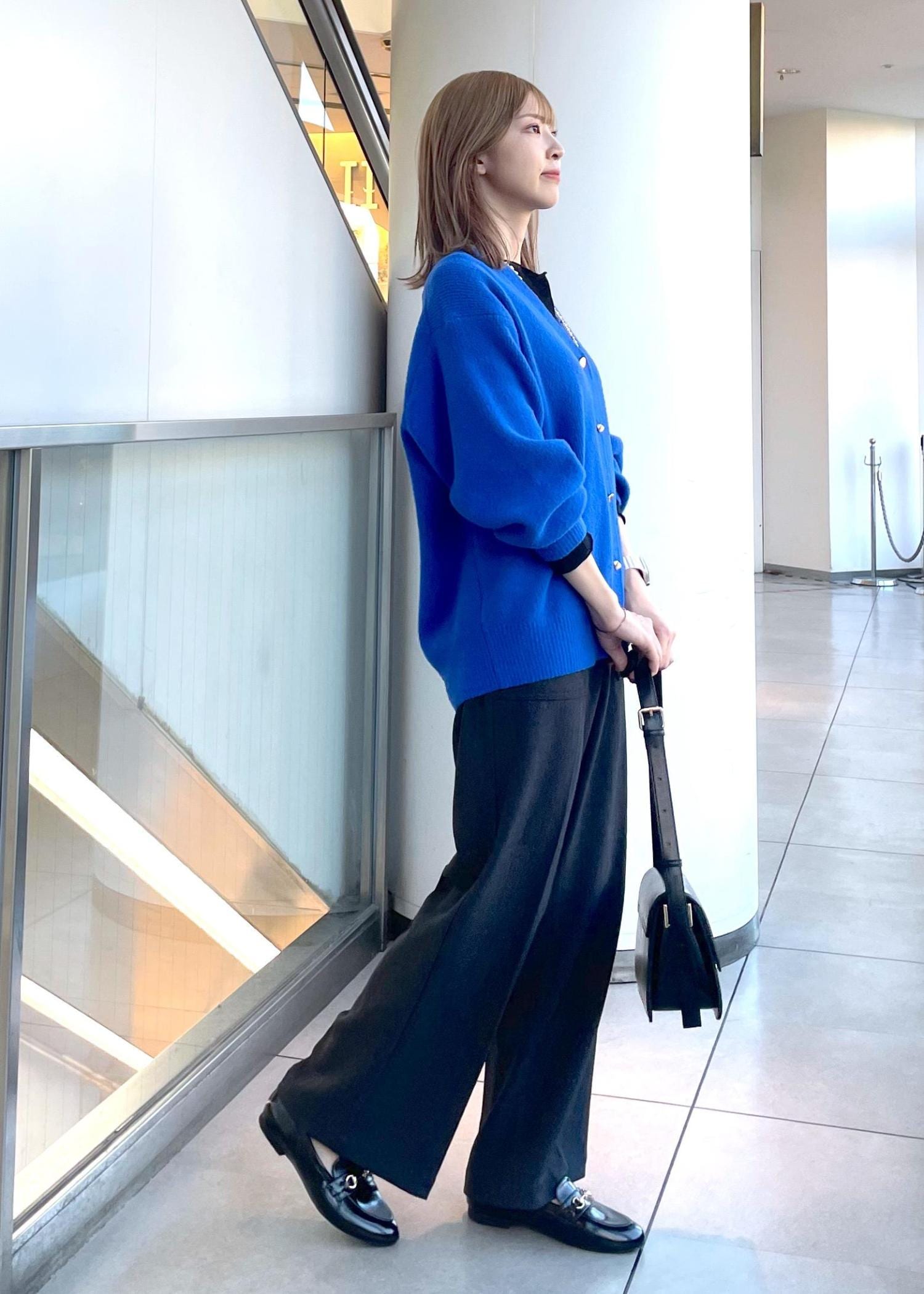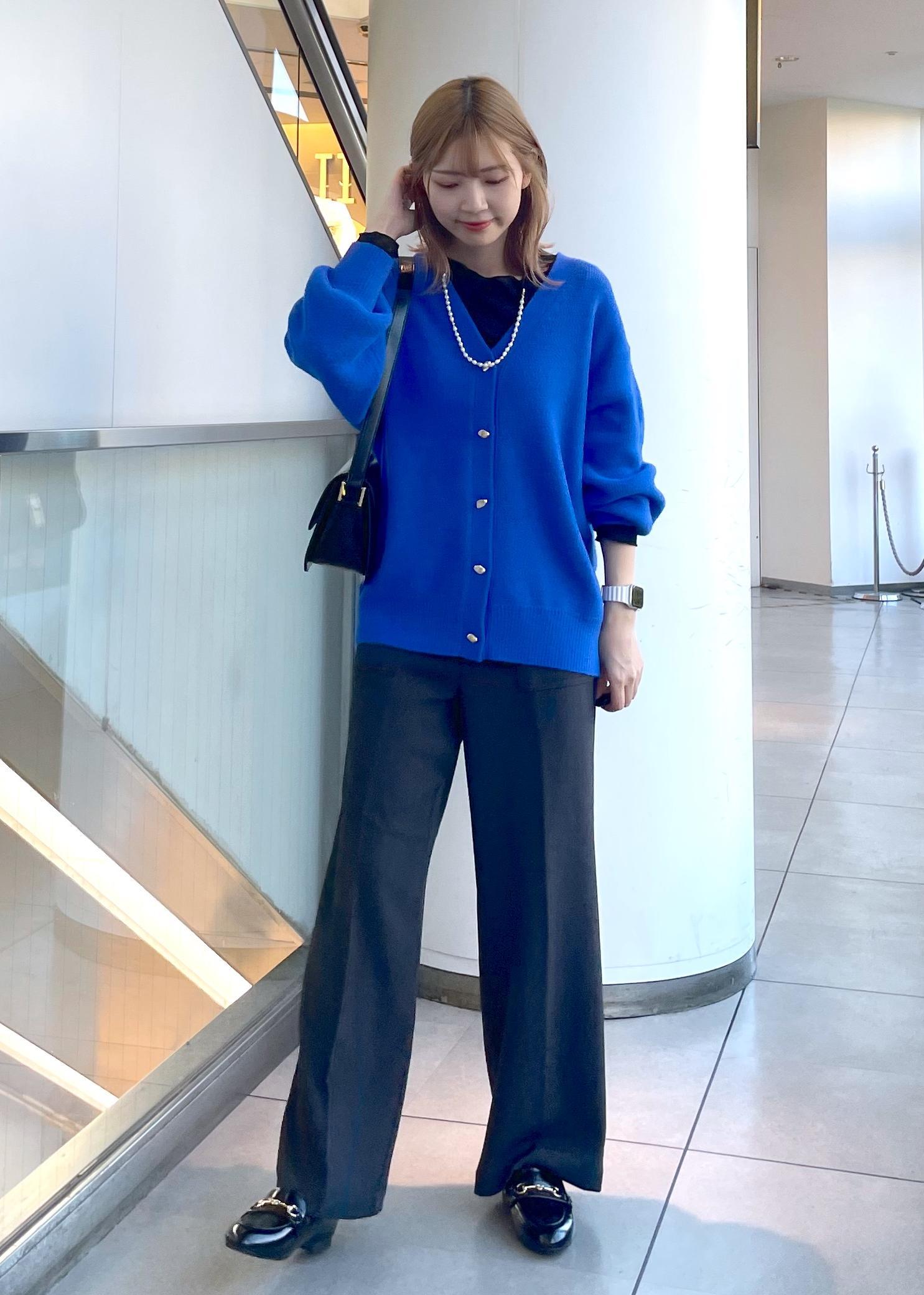 ビビッドカラーのブルーを使いましたが、落ち着いたカジュアルすぎない大人コーデにしました。ボトムスをグレーにすることでコントラストがハッキリしすぎず、ブルーのカーディガンが柔らかく見えます。