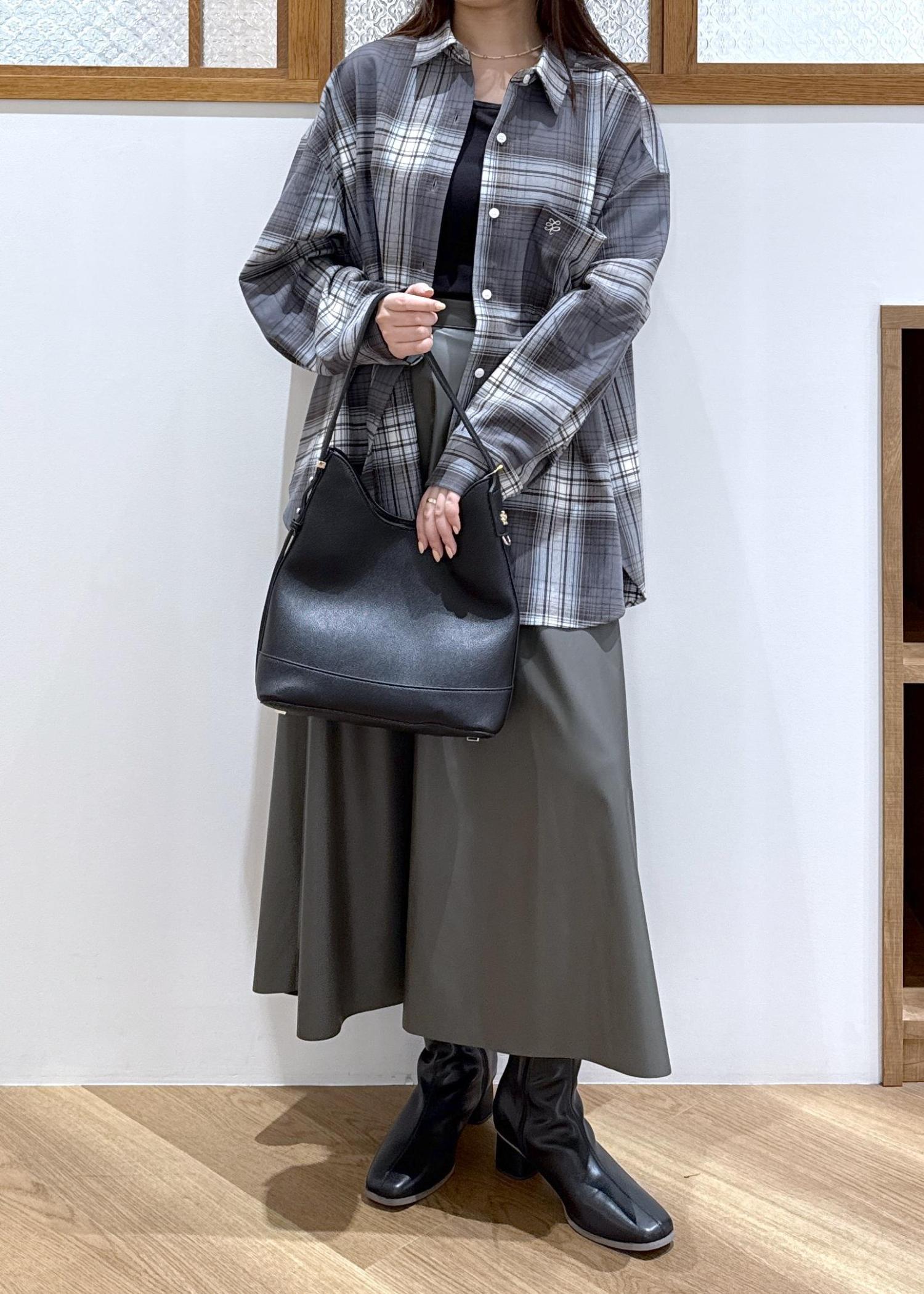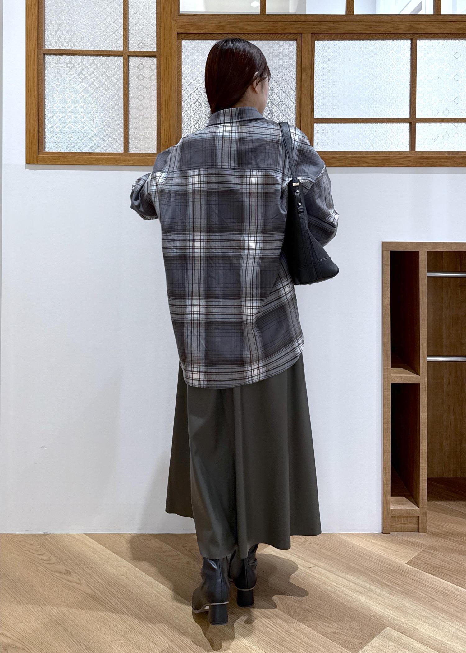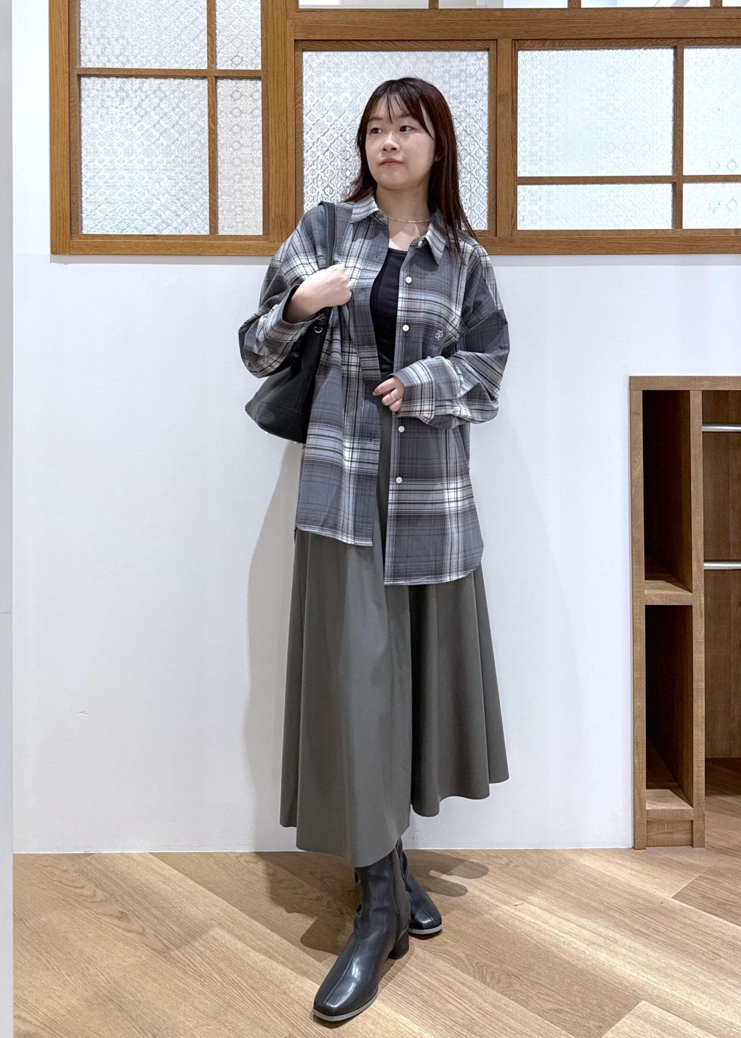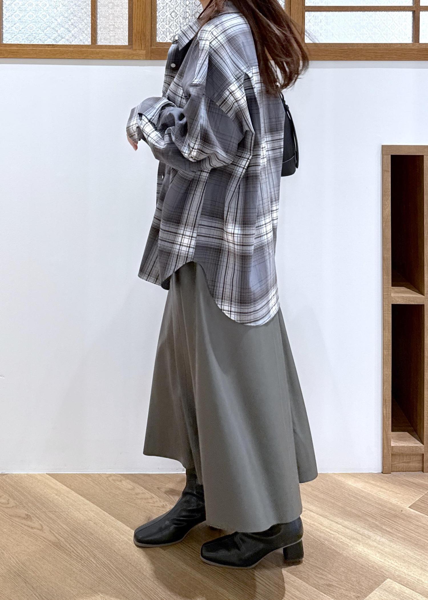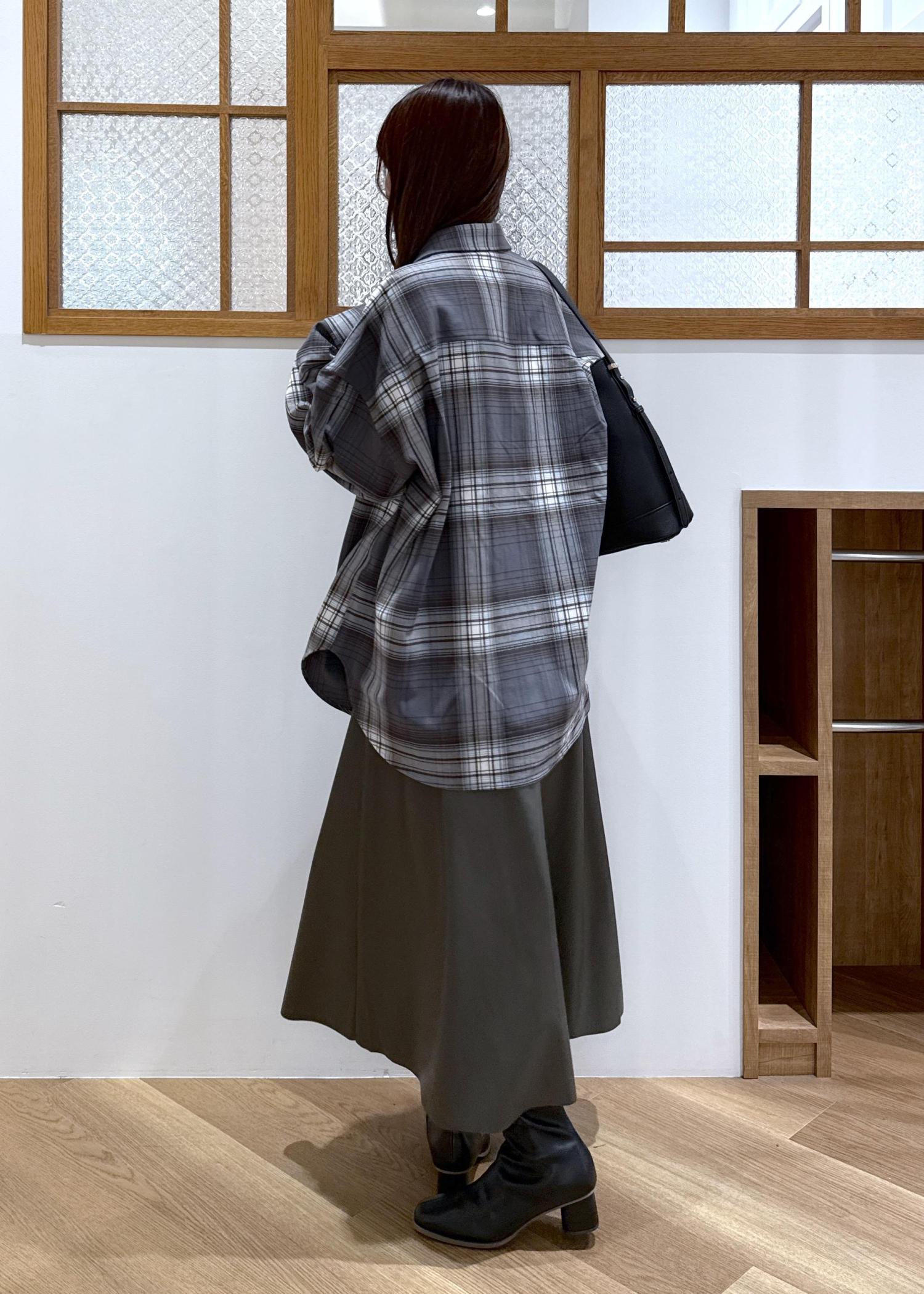 グレーとブルーベースのチェックにカーキのスカートを合わせた個性的な組み合わせが目を惹くスタイリング。