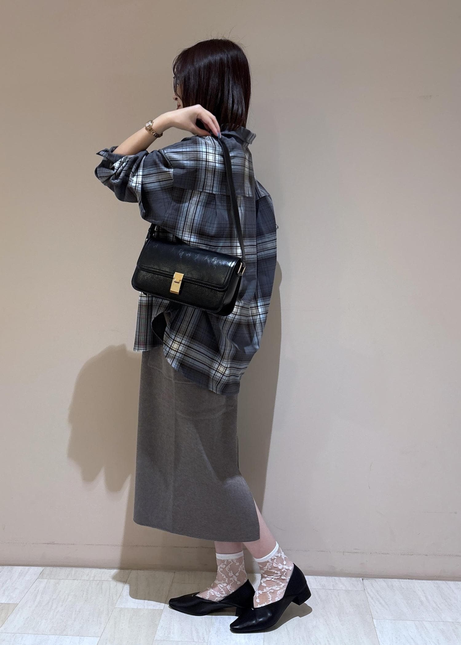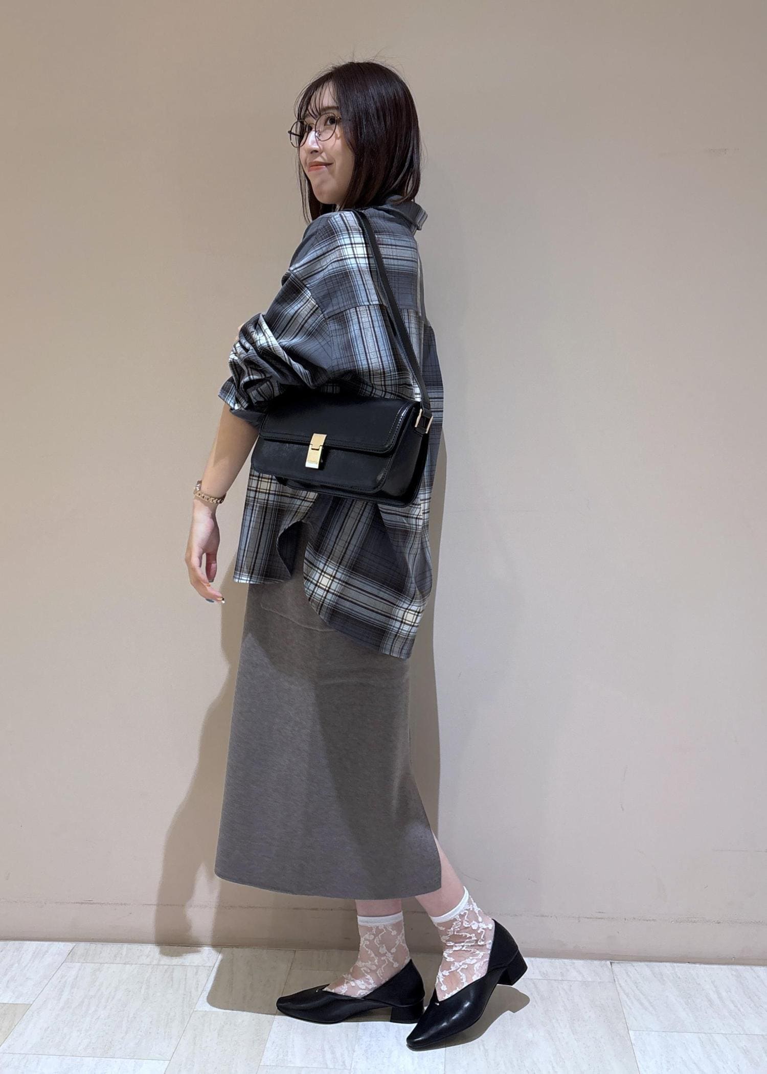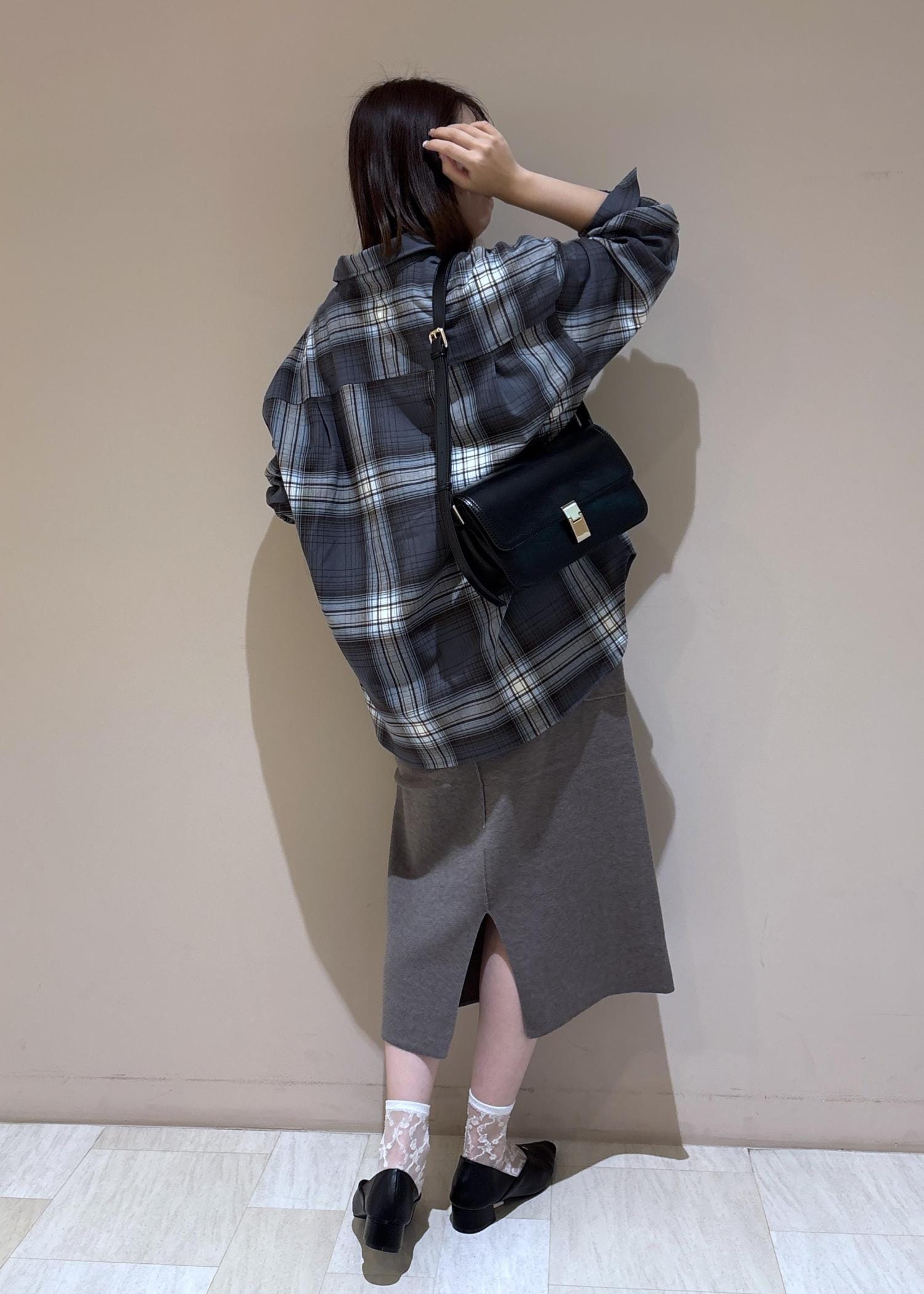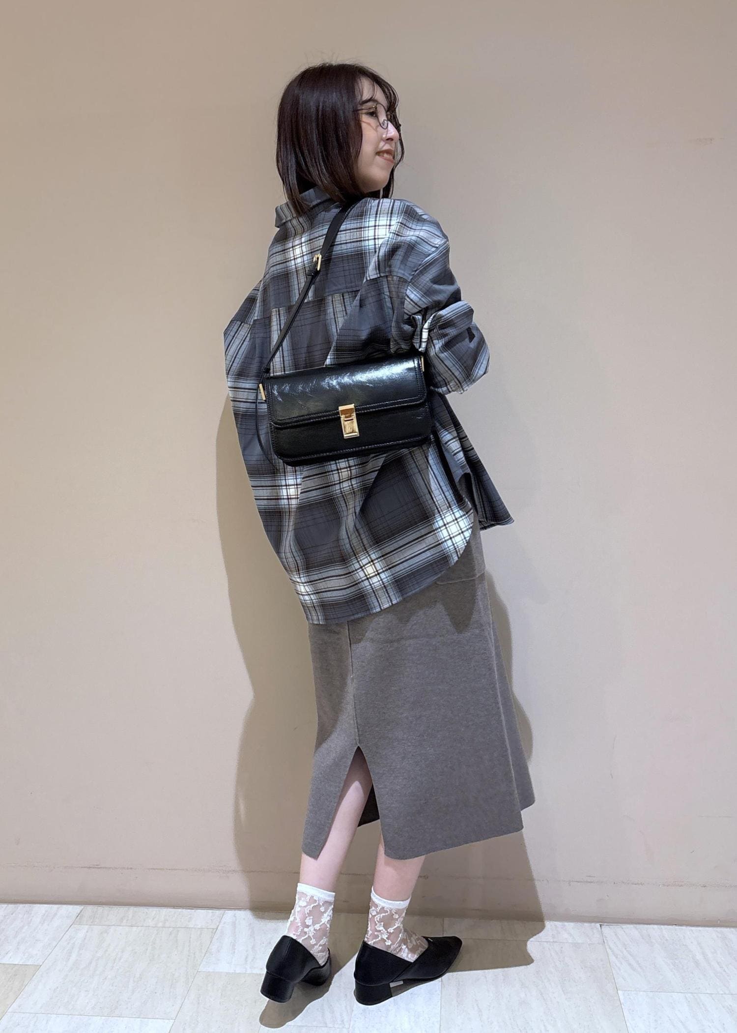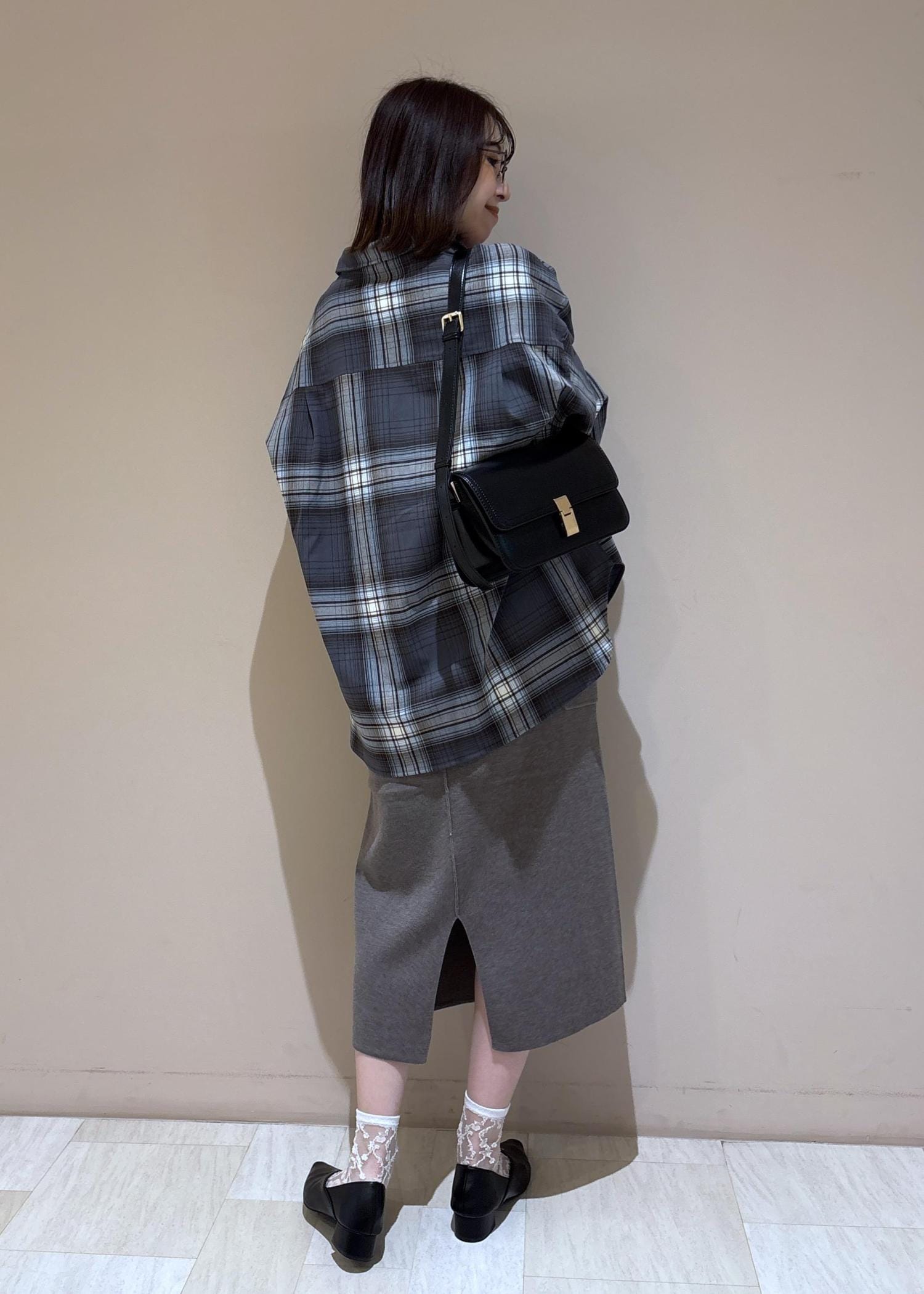 ニットジャンスカにチェックシャツを合わせた大人カジュアルコーデ。