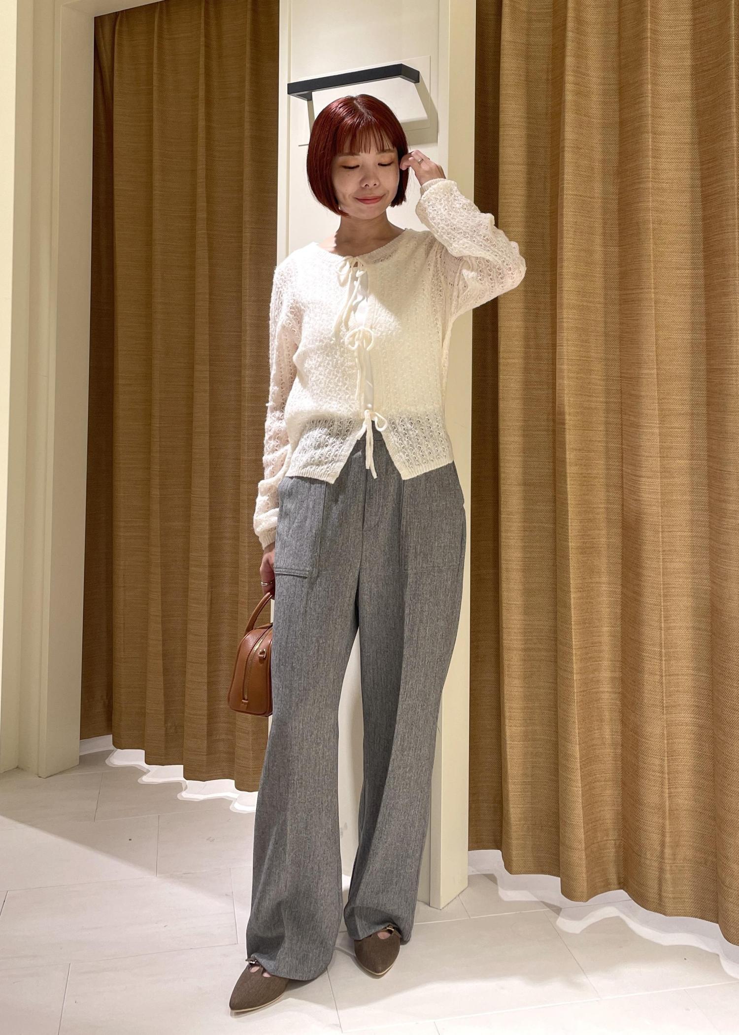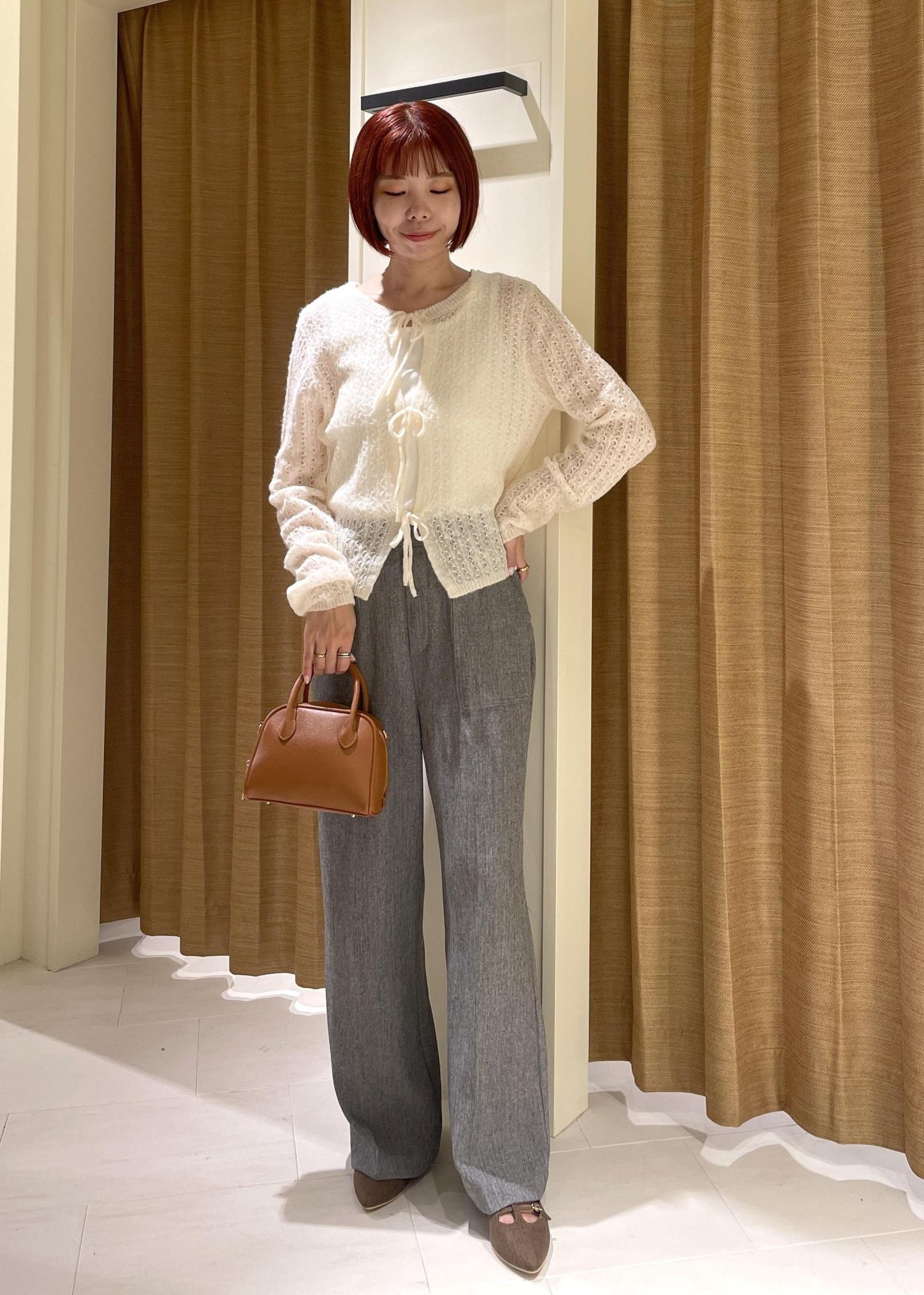レース編みのニットカーディガンにワイドパンツを合わせた秋のカジュアルコーデ。