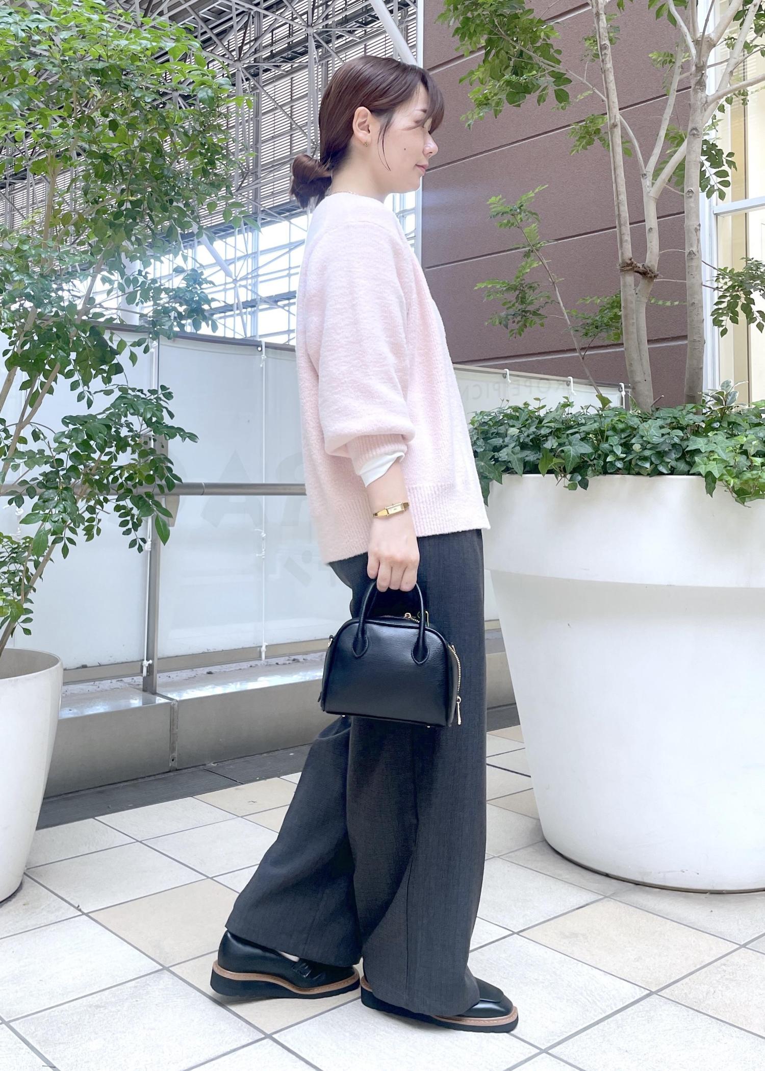 小物はブラックで統一して、ピンクが主役でも甘くなり過ぎない大人らしいカジュアルコーデにまとめました。