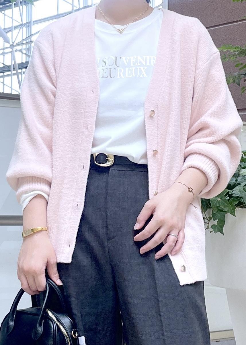 可愛らしいピンクのカーディガンが主役の秋コーデです。