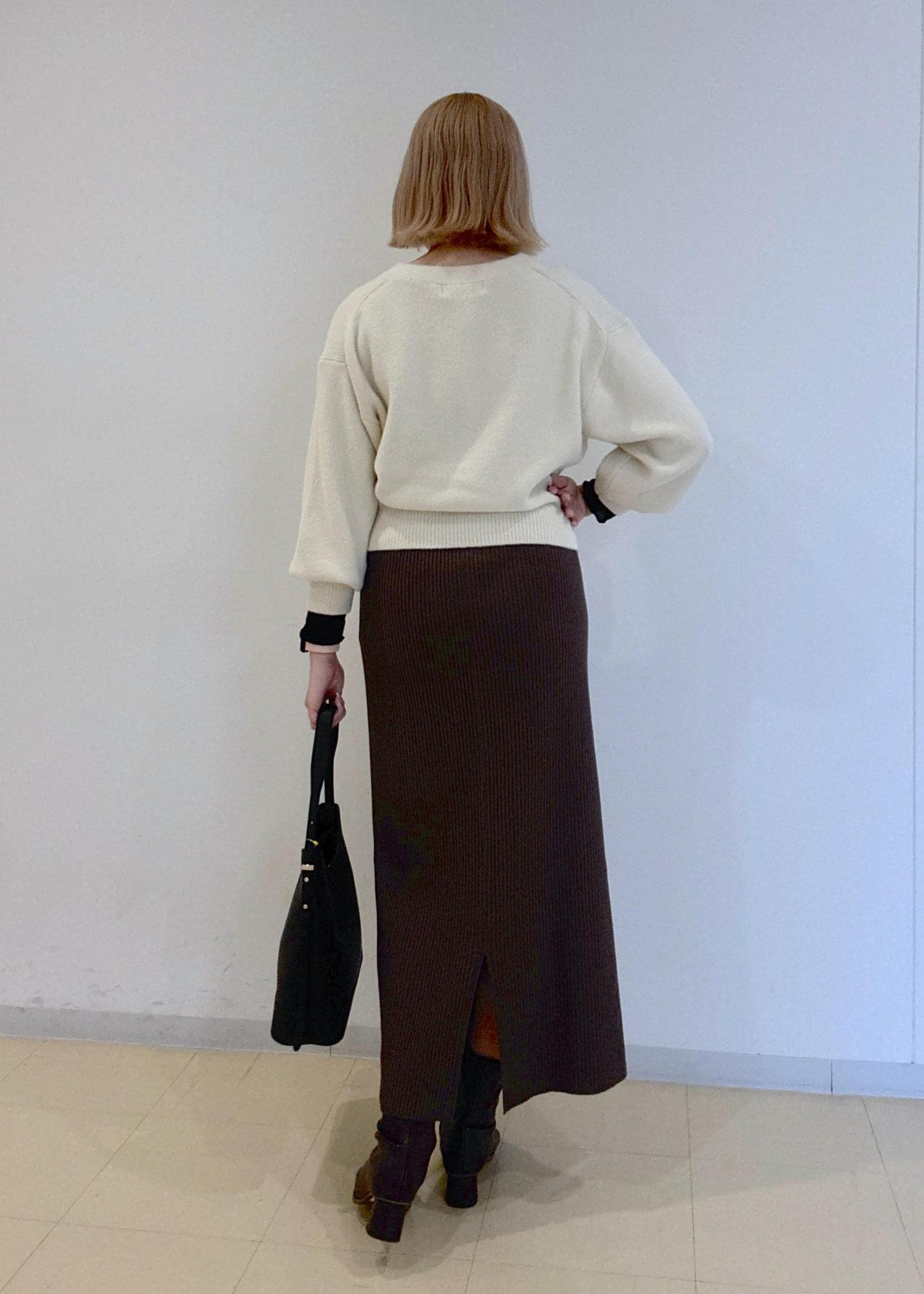 すっきりとしたアイラインのスカートですが、身体のラインを拾いにくい素材です◎