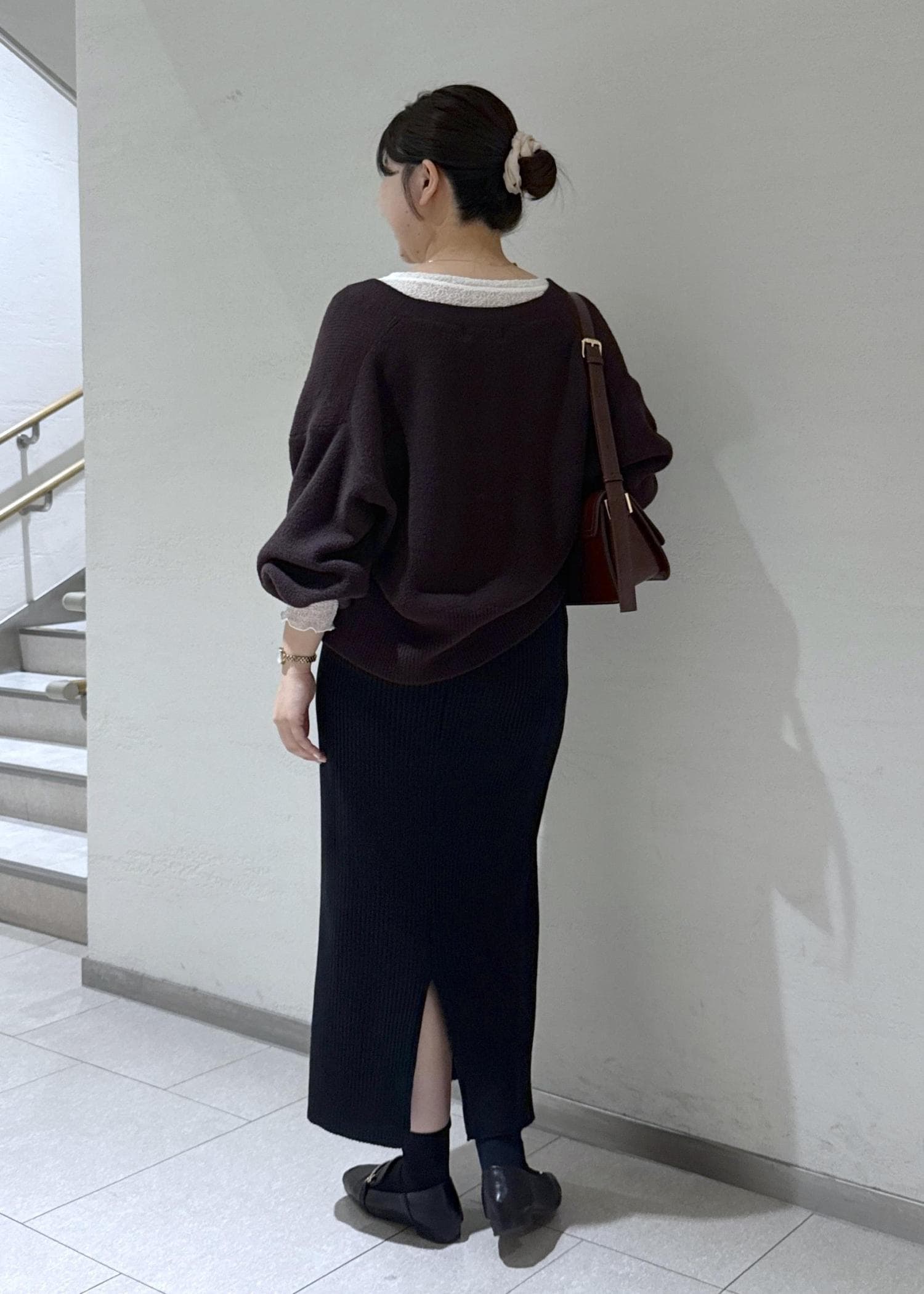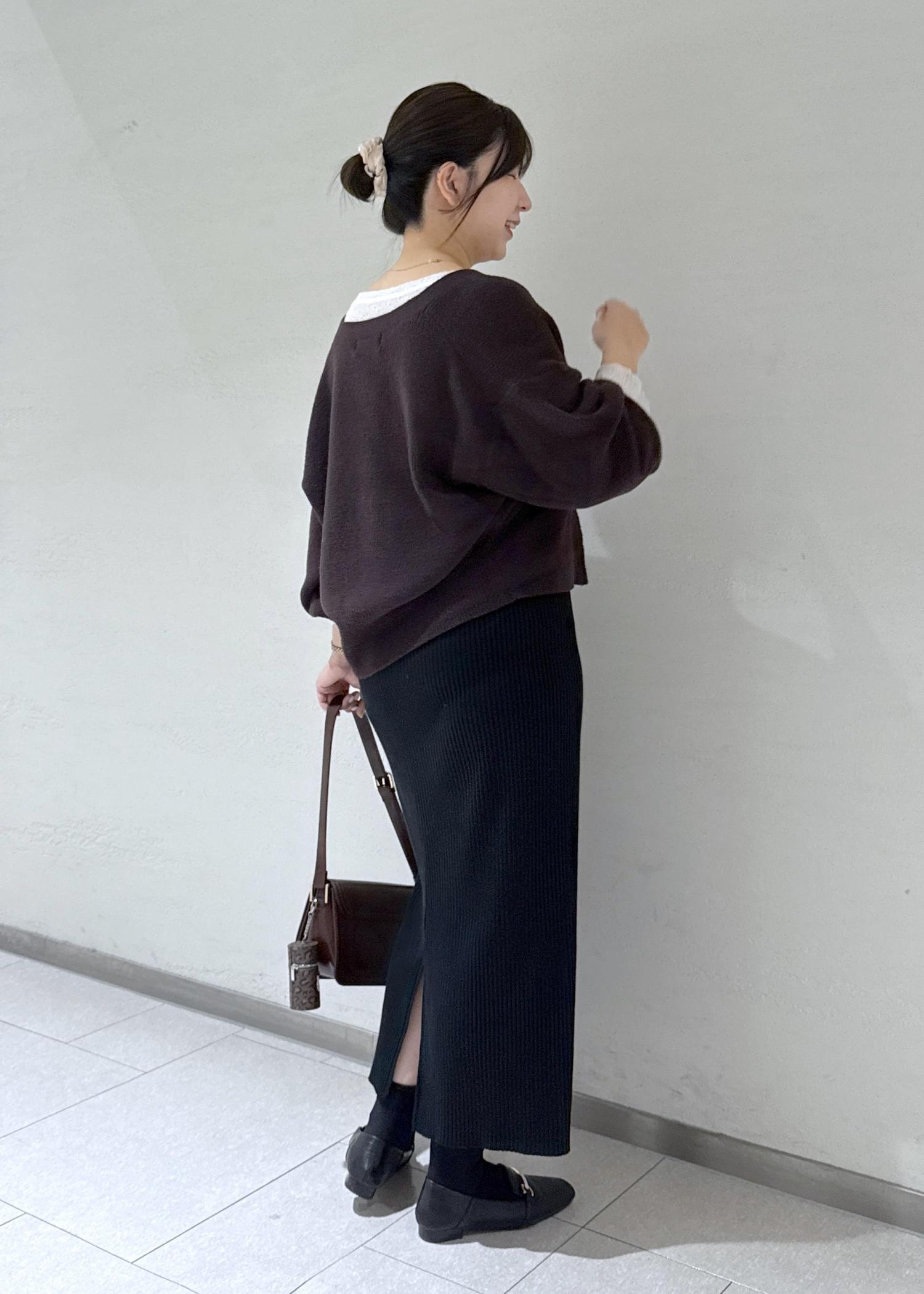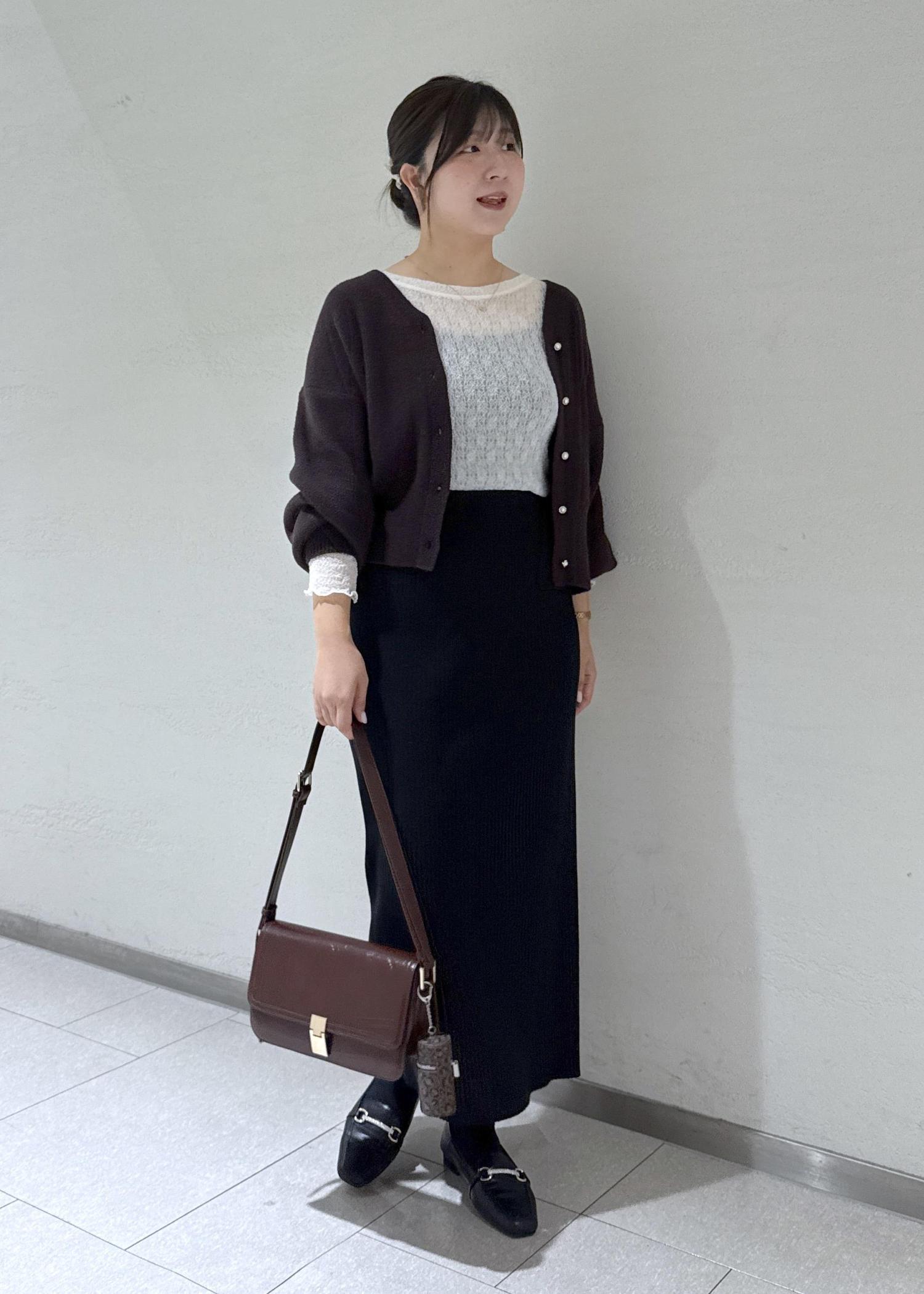 ブラウンニットは黒スカートと合わせてもしっかりと色味の差が出るのですが、重たくなりすぎないようにインナーのレースでかわいさをプラス♡