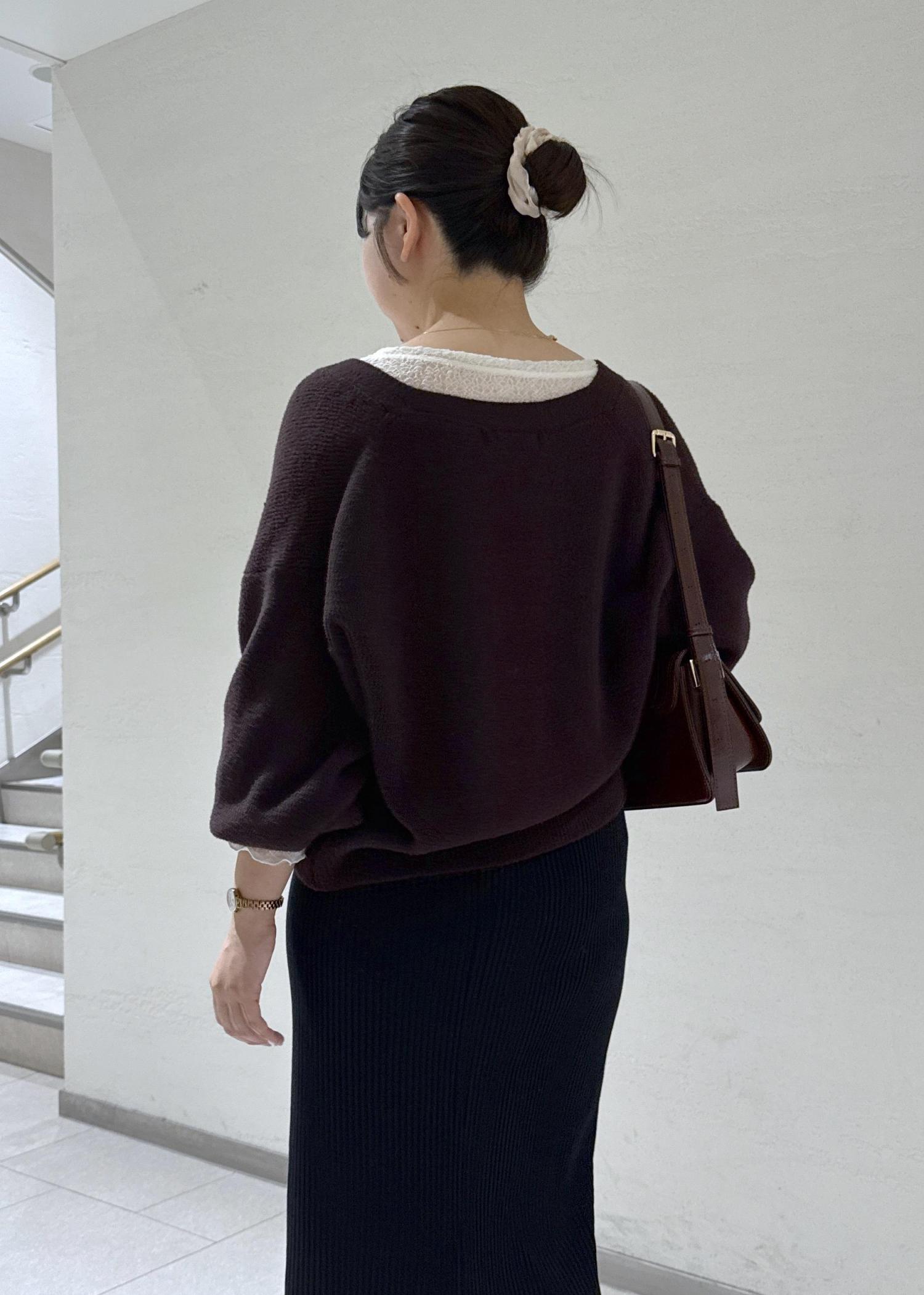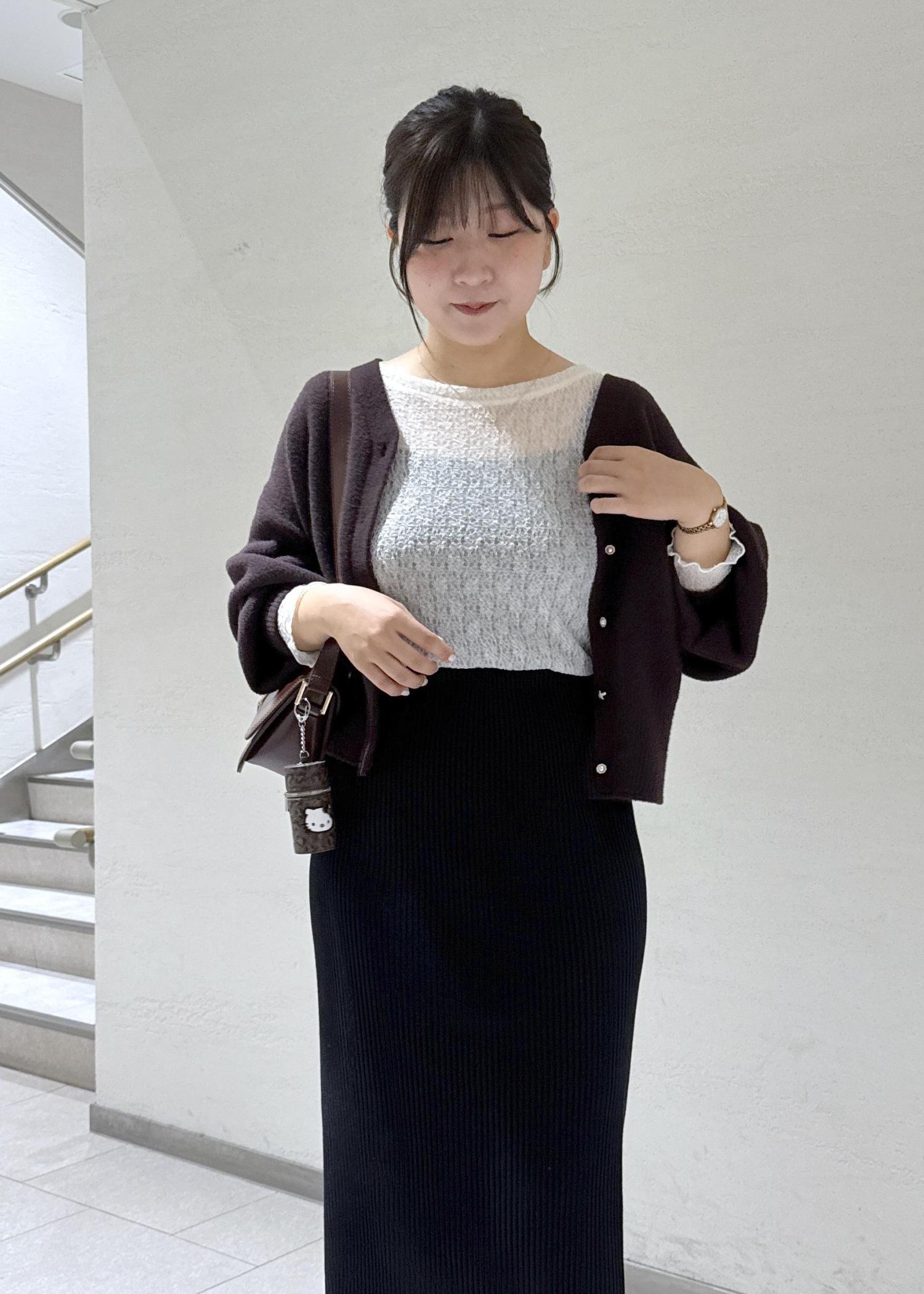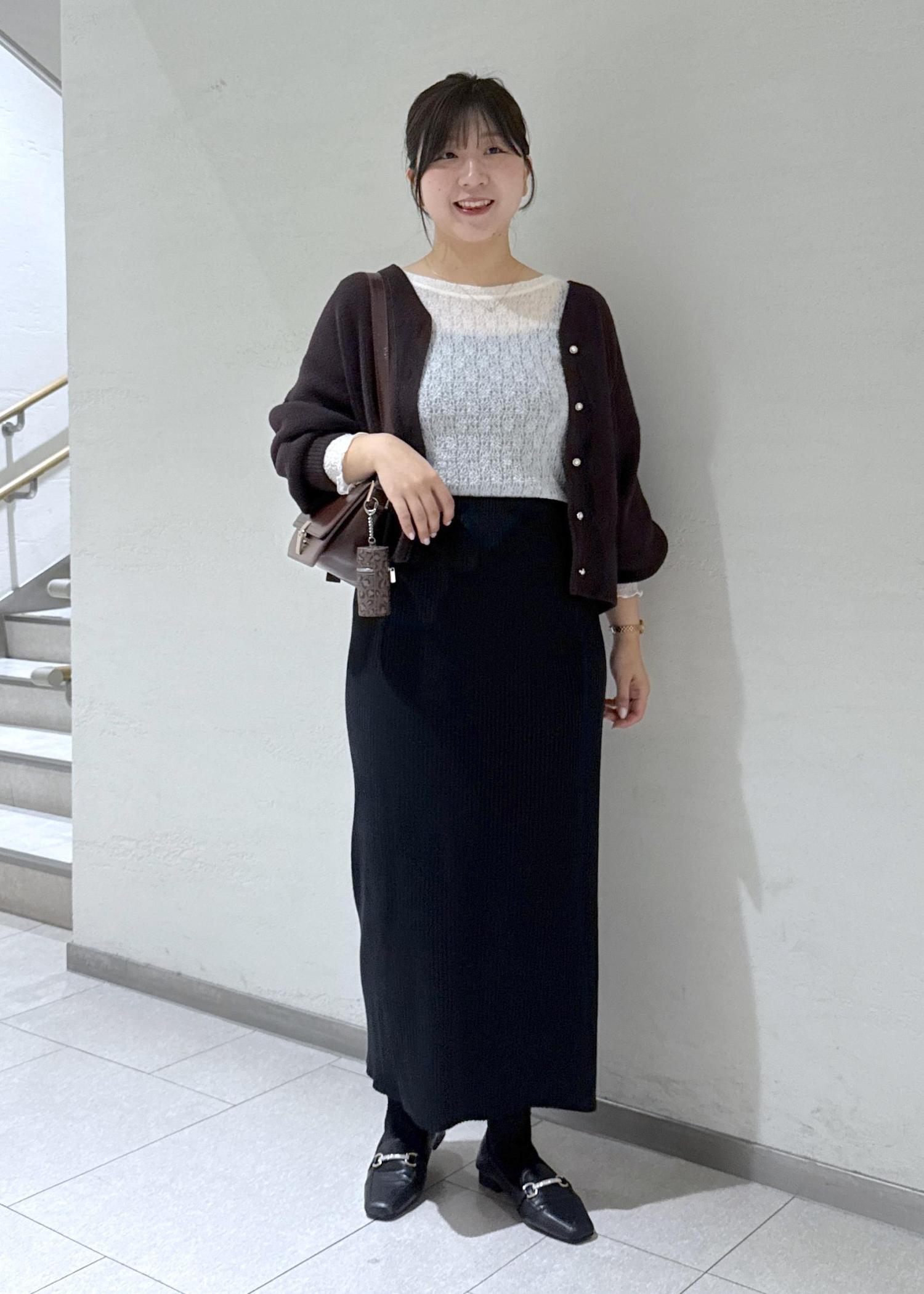 ブラウンニットは黒スカートと合わせてもしっかりと色味の差が出るのですが、重たくなりすぎないようにインナーのレースでかわいさをプラス♡