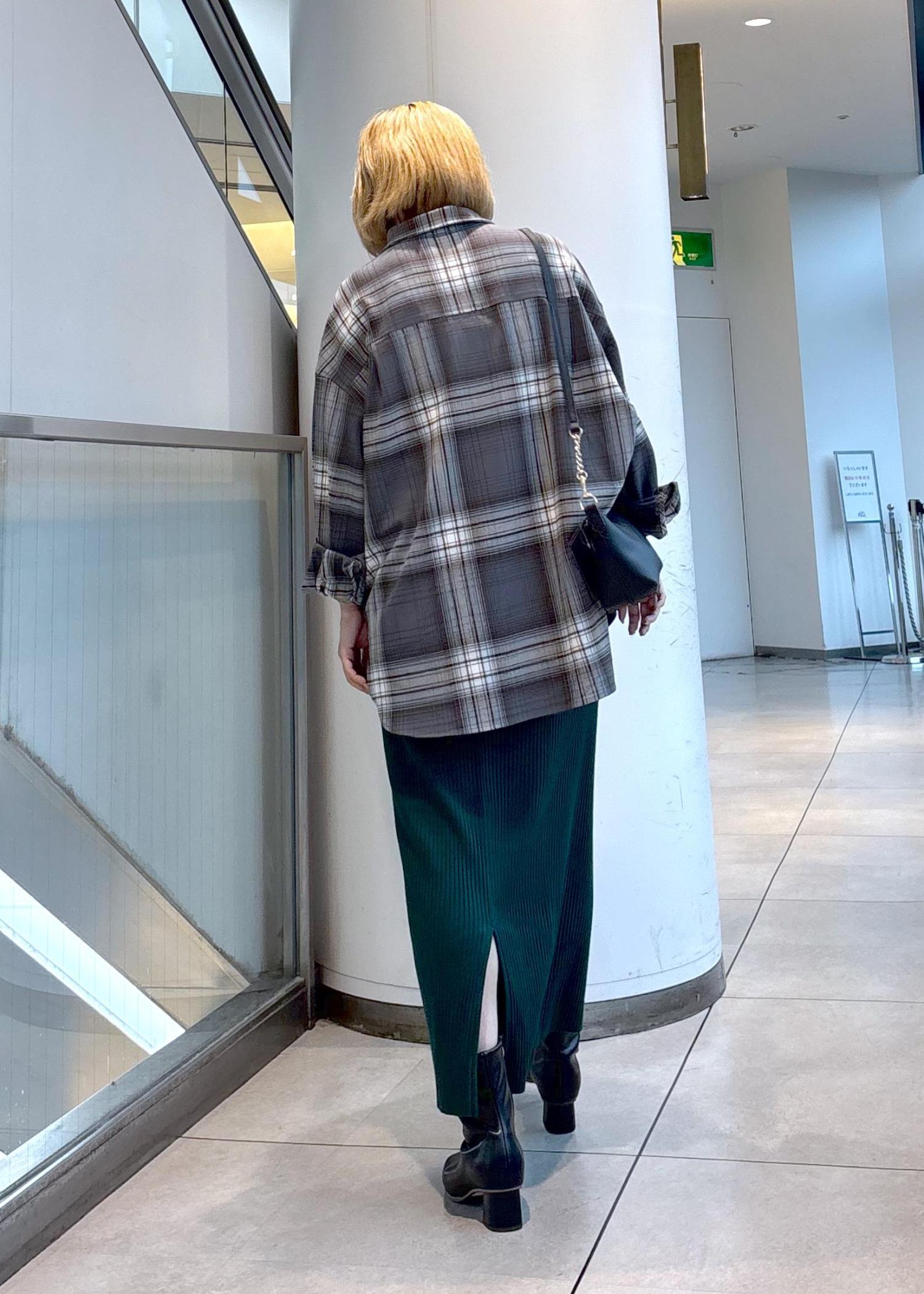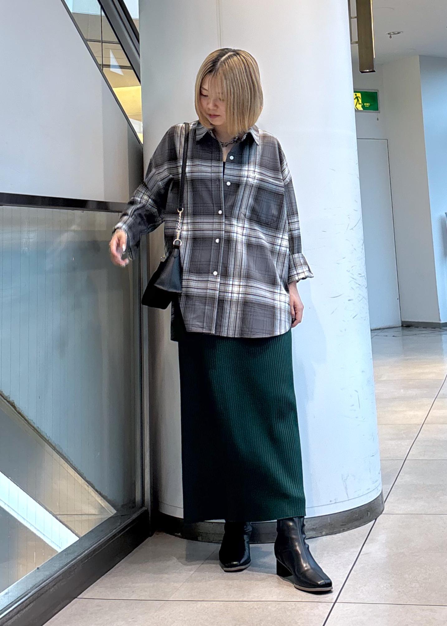 メンズライクなオーバーシャツを、Iラインスカートと合わせて女性らしいカジュアルスタイルにしてみました☺︎