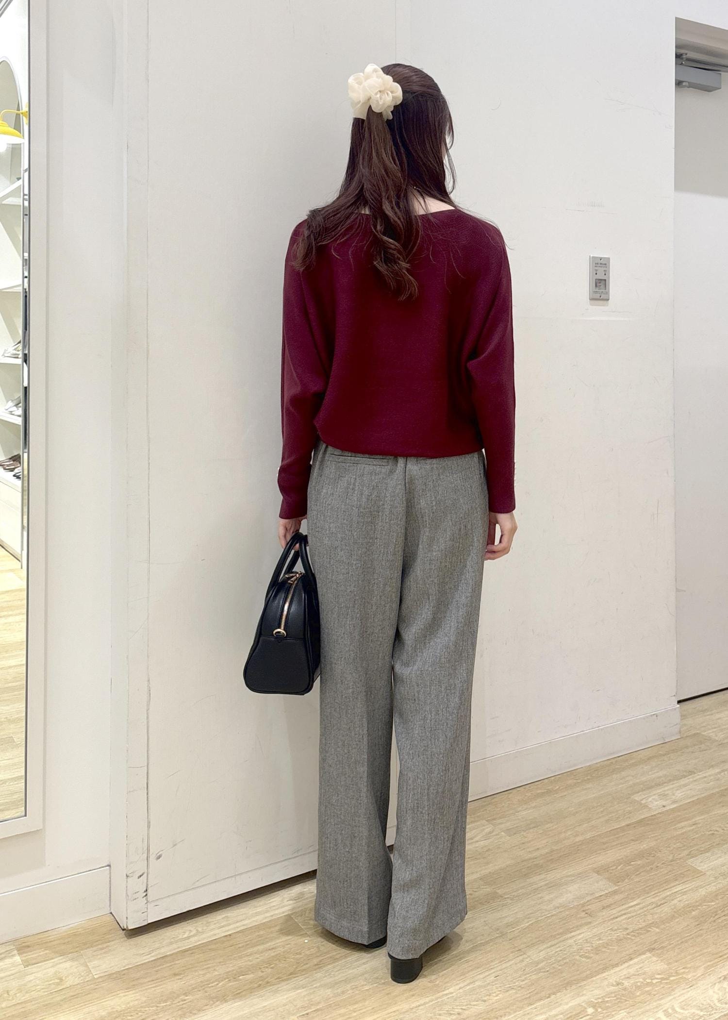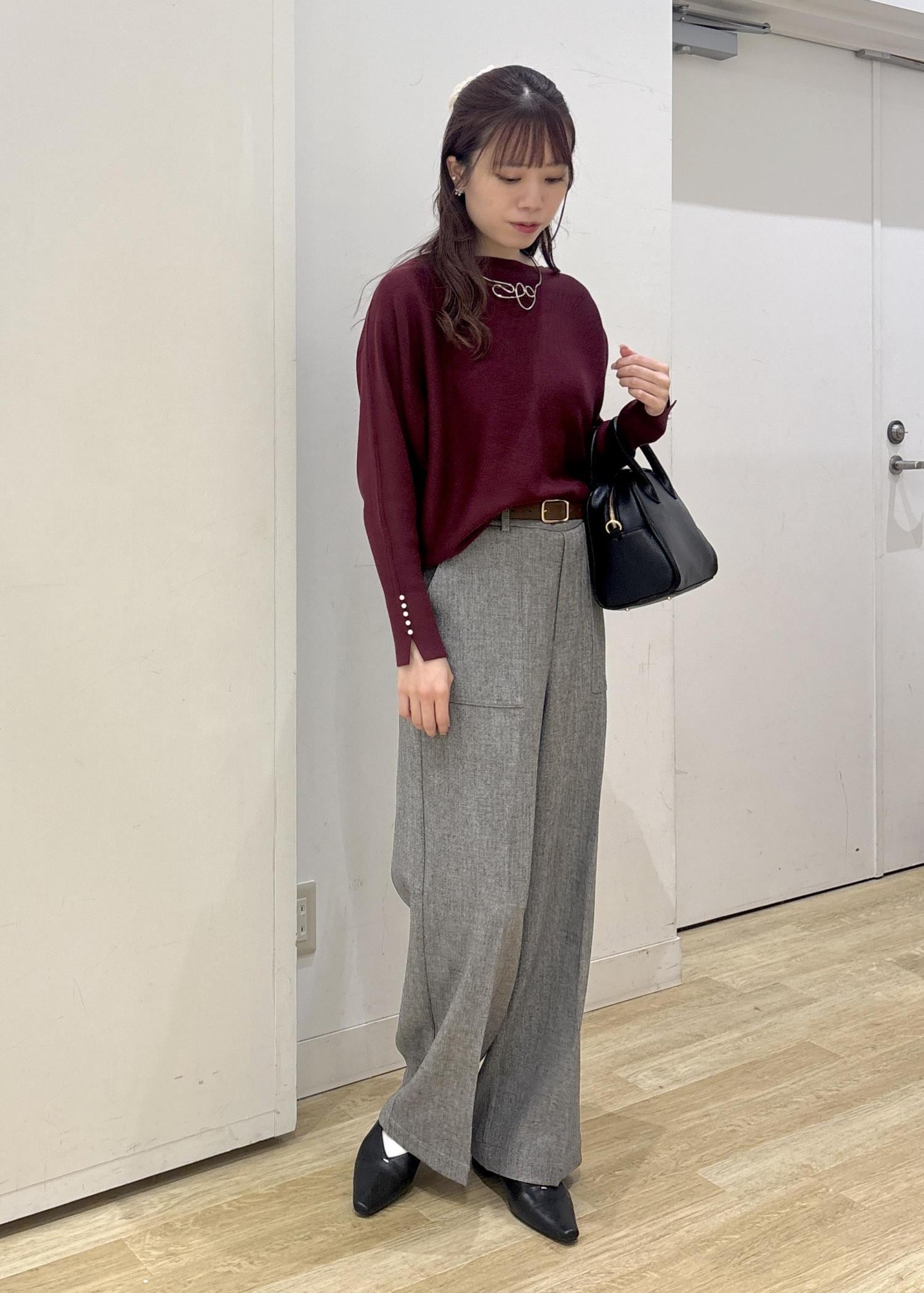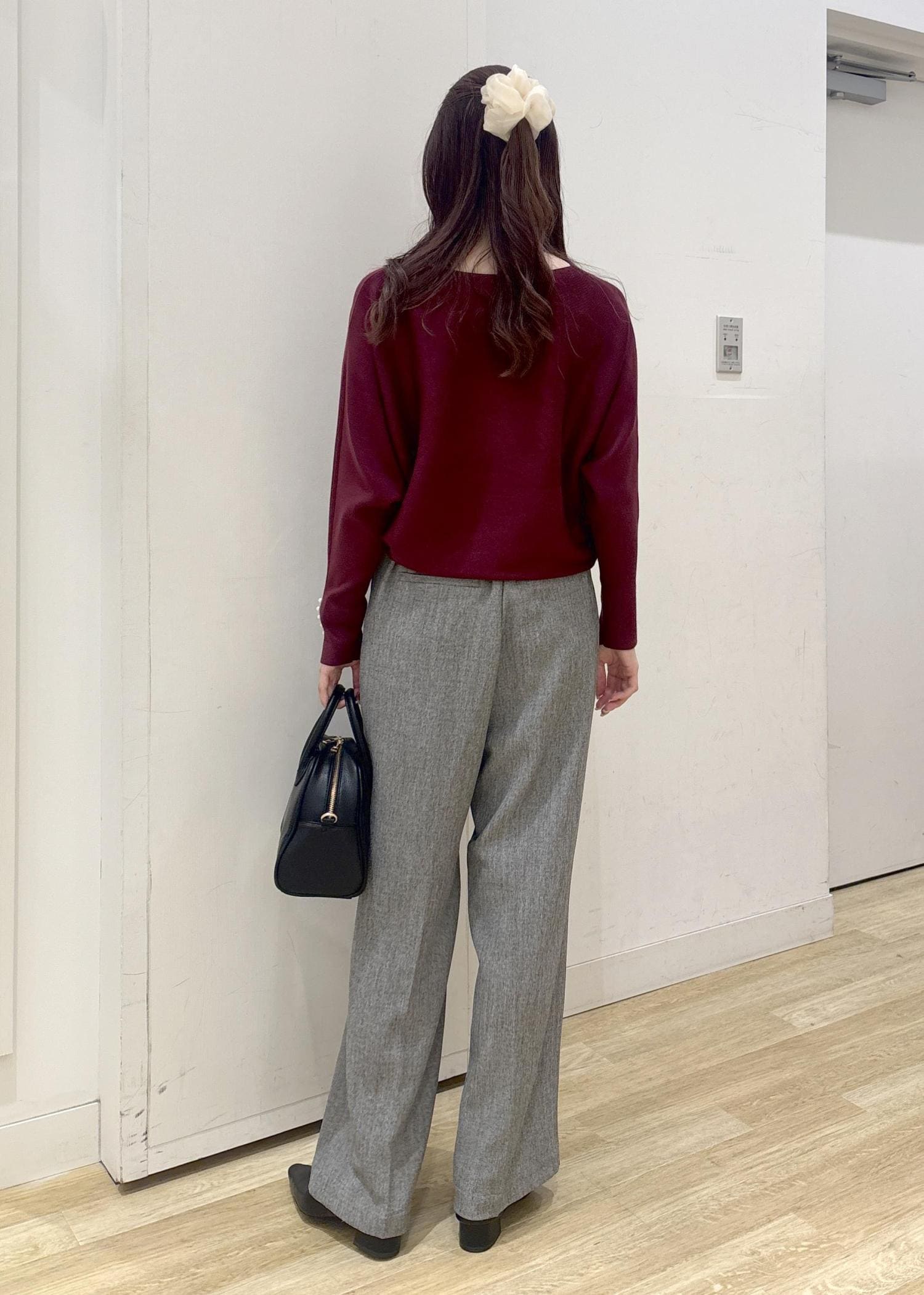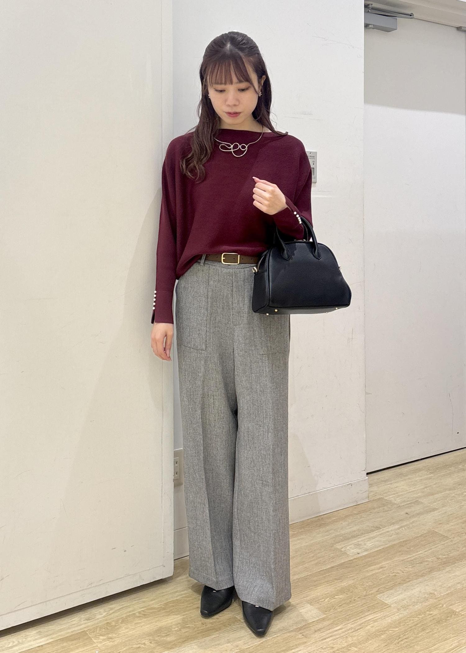 ワインカラーの秋らしいトップスとベイカーパンツを合わせて大人カジュアルなコーディネートに仕上げました◎