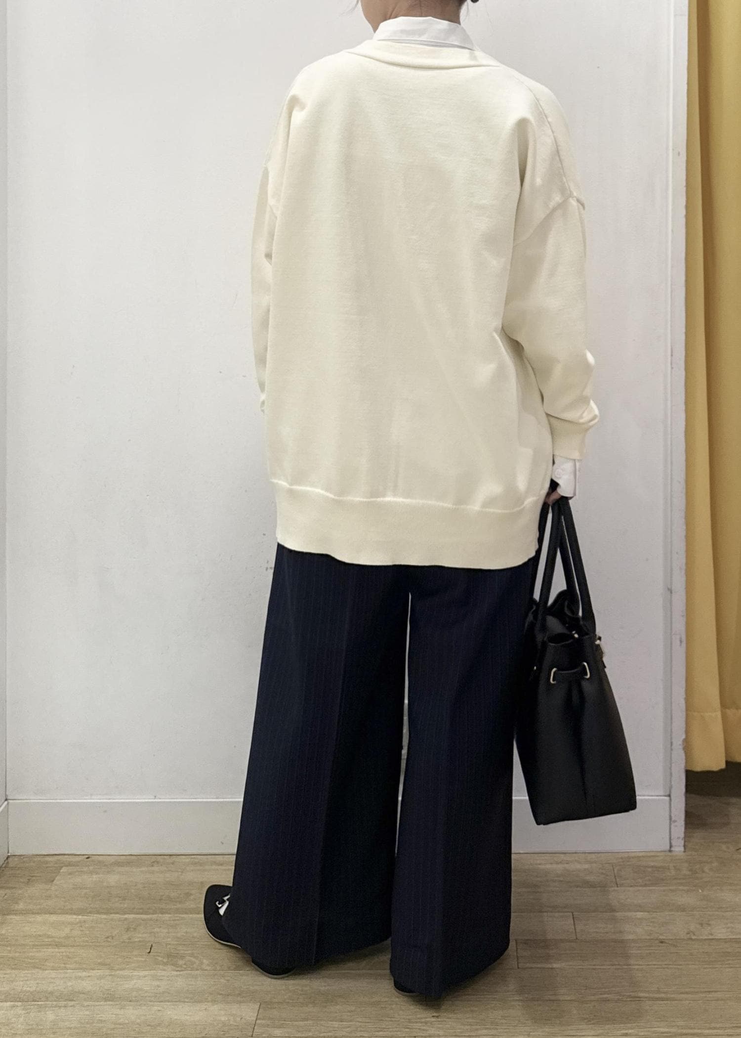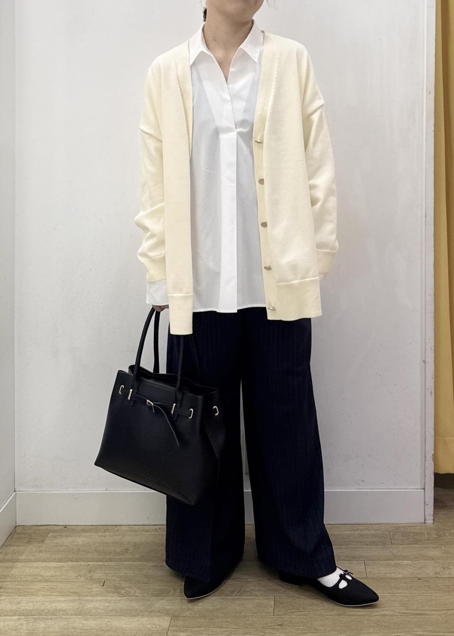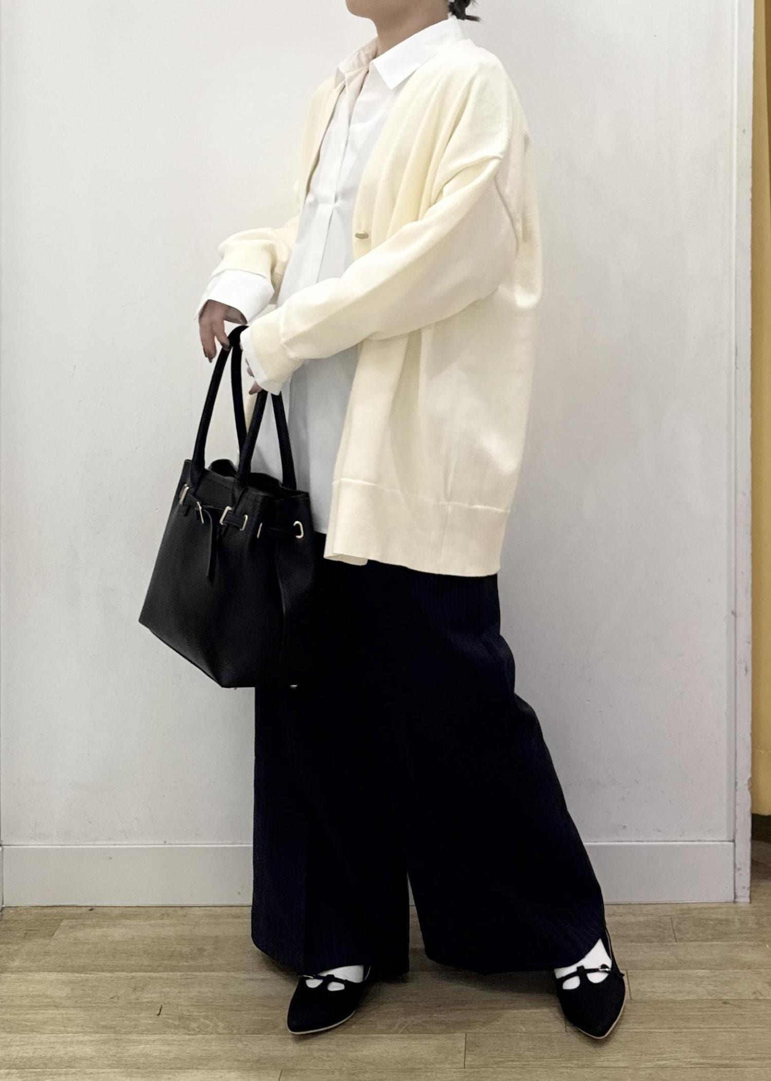 スキッパーシャツにカーディガンのゆるっとシルエットに、フレアのワイドパンツを合わせてシンプルでちゃんと感もあるスタイルに☺︎