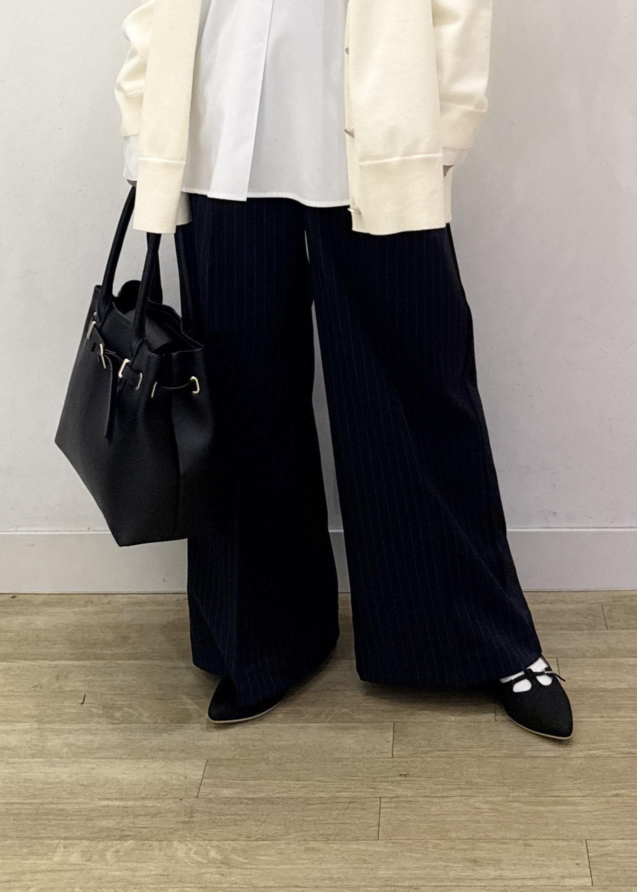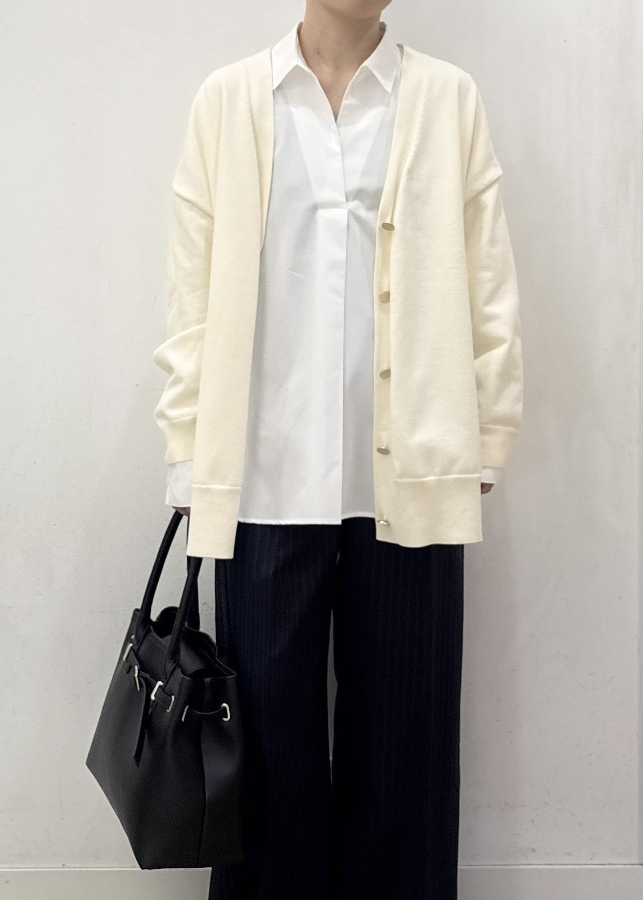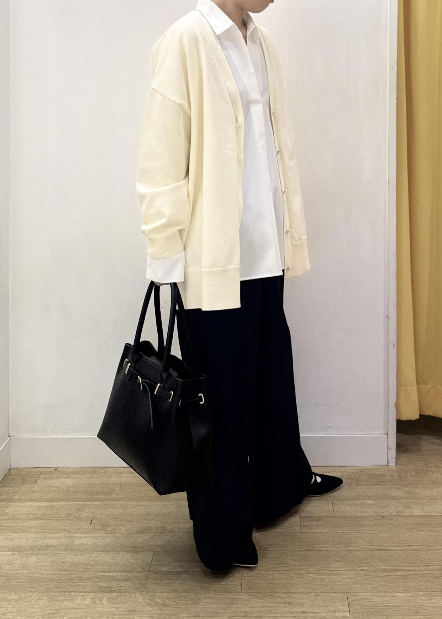 スキッパーシャツにカーディガンのゆるっとシルエットに、フレアのワイドパンツを合わせてシンプルでちゃんと感もあるスタイルに☺︎