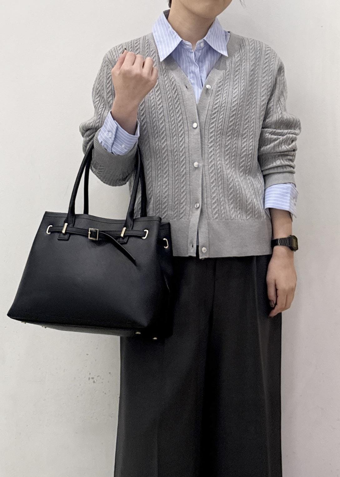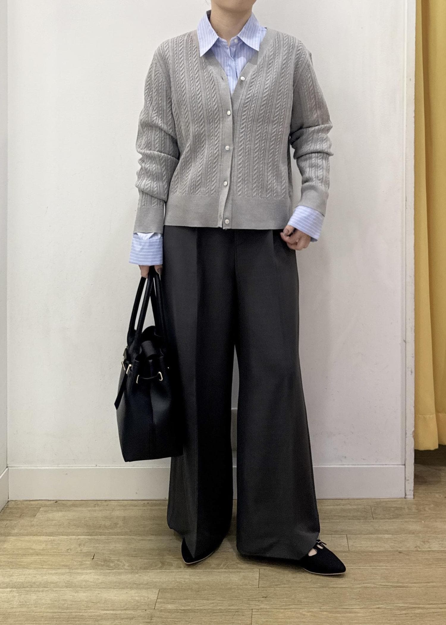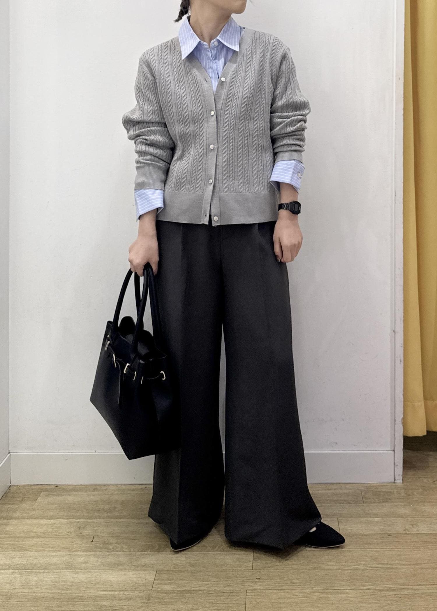 スッキリ見えするシャツとカーディガンに、フレアシルエットがオシャレなパンツを合わせてカッコいいキレイ見えスタイルに☺︎