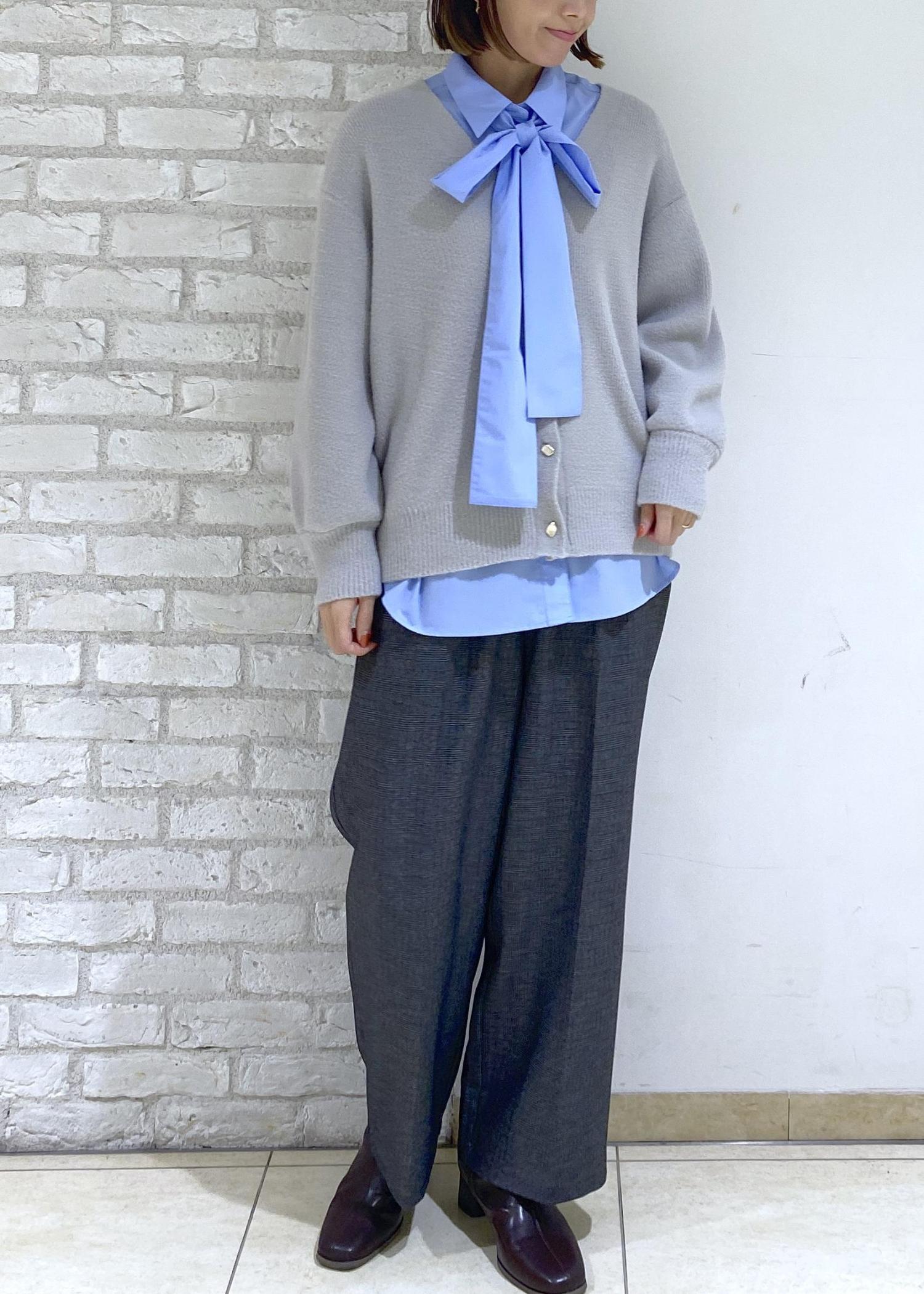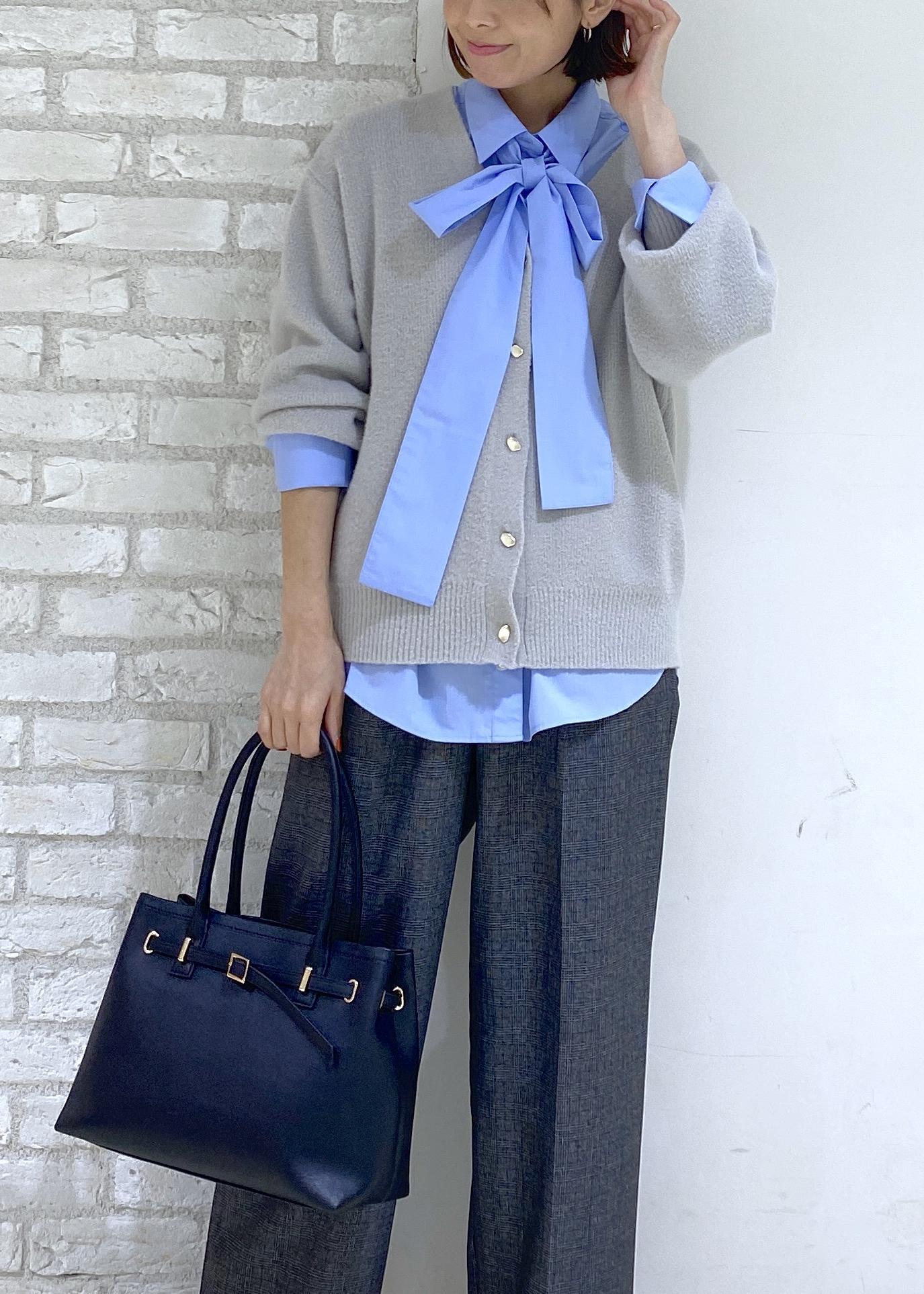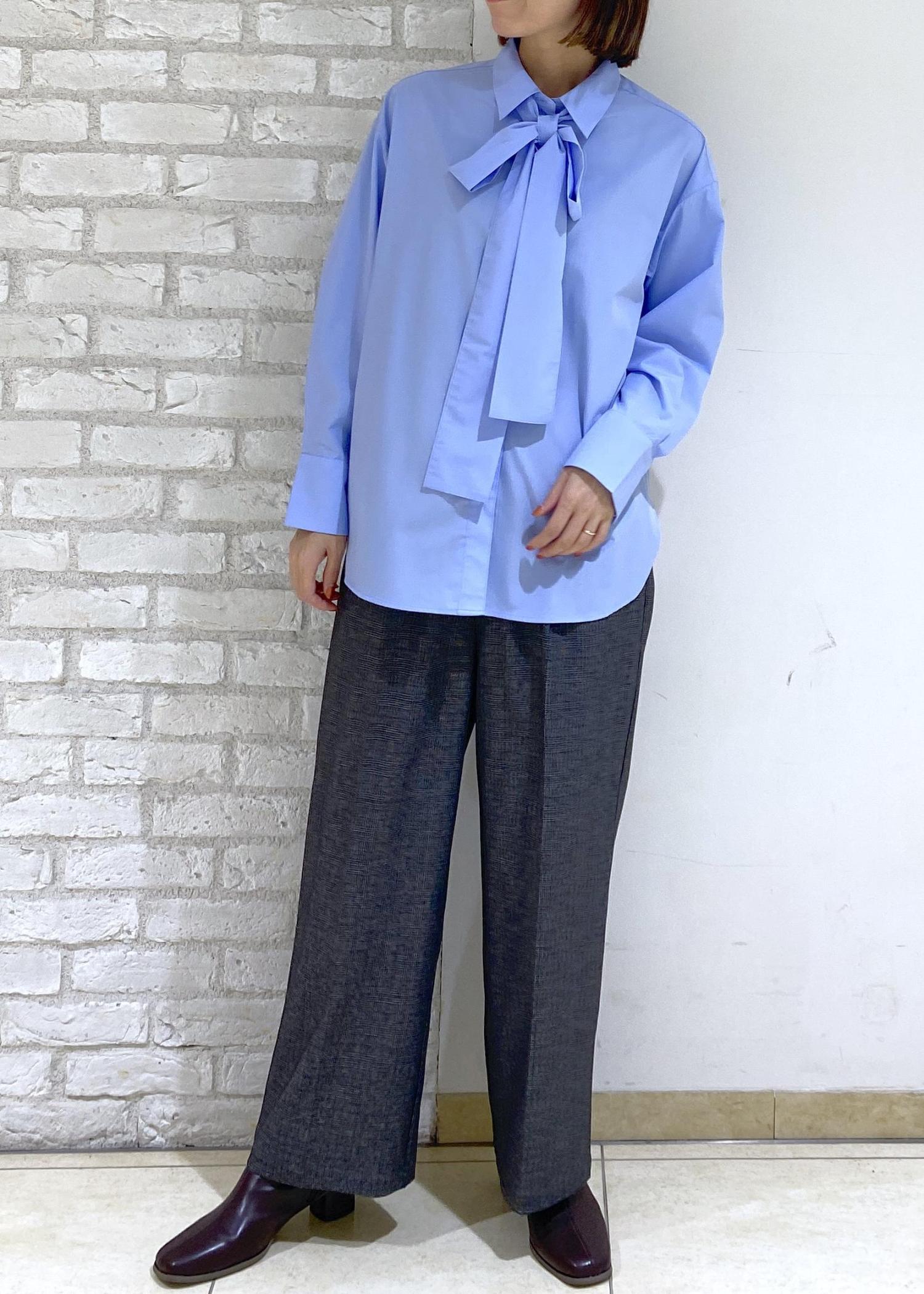 ブルーのリボンシャツを合わせた大人カジュアルコーデ。