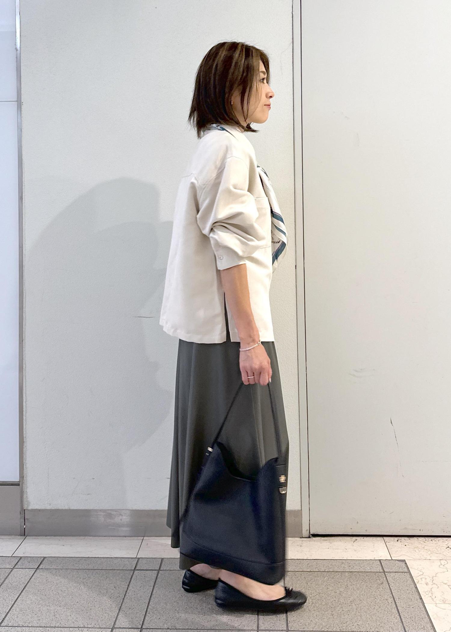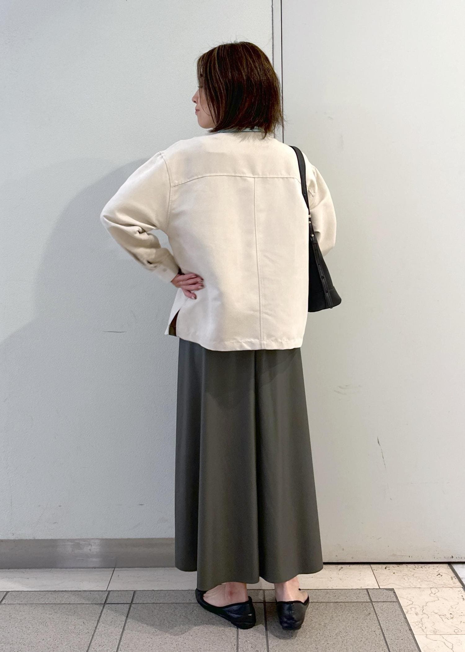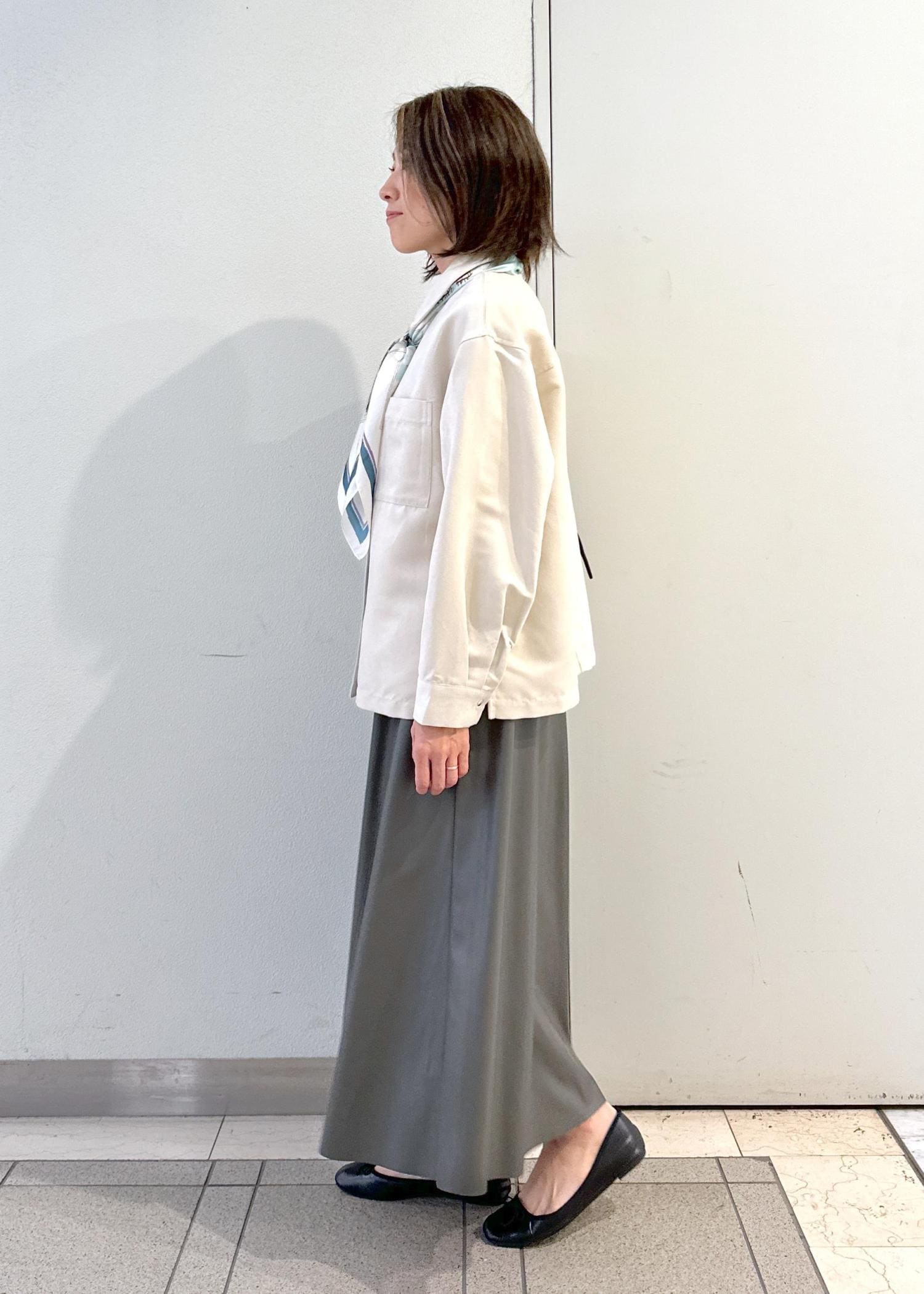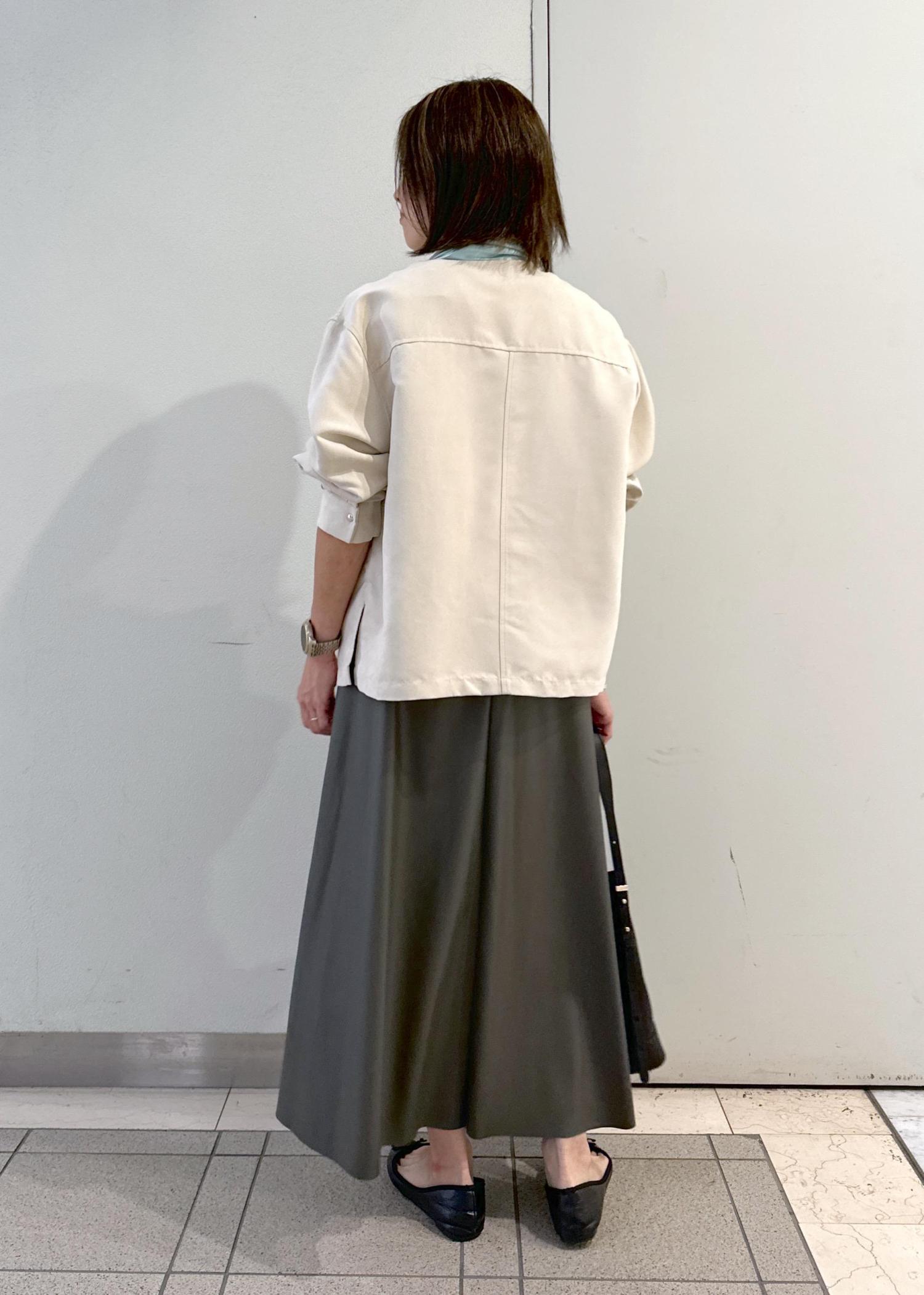 サイドにスリットが入っていて軽やかさがあるので、パンツでもスカートでも合わせやすいです。着丈はお尻にかかる位の長さです。 -