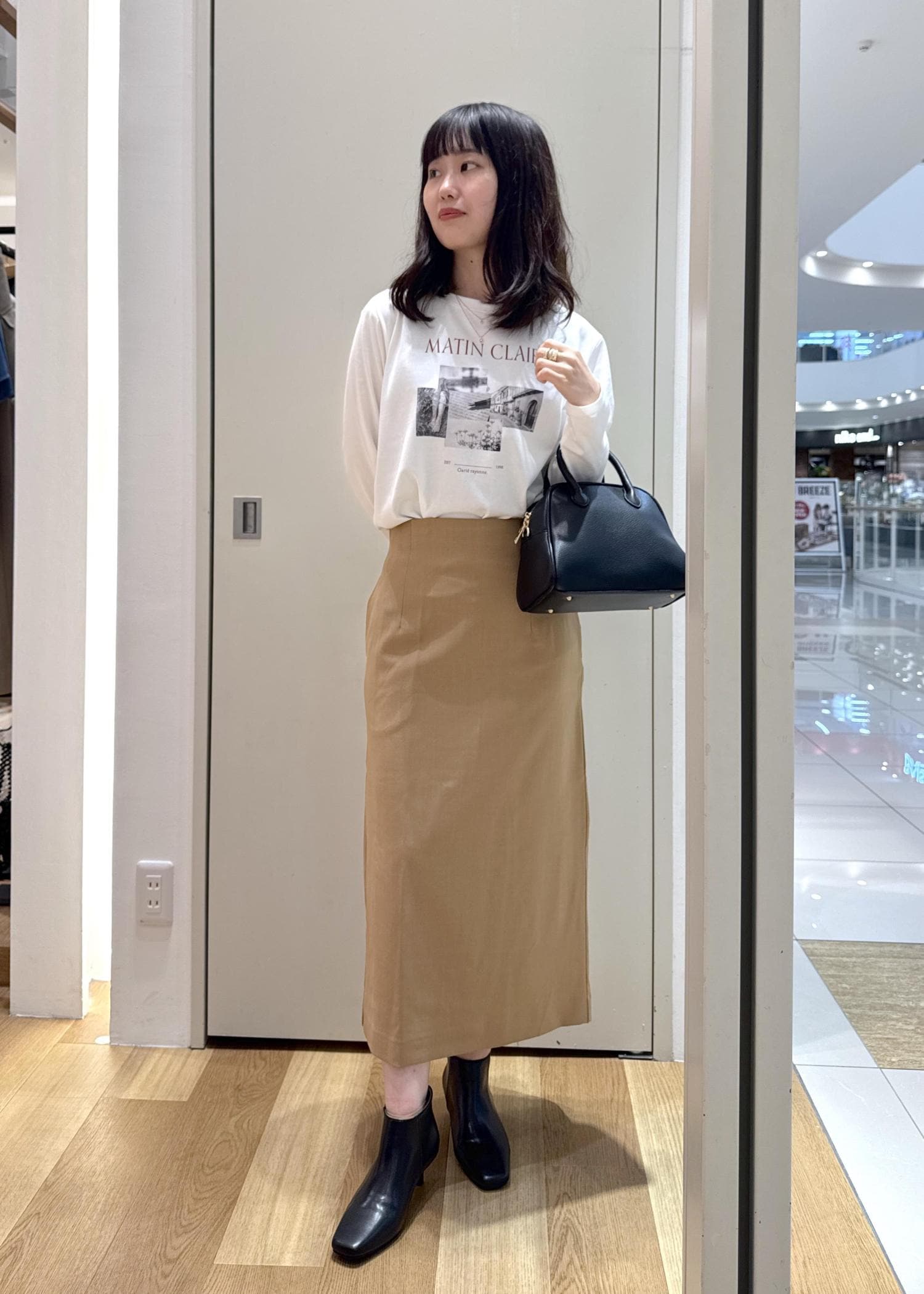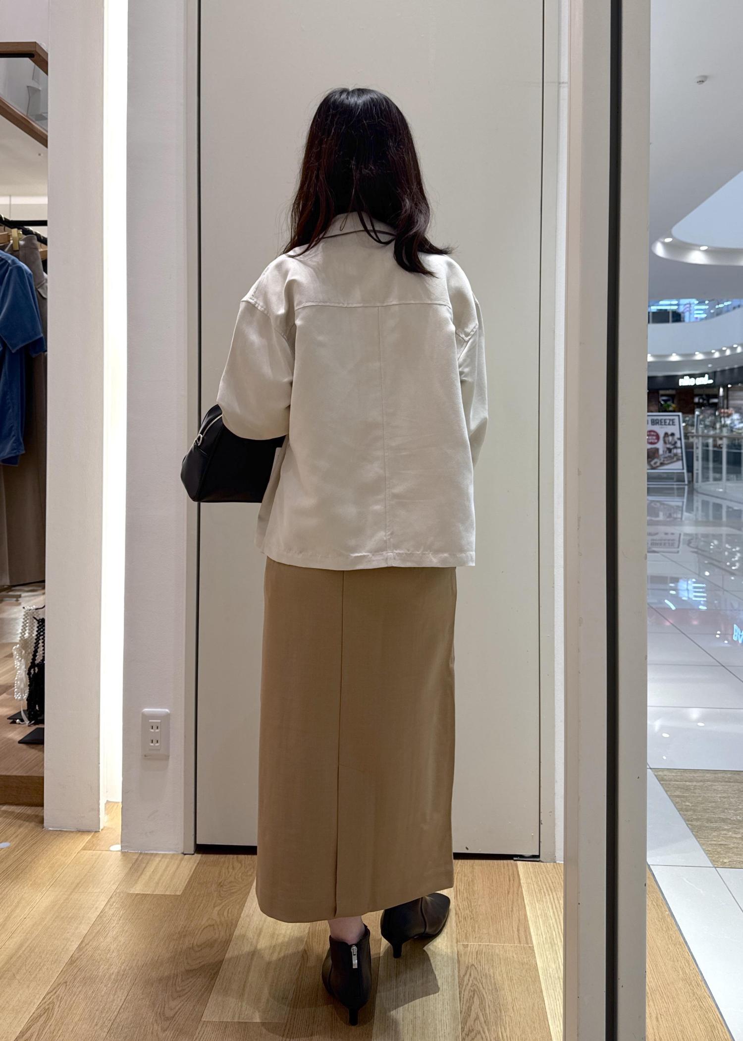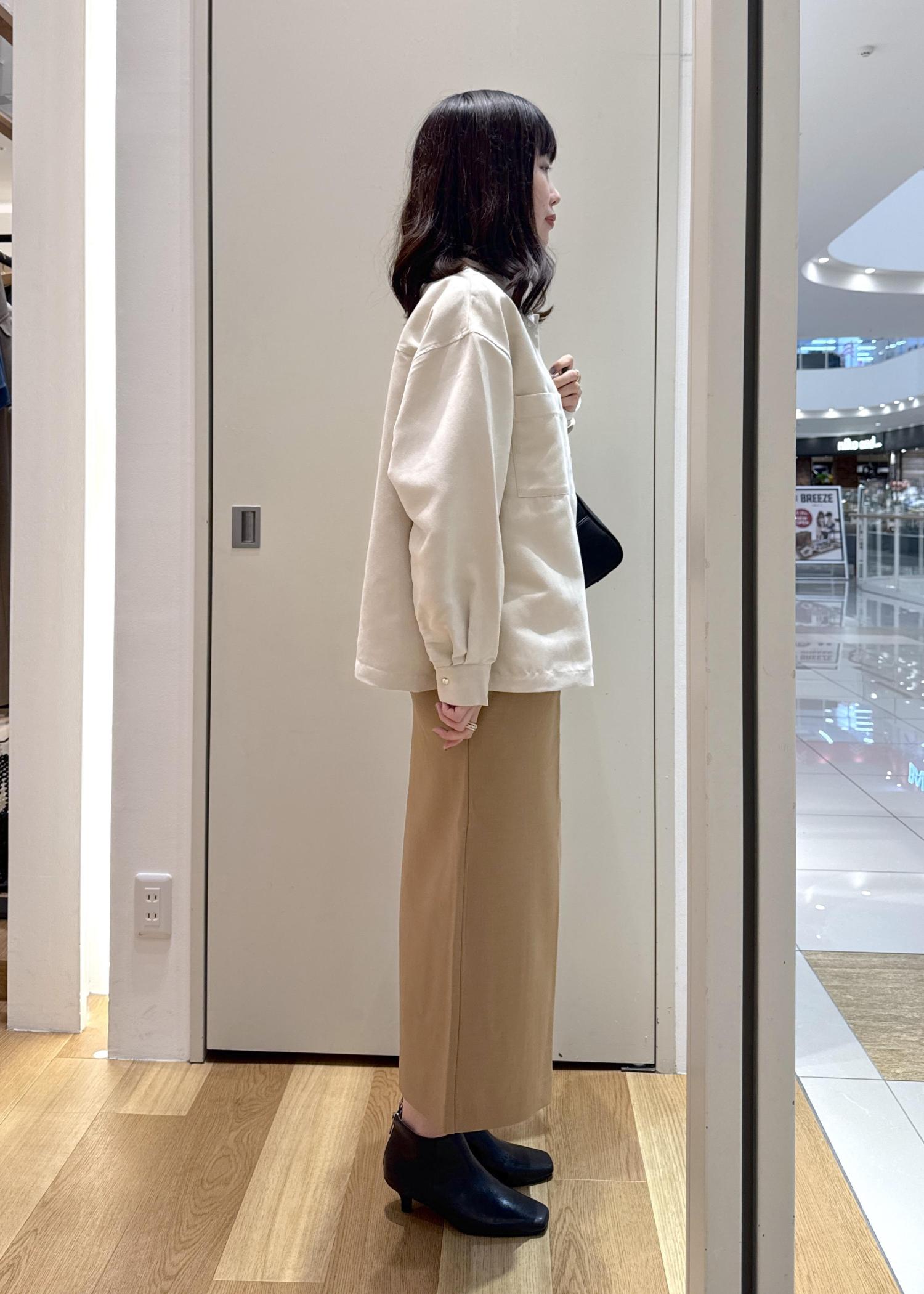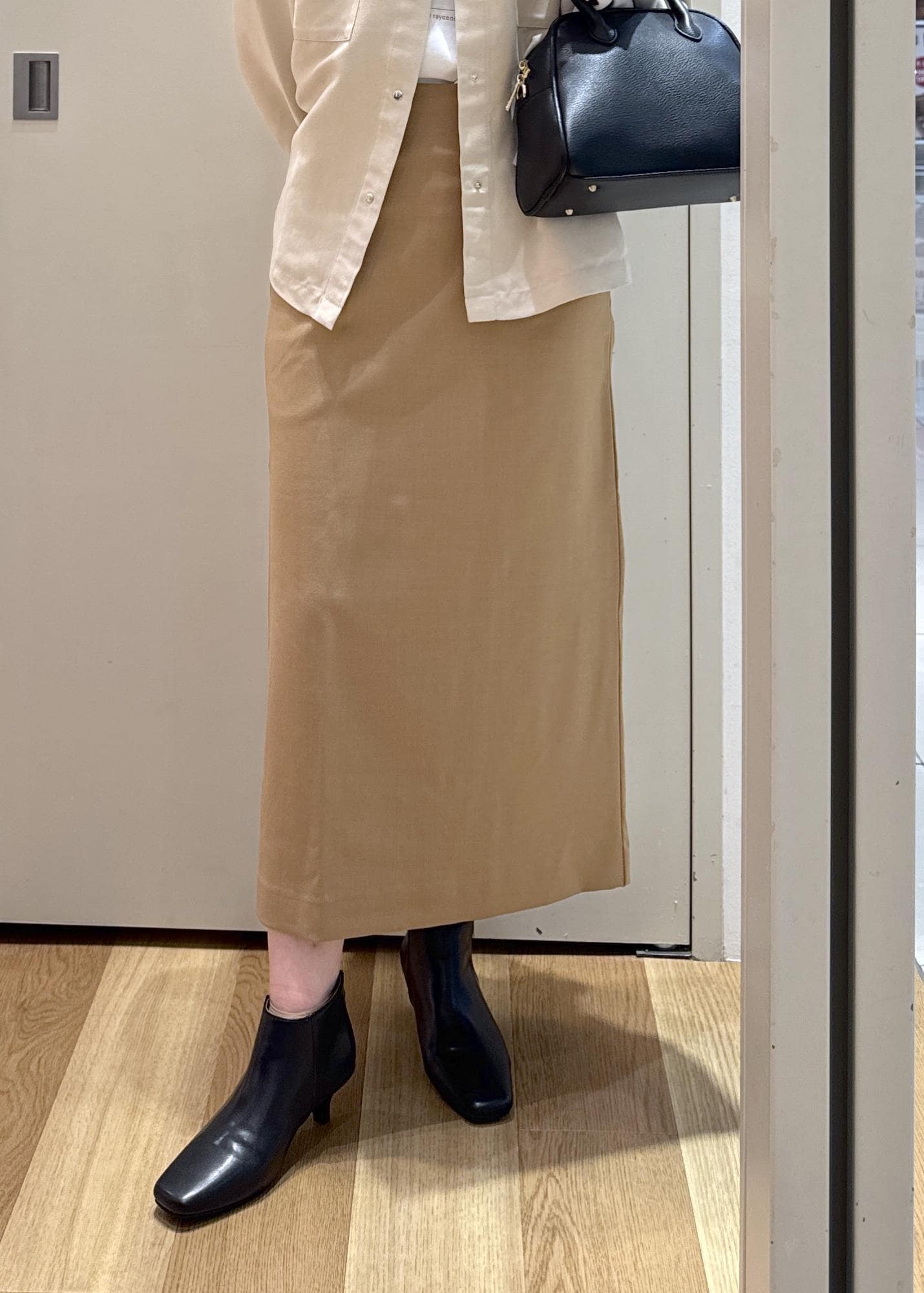 季節の変わり目にぴったりなスエードシャツに、シルエットがきれいなアイラインスカートを合わせたきれいめカジュアルコーデです。