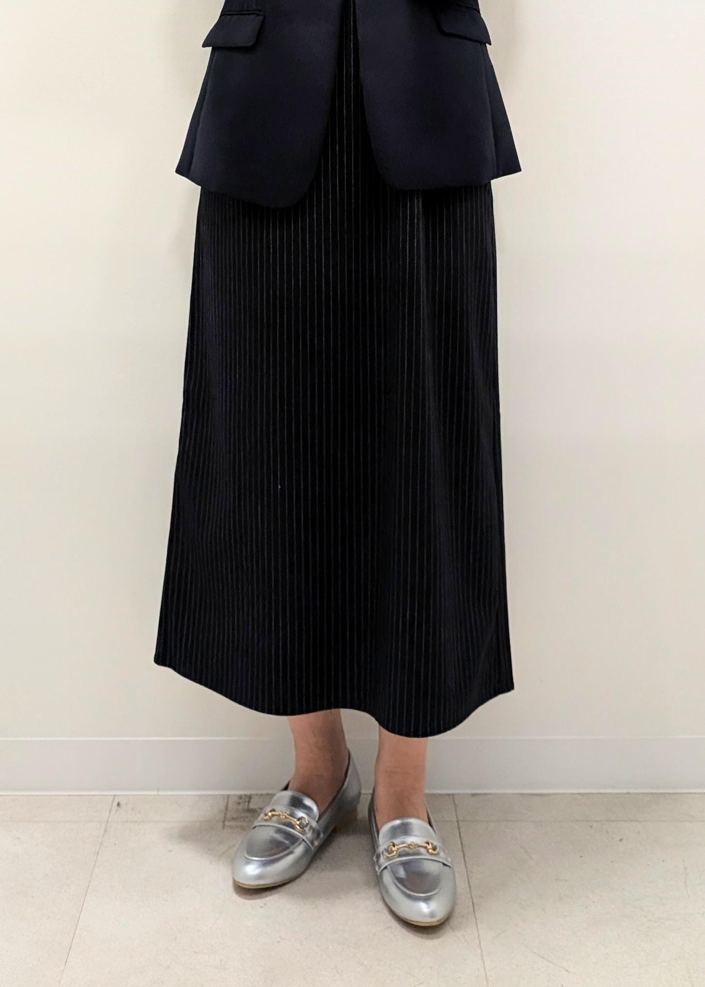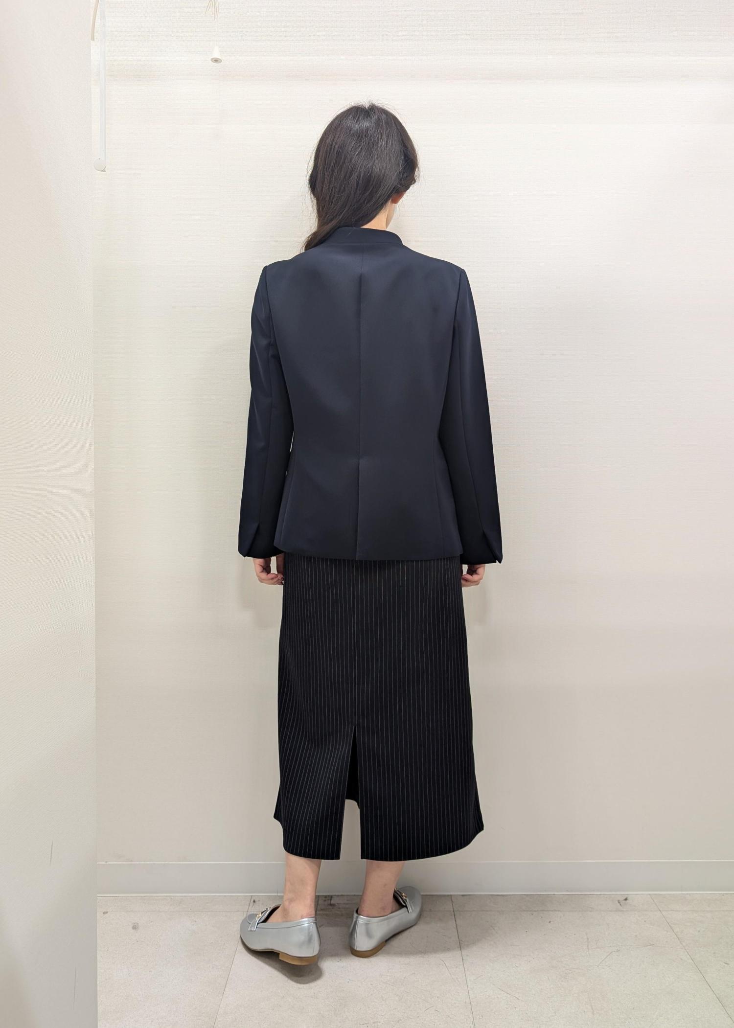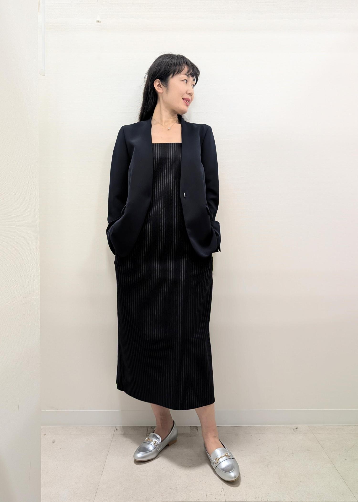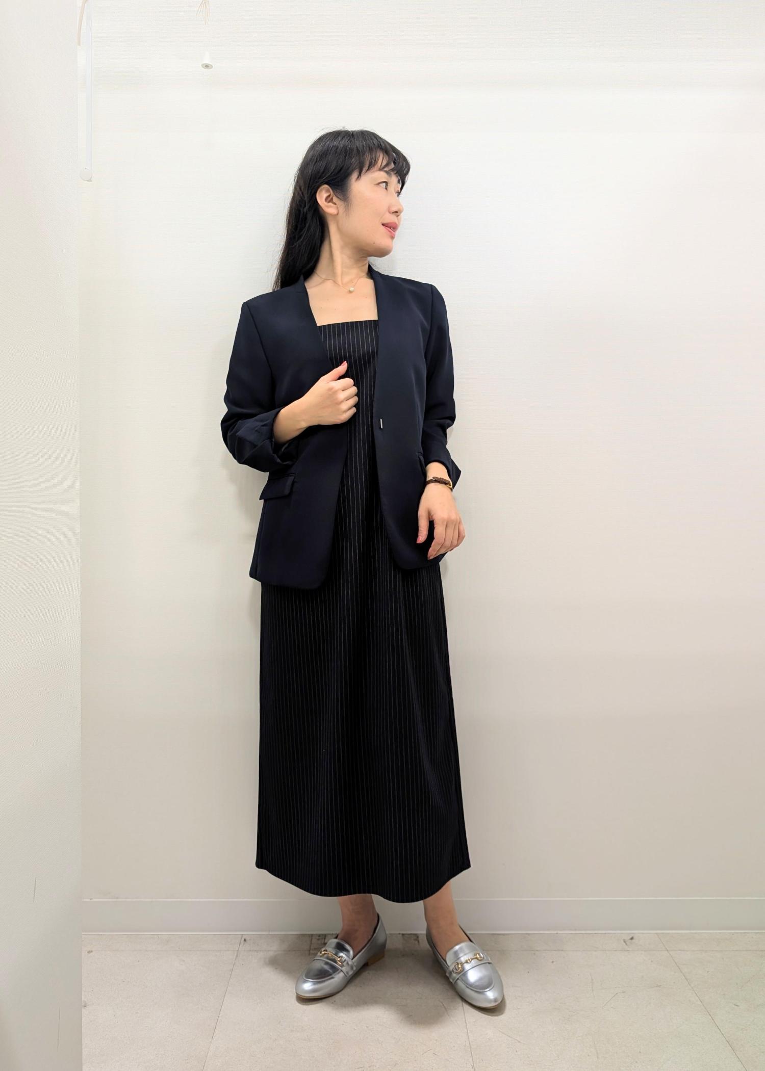 シンプルなジャケットにストライプのキャミワンピースを合わせたセットアップ風コーデ。