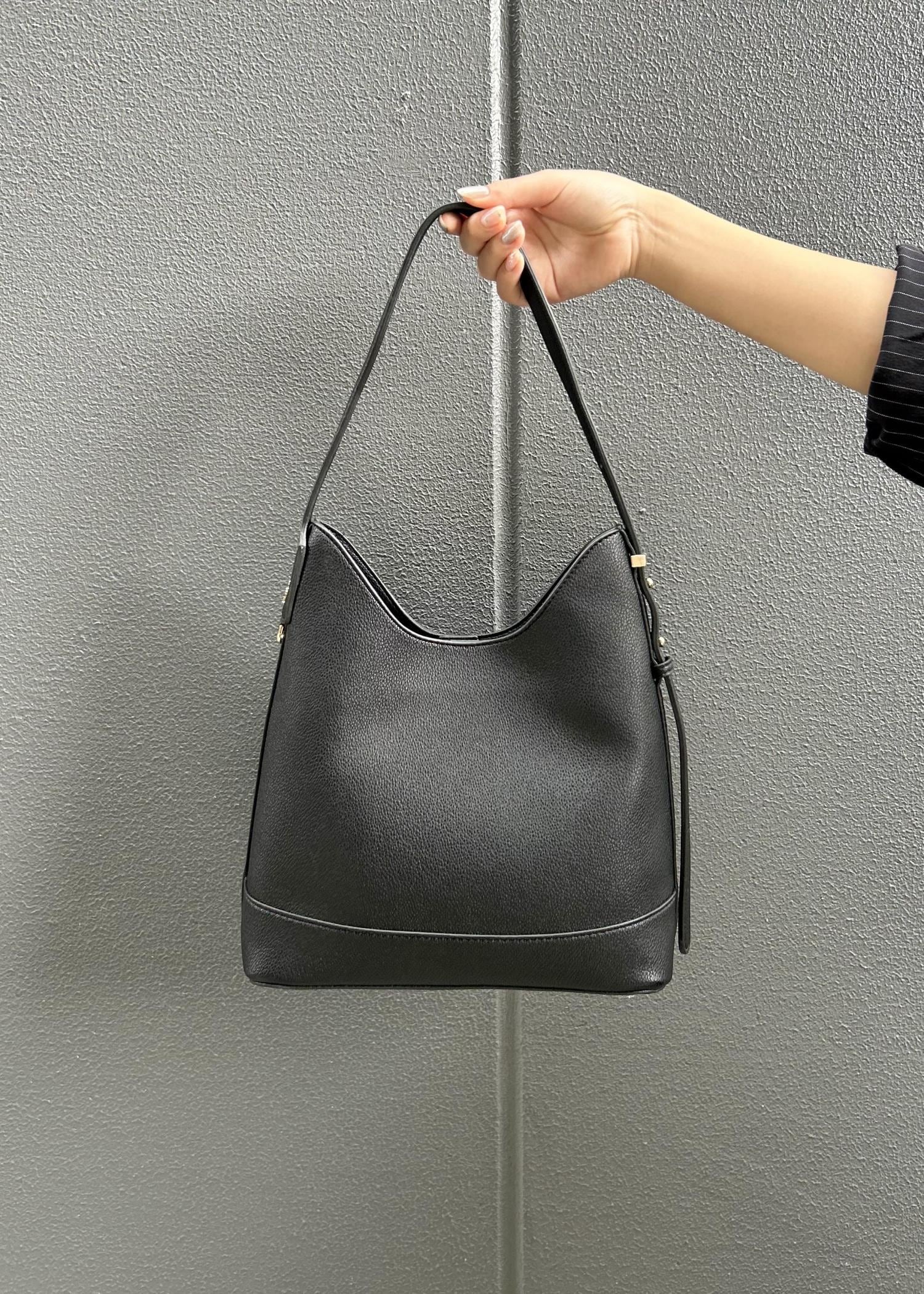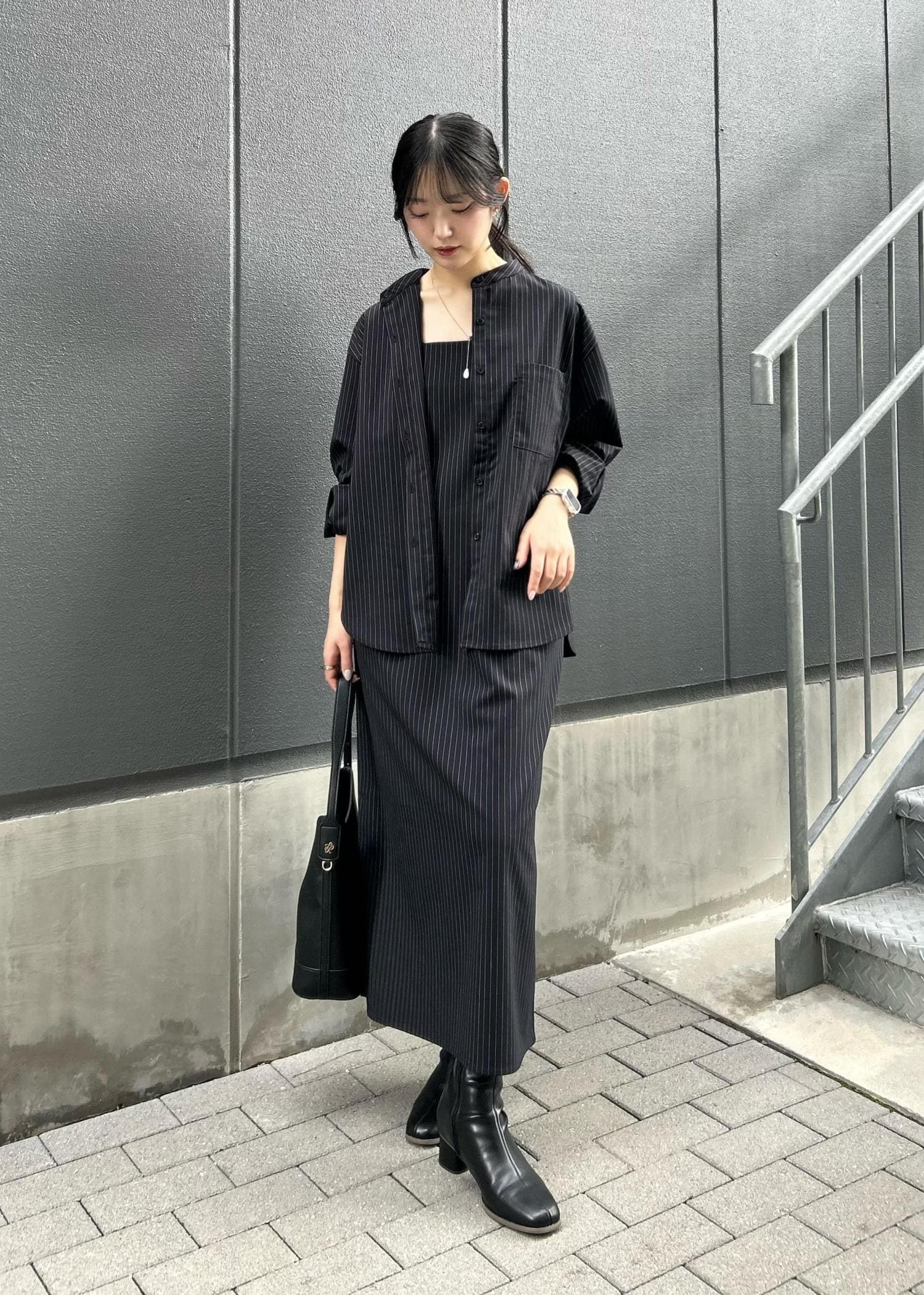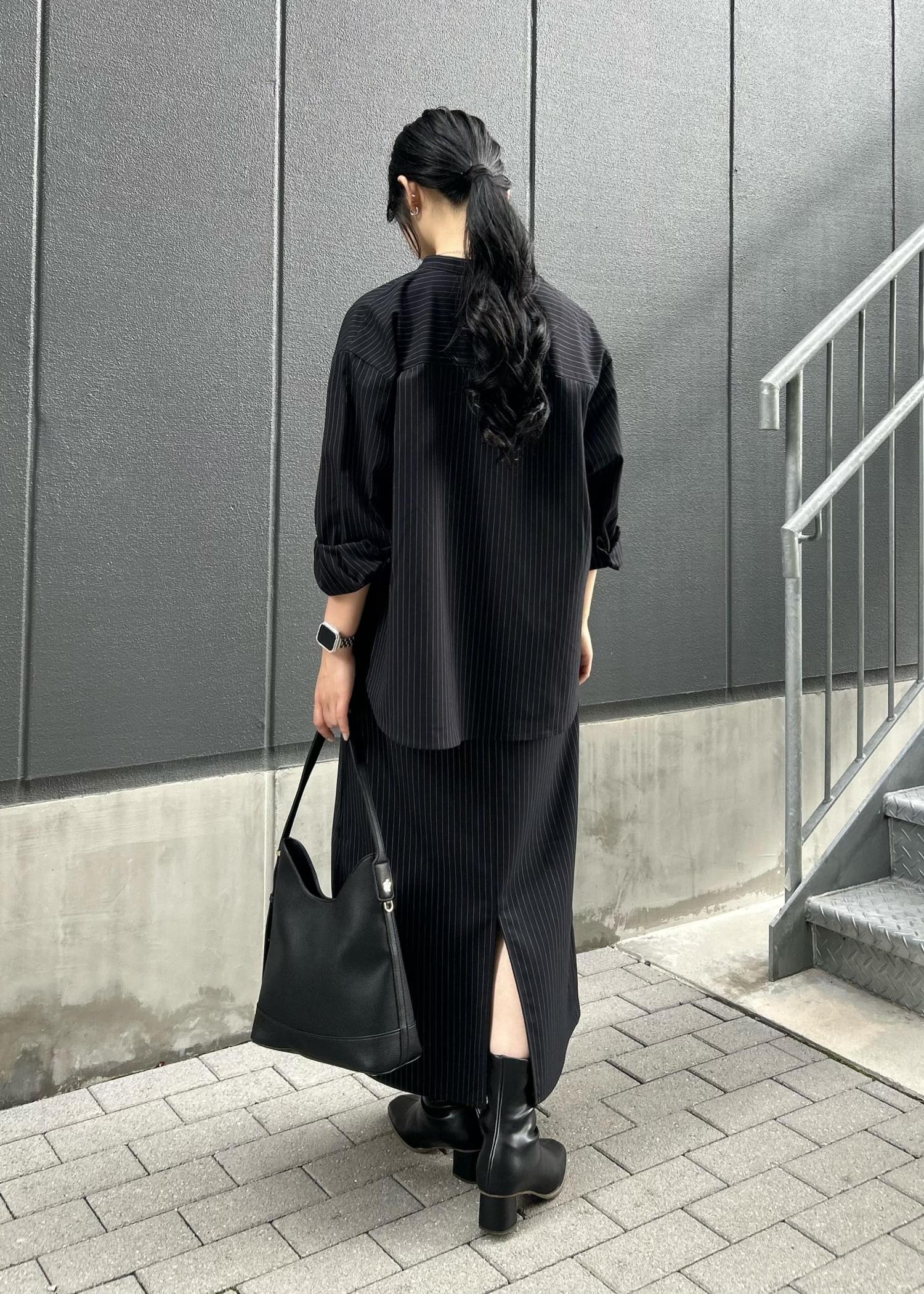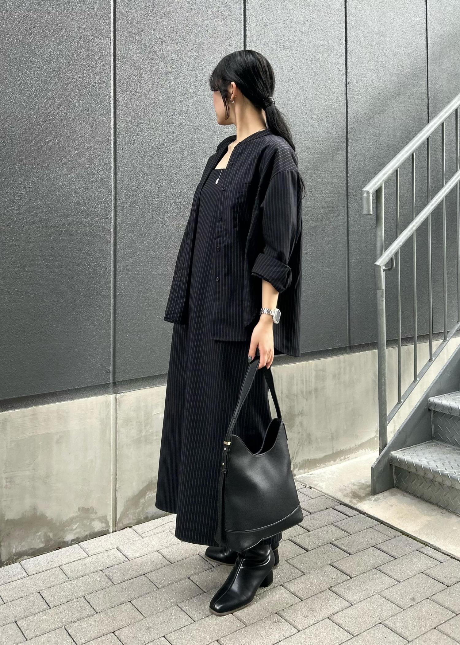 バッグも黒でまとめて、色ではなくシルエットと素材感で