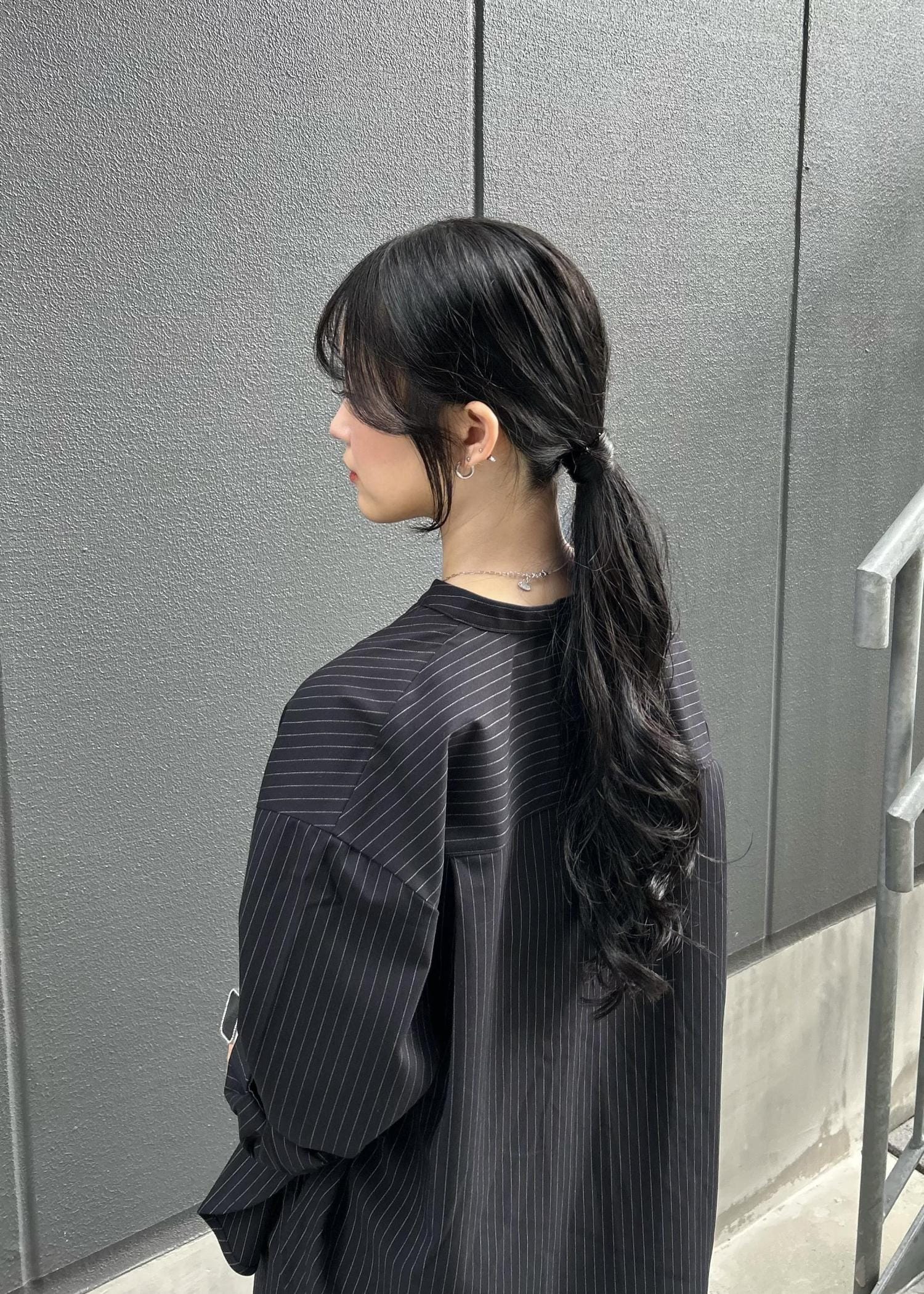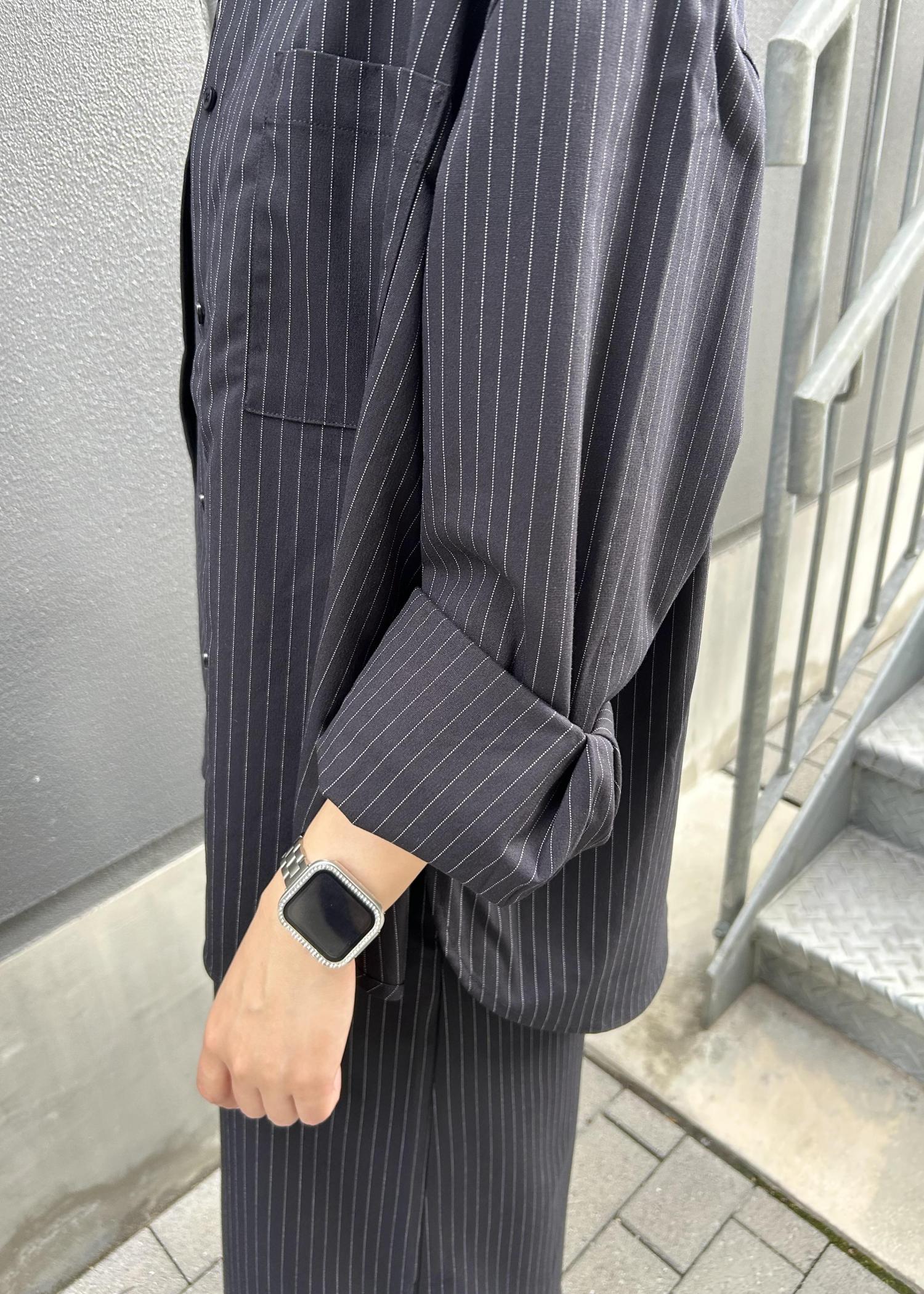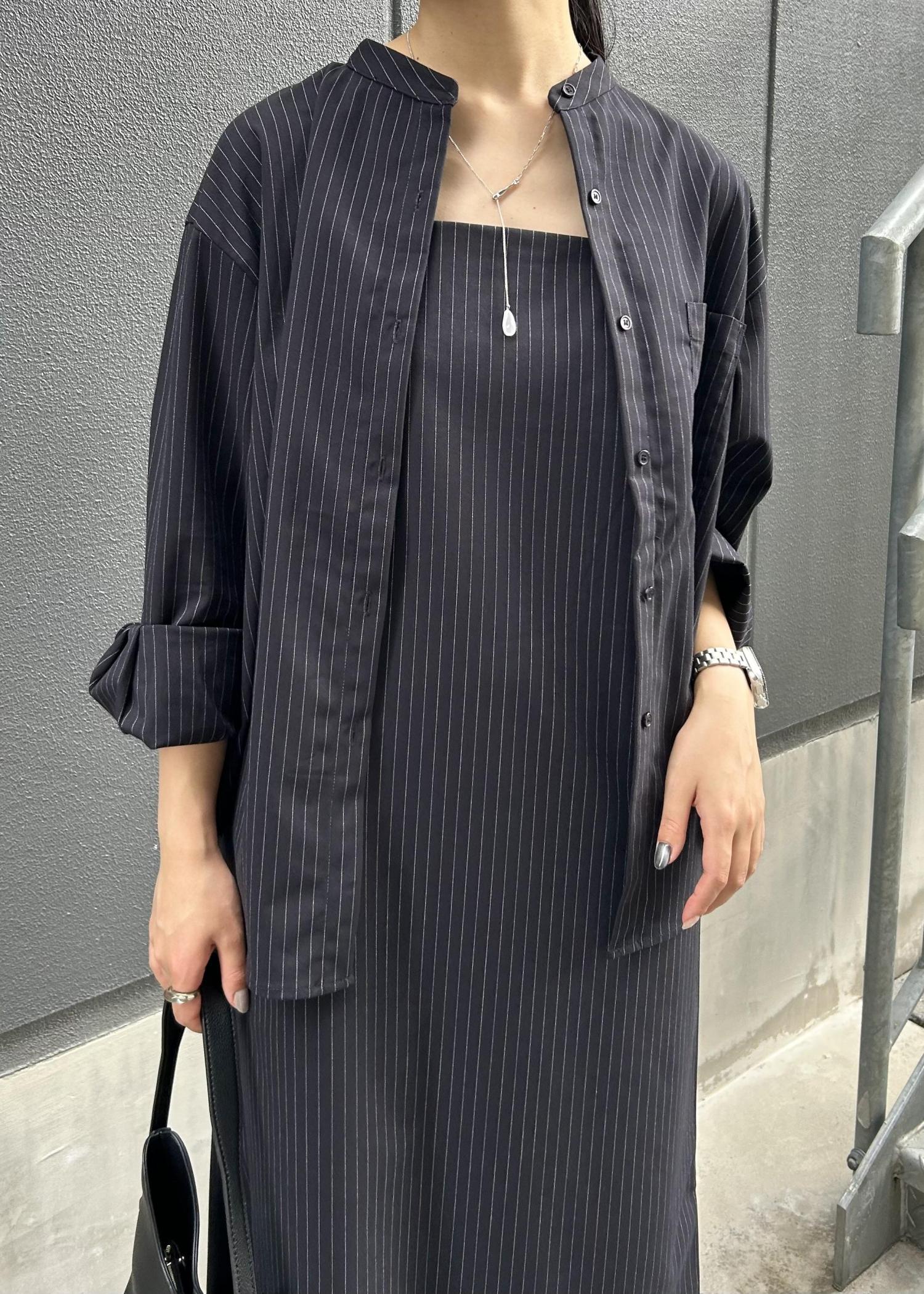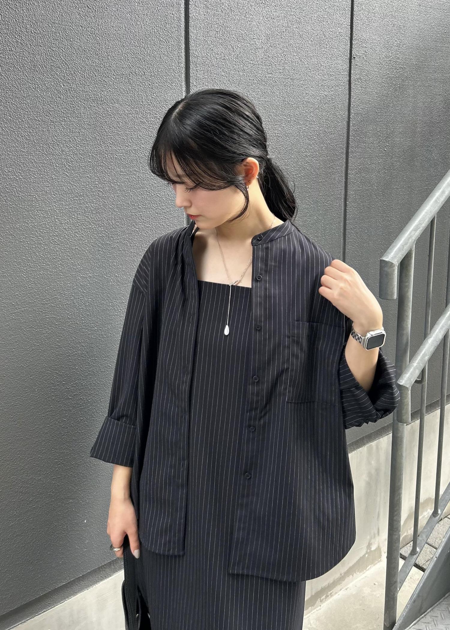 バンドカラーラウンドヘムストライプシャツ/セットアップ対応