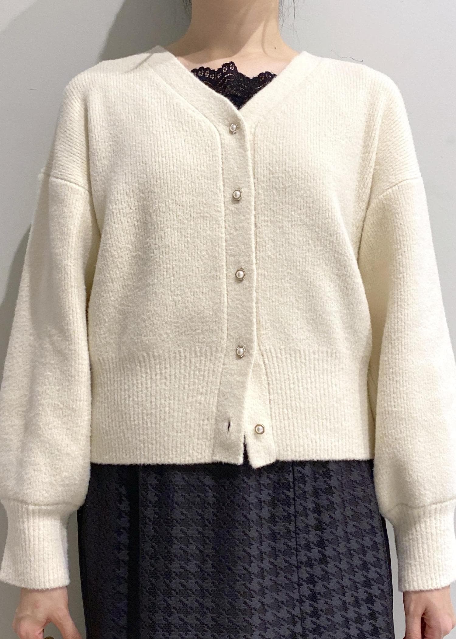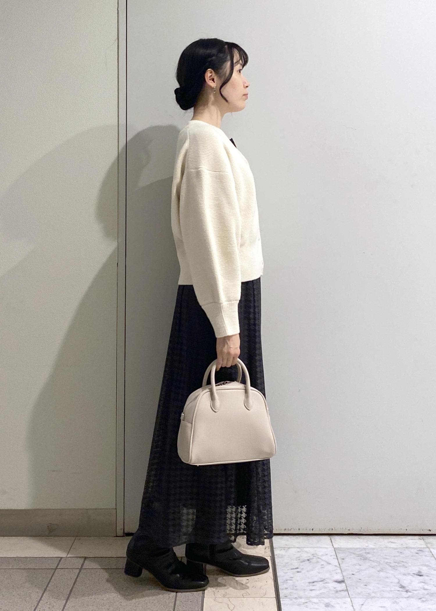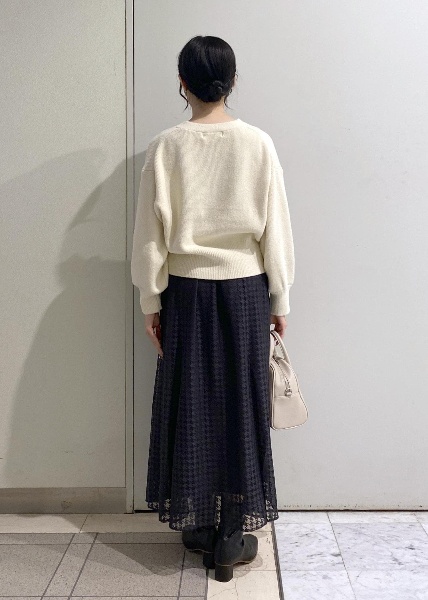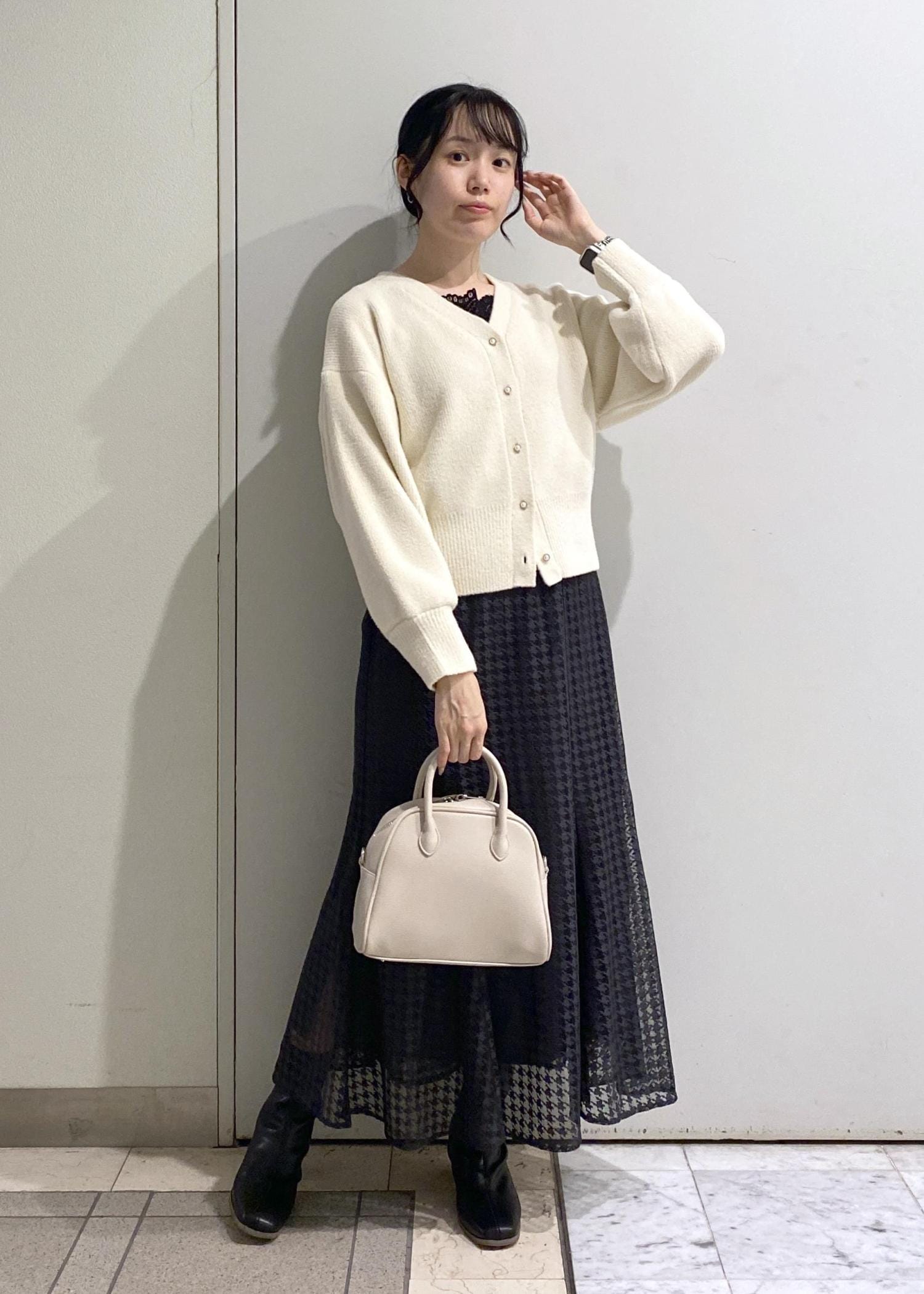 スカートがマーメイドラインのすっきりとしたデザインなので、トップスはボリュームのあるニットカーディガンをチョイス。