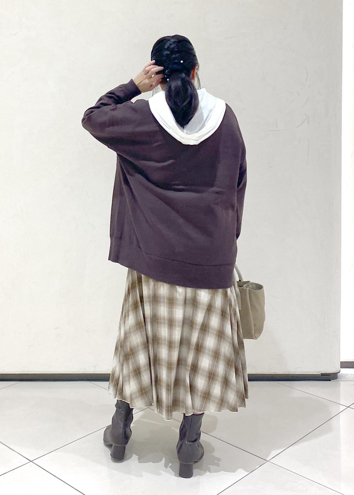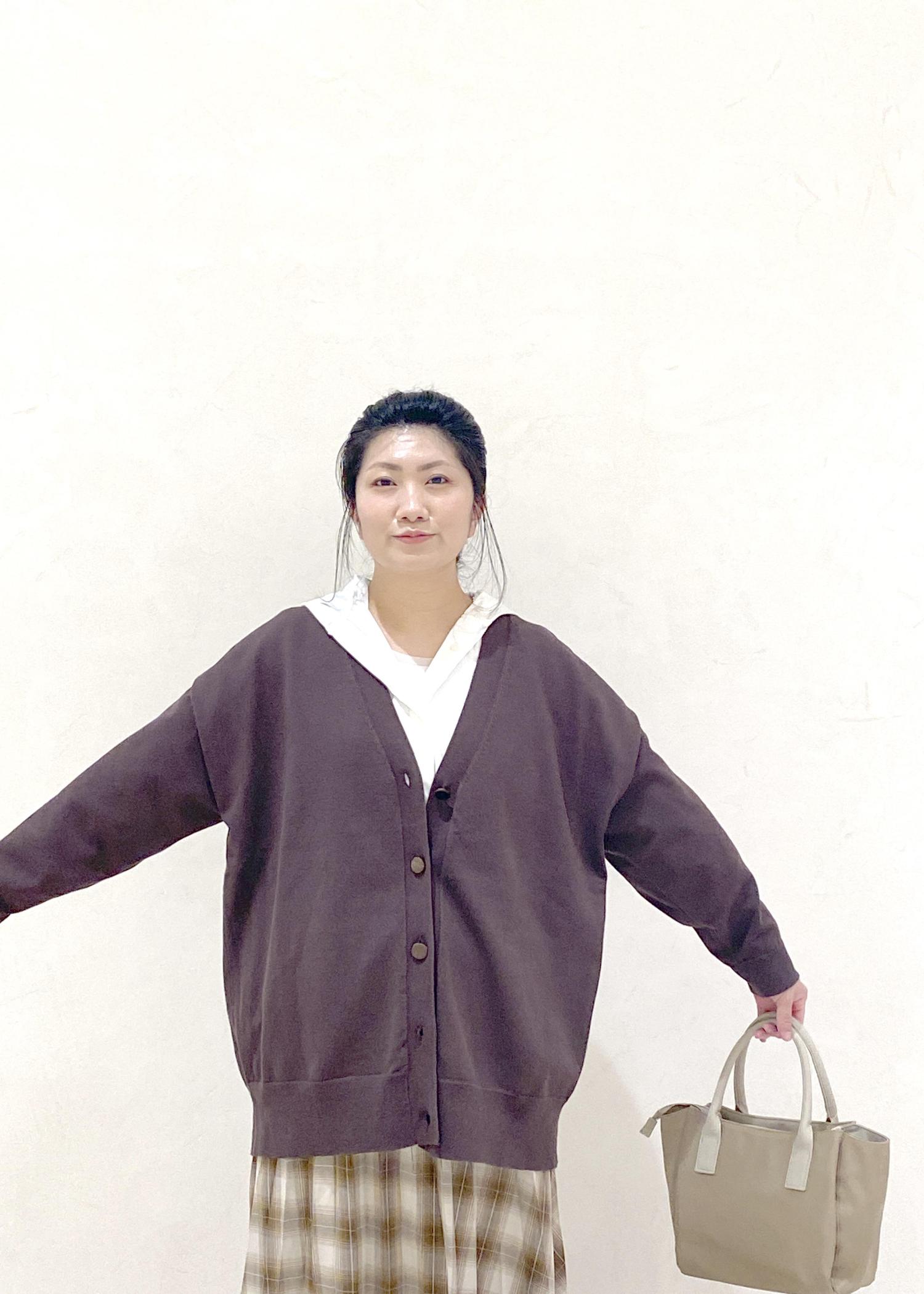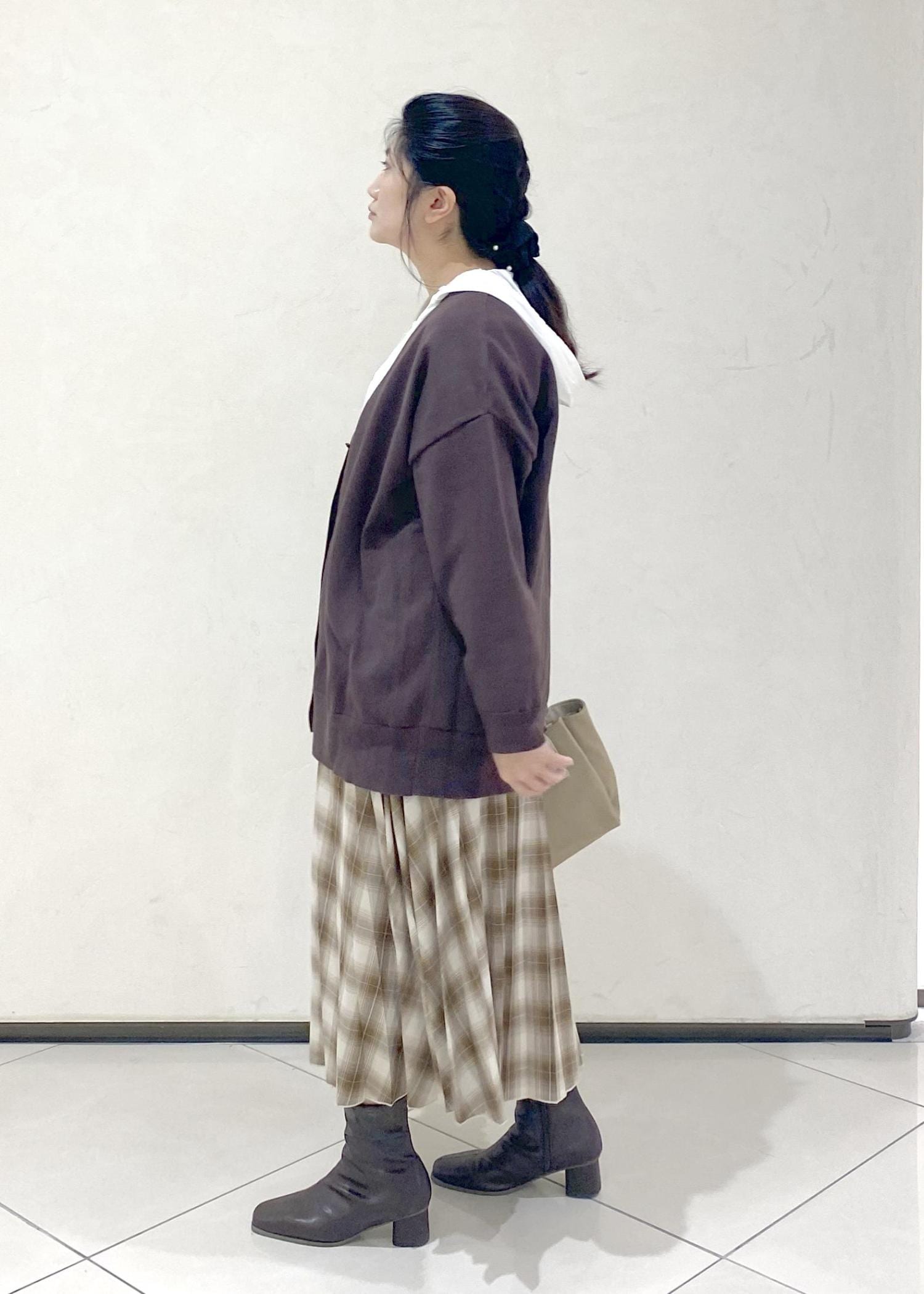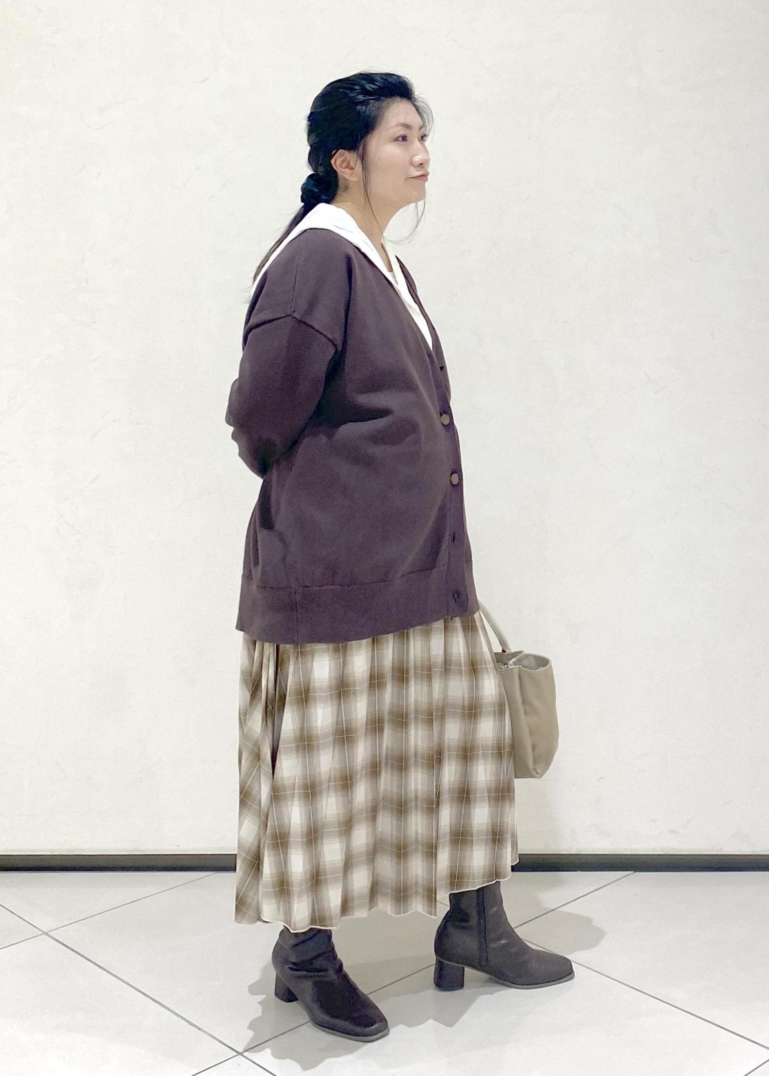 トレンドのブラウンにチェック柄を合わせた秋らしいコーデです。カーデを着脱して温度調節も可能で、朝晩と昼の気温差に対応しやすいスタイリングです。