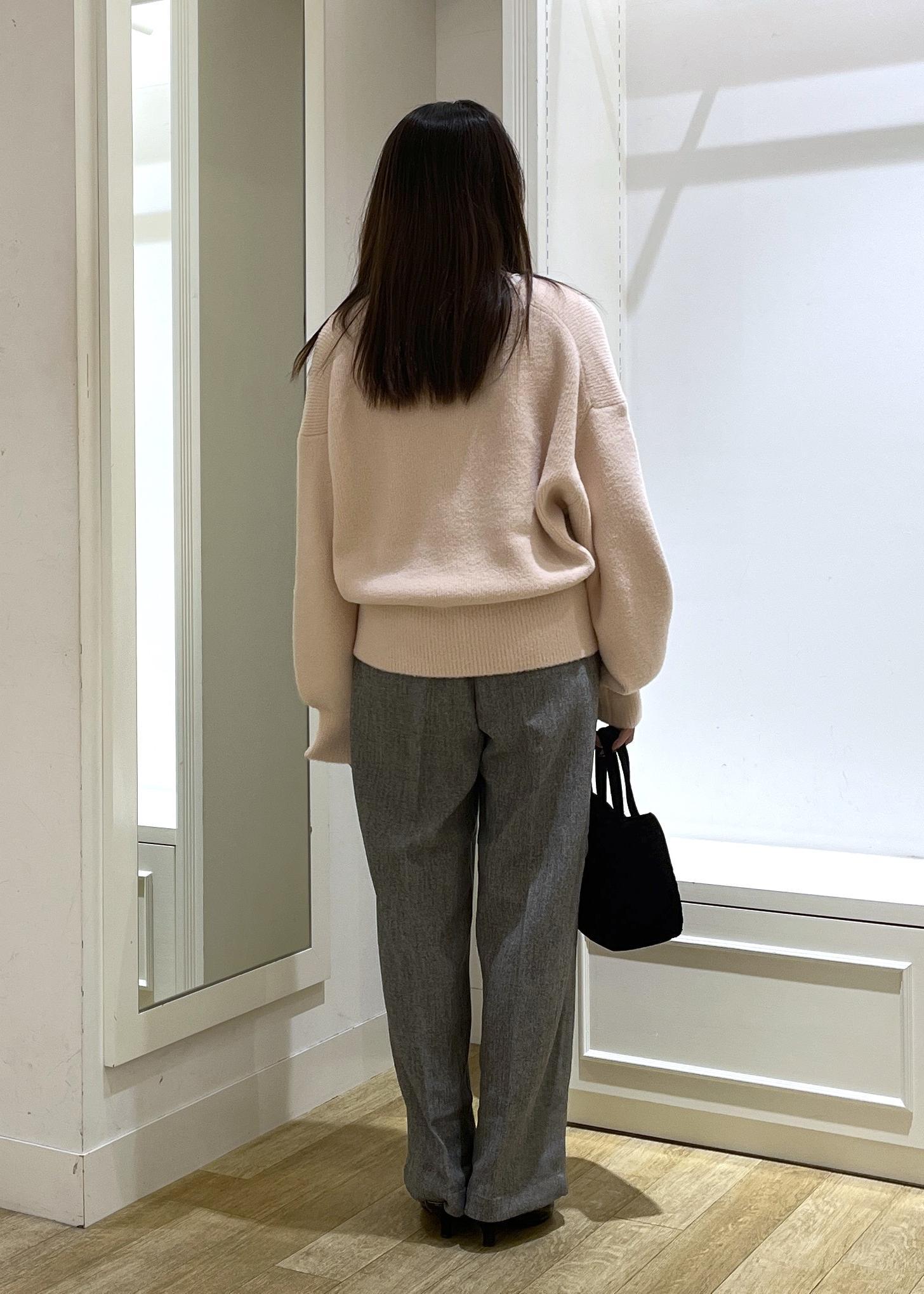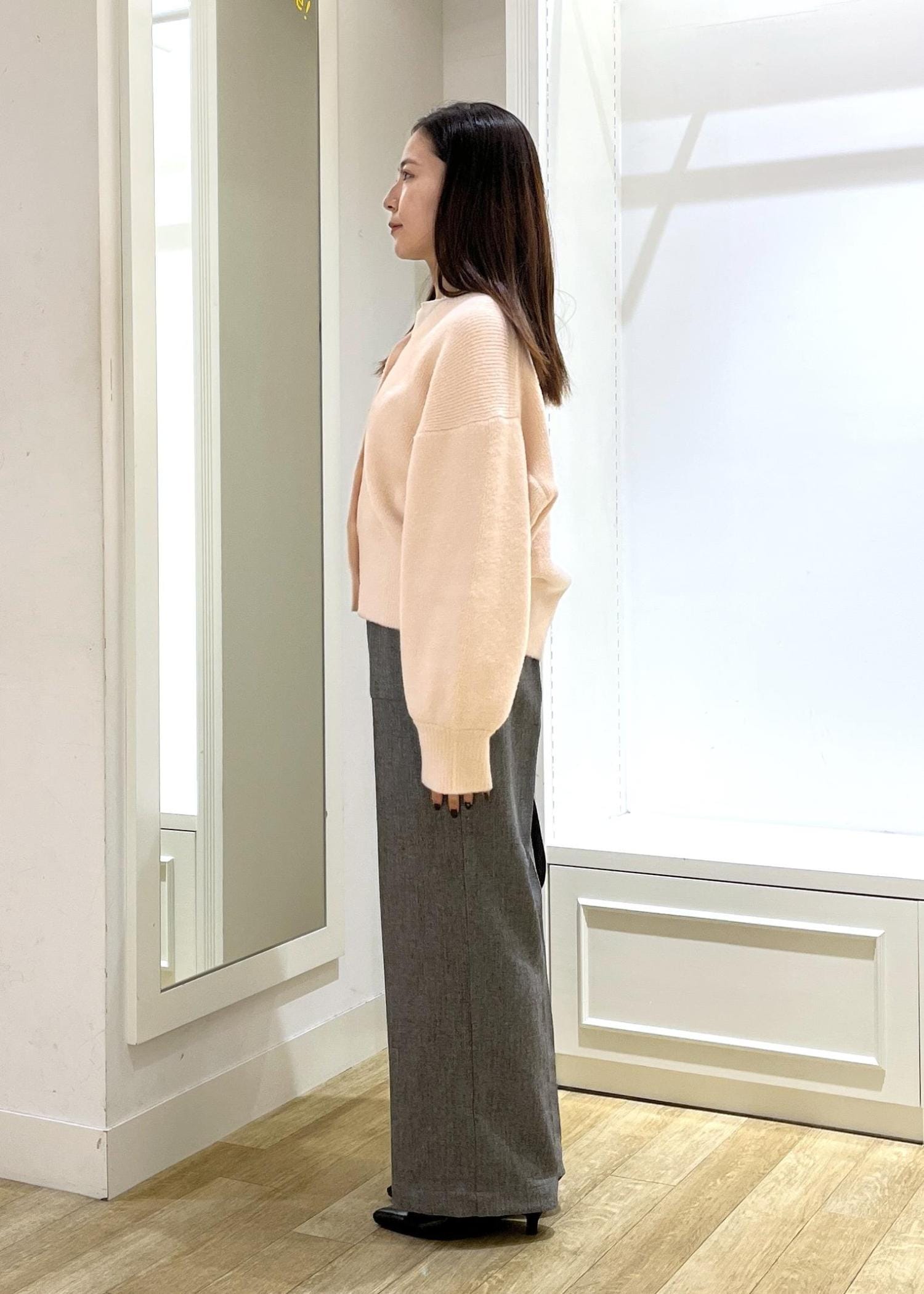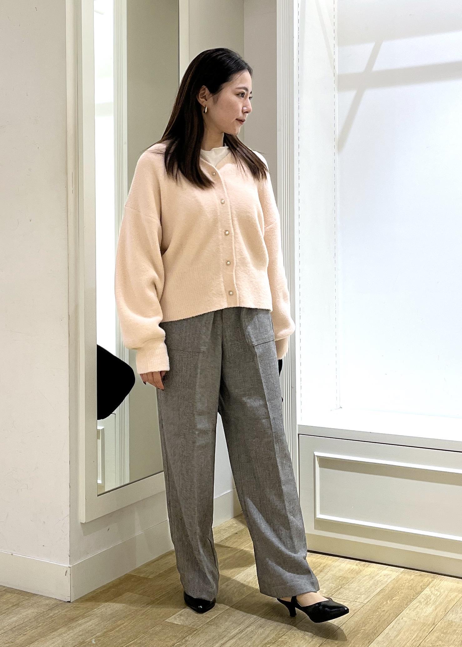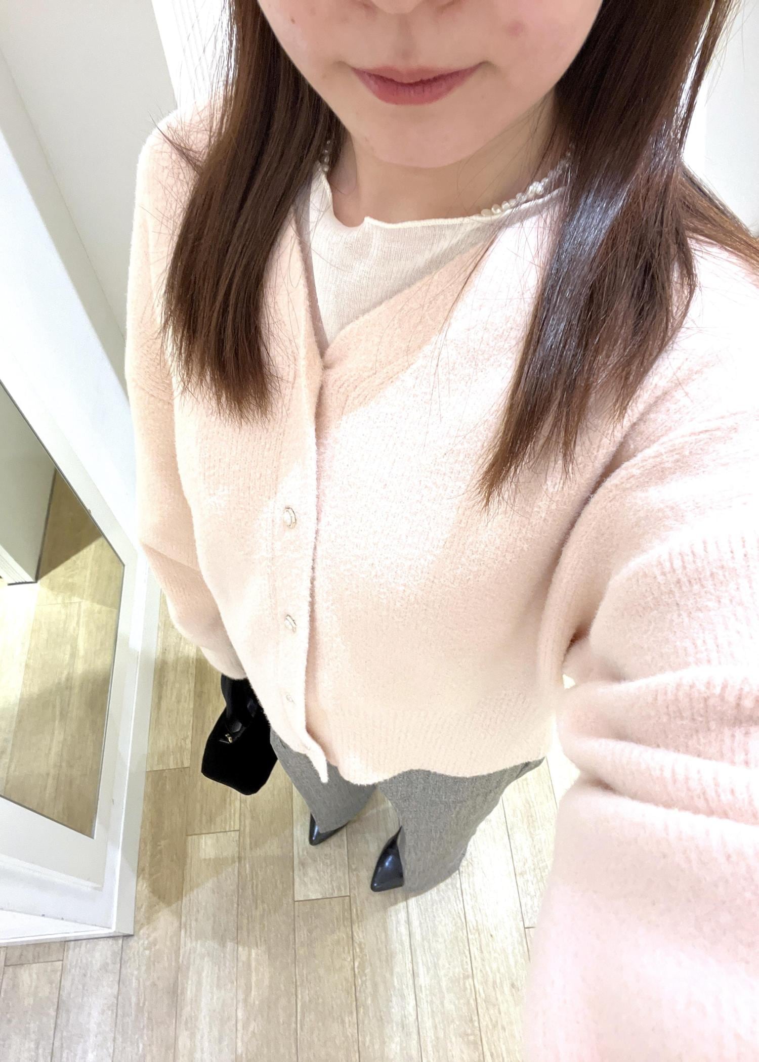 フェミニンなピンクのカーディガンをグレーのパンツと合わせて甘くなり過ぎないようにしました!小物を黒で統一して色味にメリハリをつけてます☺︎