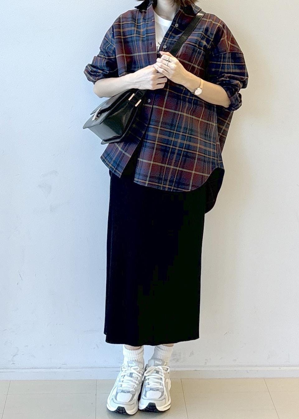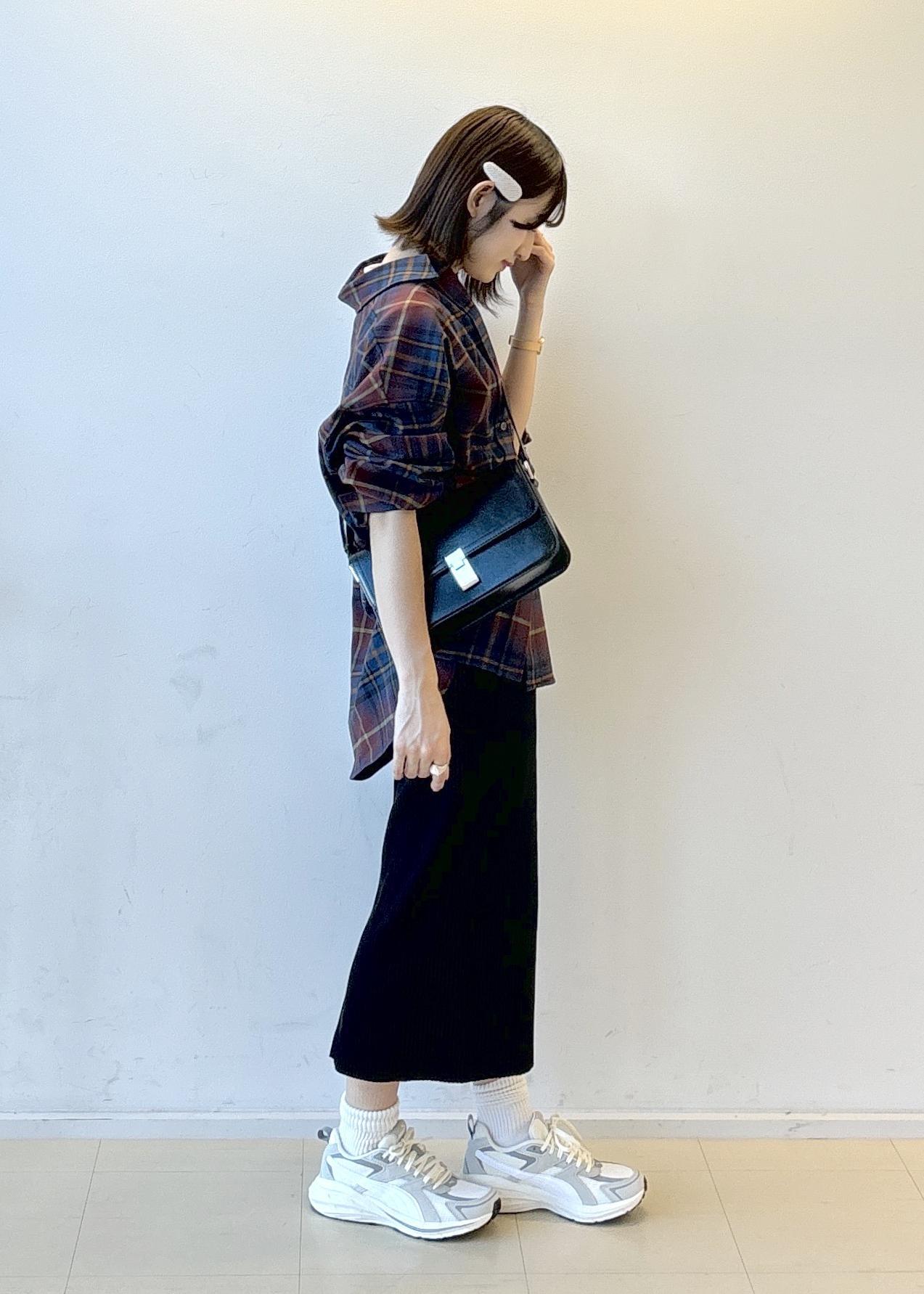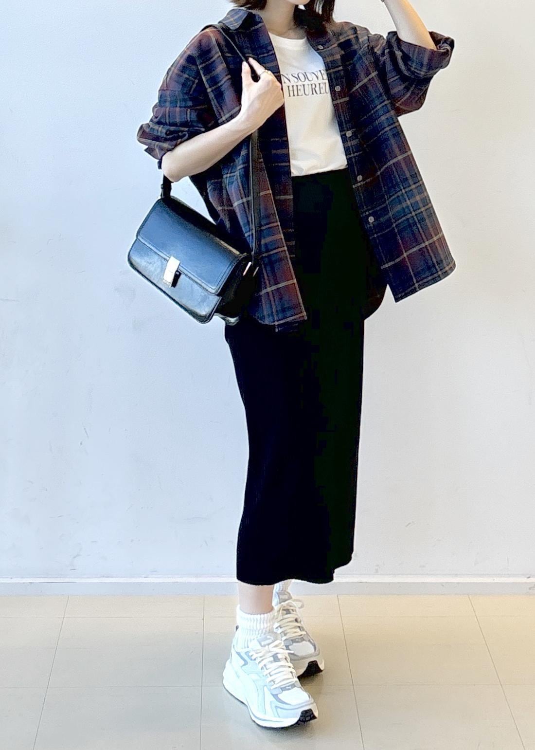 カジュアルにロンTとスニーカーを合わせて、でも小物を黒でまとめて大人っぽい着こなしに。