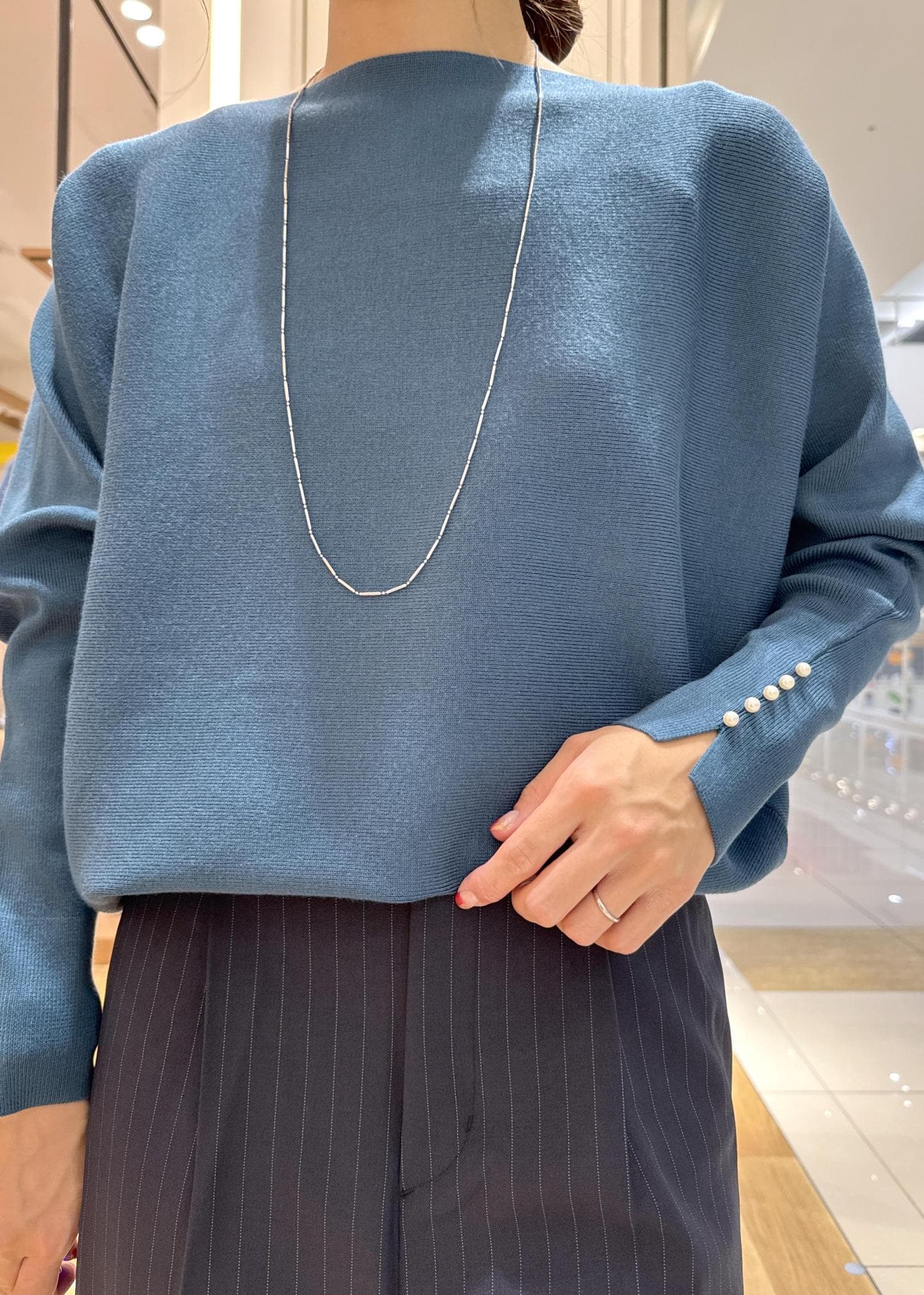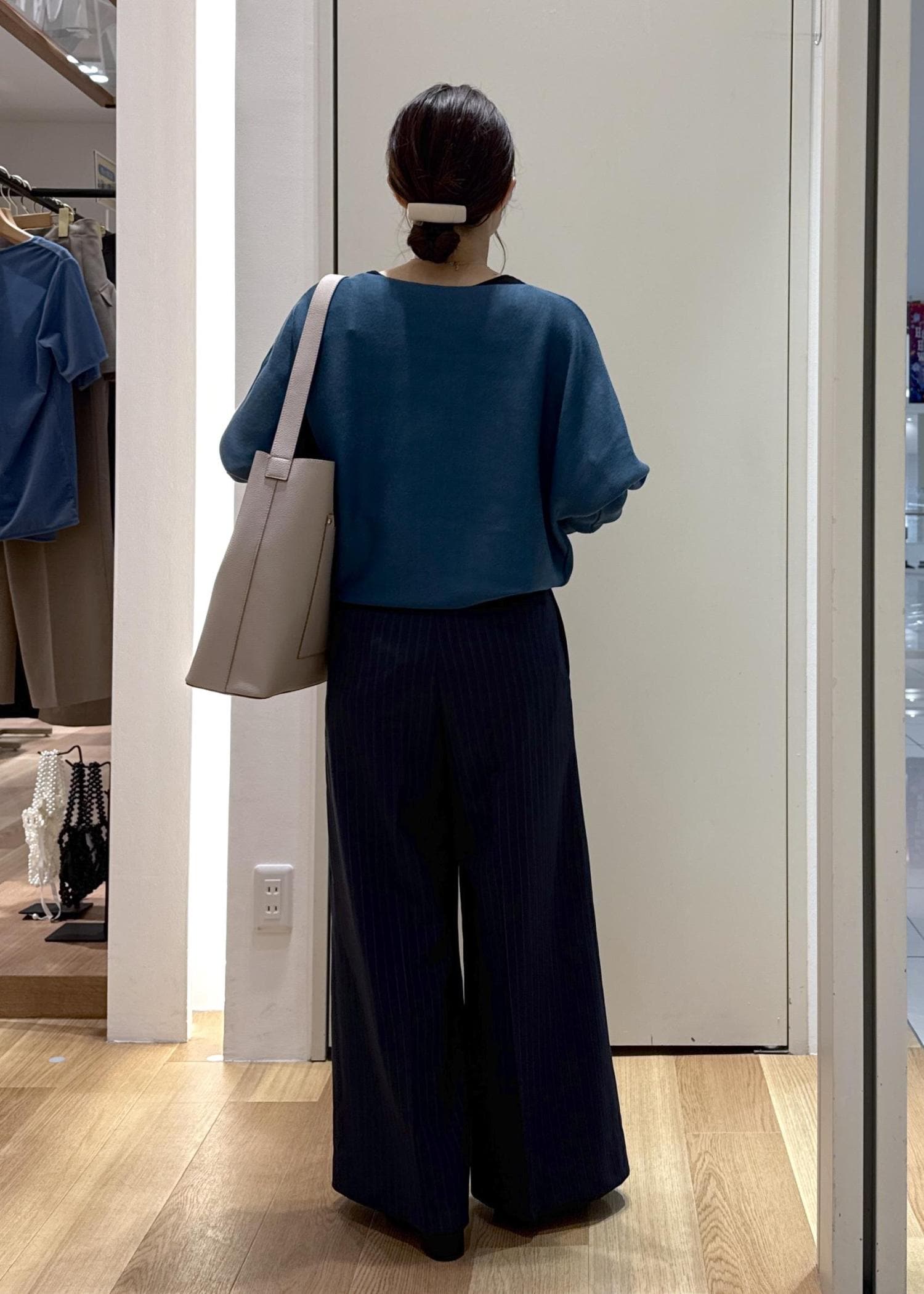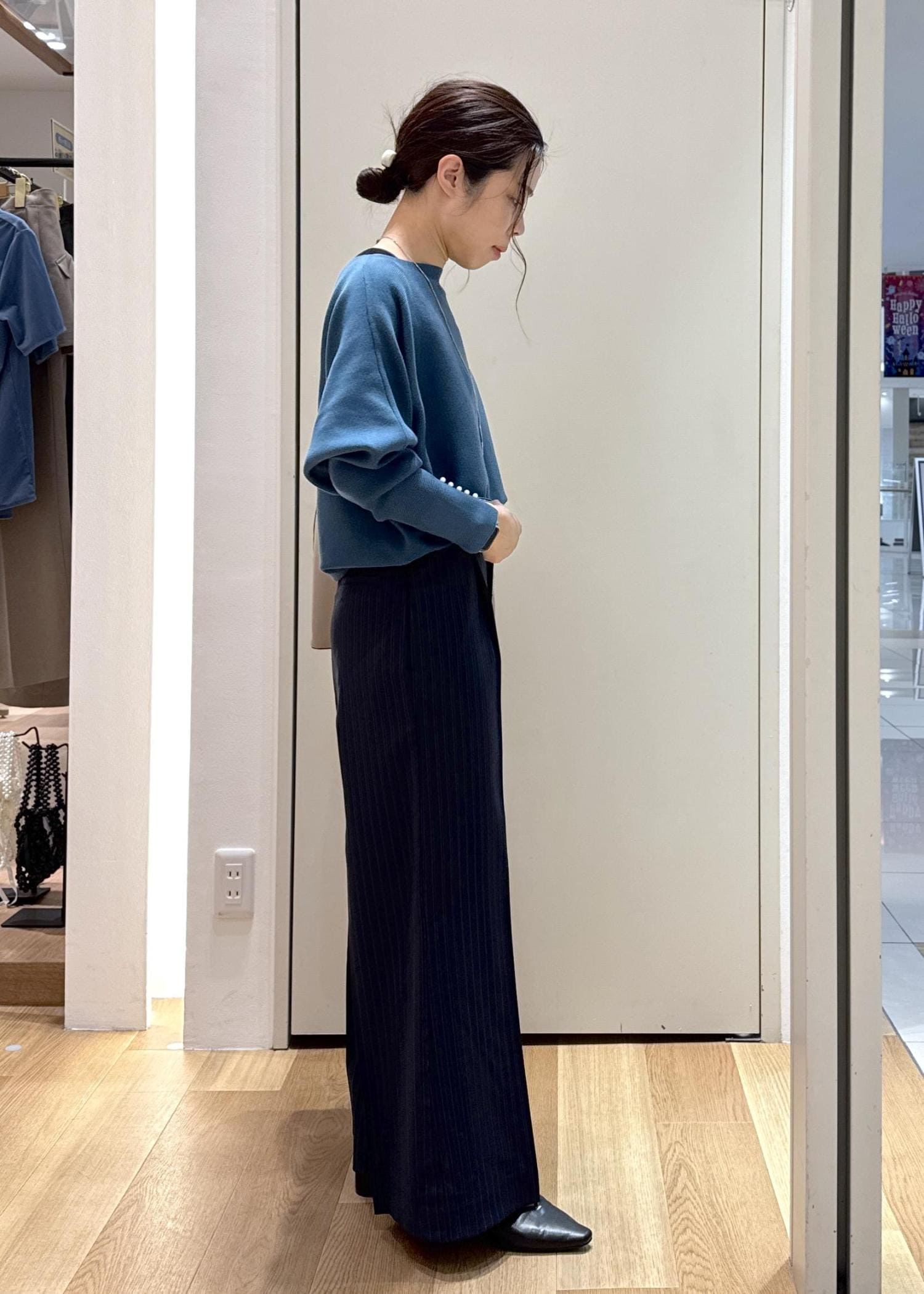 秋冬は暖色系に偏りがちですが、深めのブルーのニットなら、落ち着いた大人っぽい秋コーデに仕上がります♪
