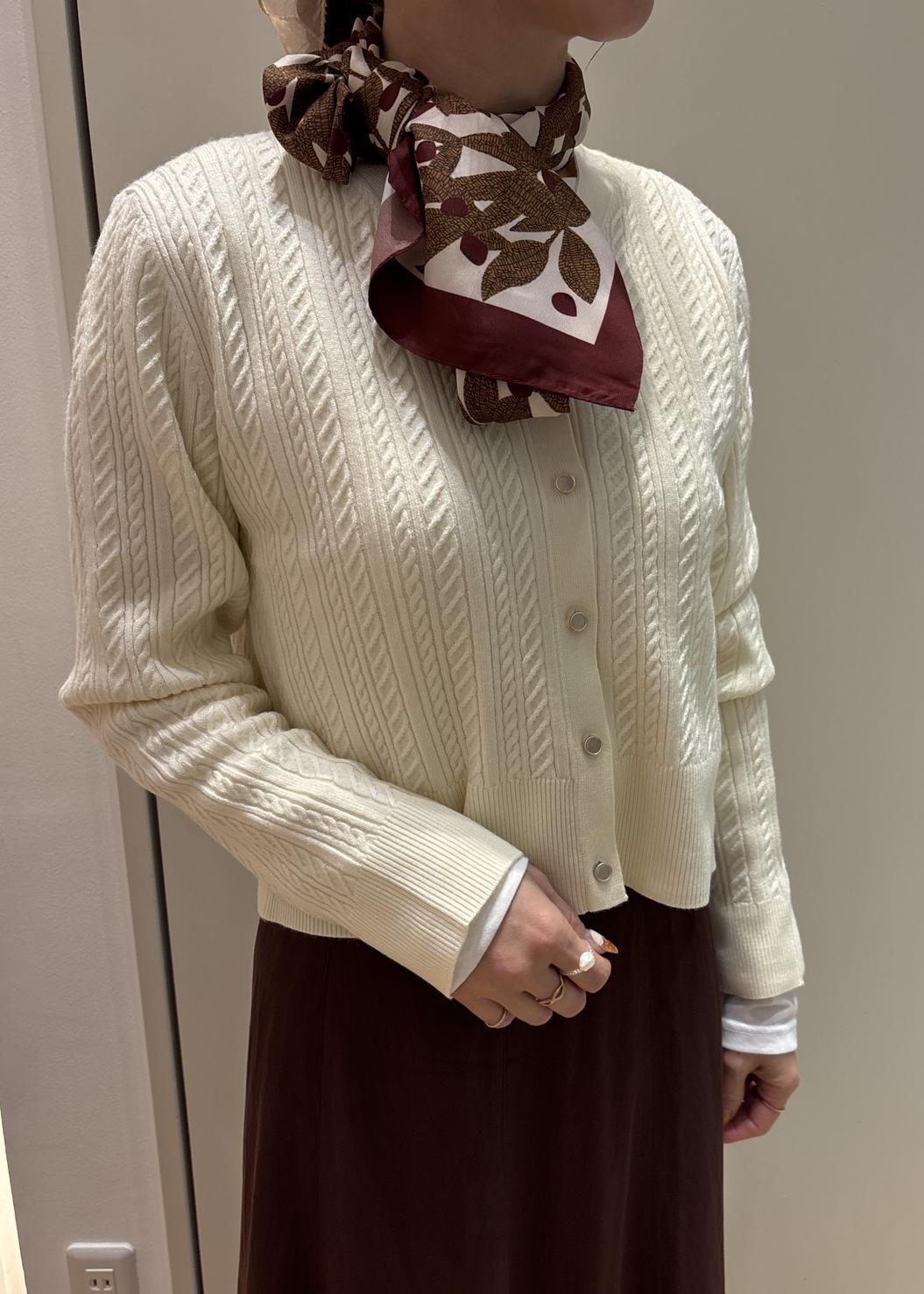 ケーブル編みが可愛くて、1枚で着映えするカーディガンです。