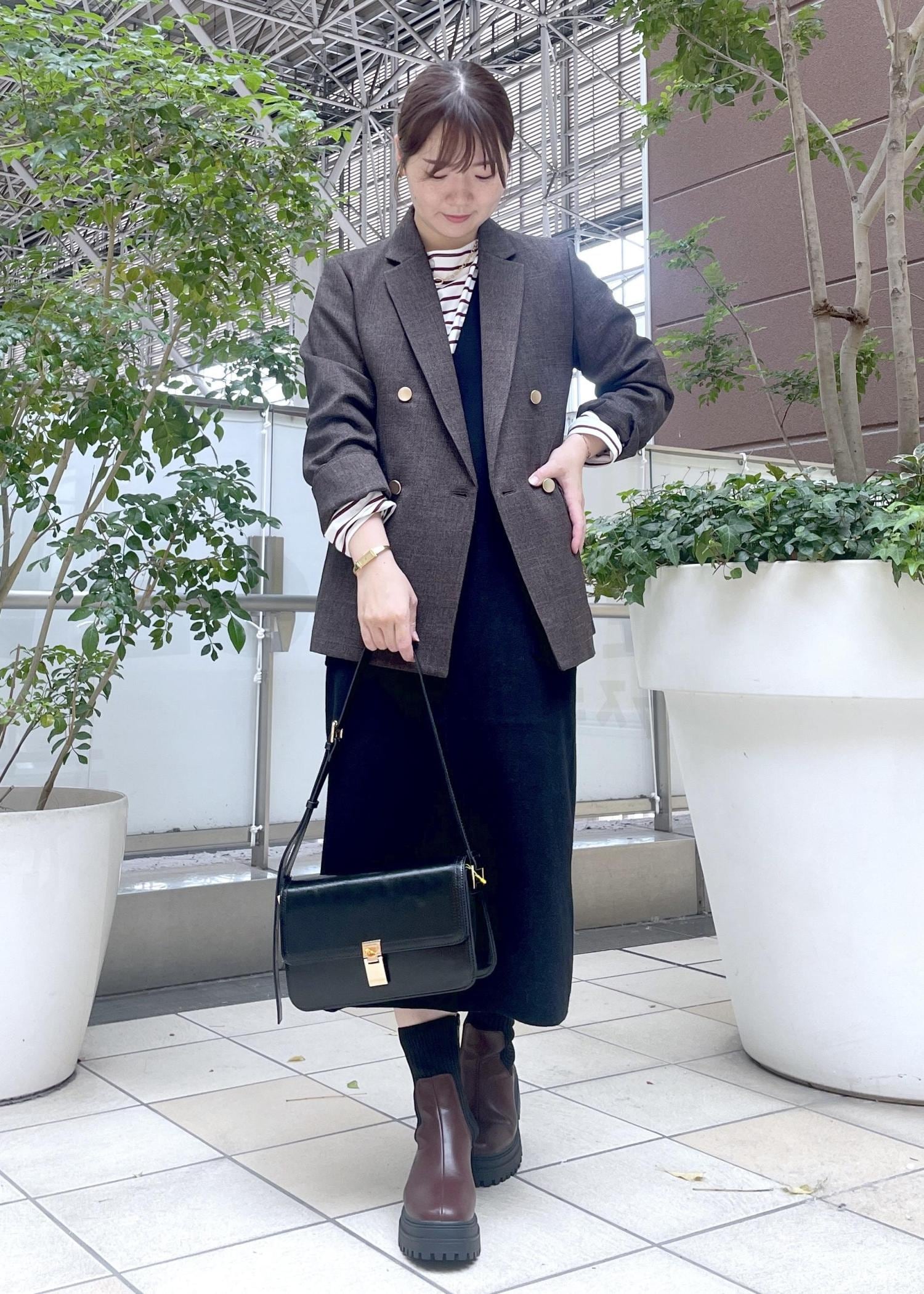 ブラウンのジャケットにニットワンピを合わせた秋のお出かけスタイルです。