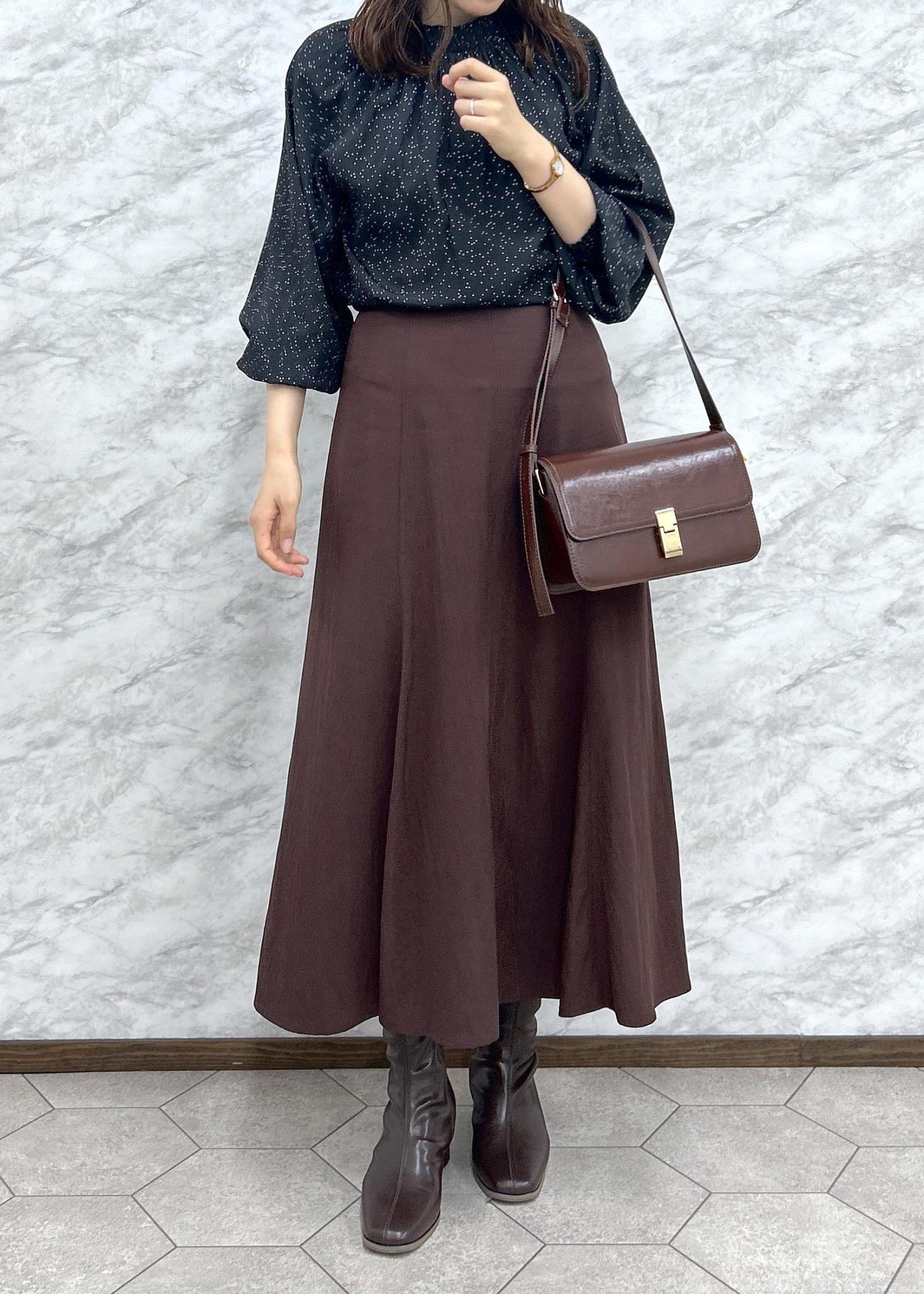 ふんわりとしたブラウスとマーメイドシルエットのスカートは、アイテム自体が女性らしいのでカラーは落ち着いたカラーにしてレディハンサムの雰囲気にしました。