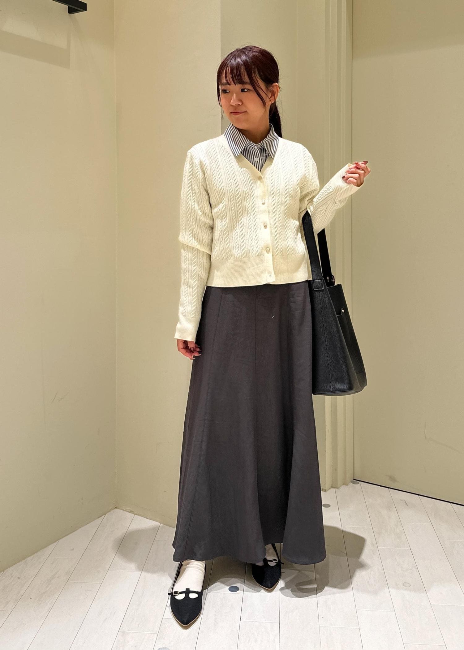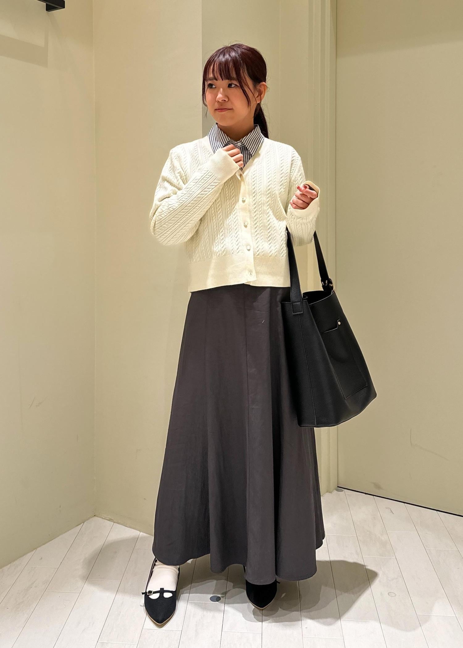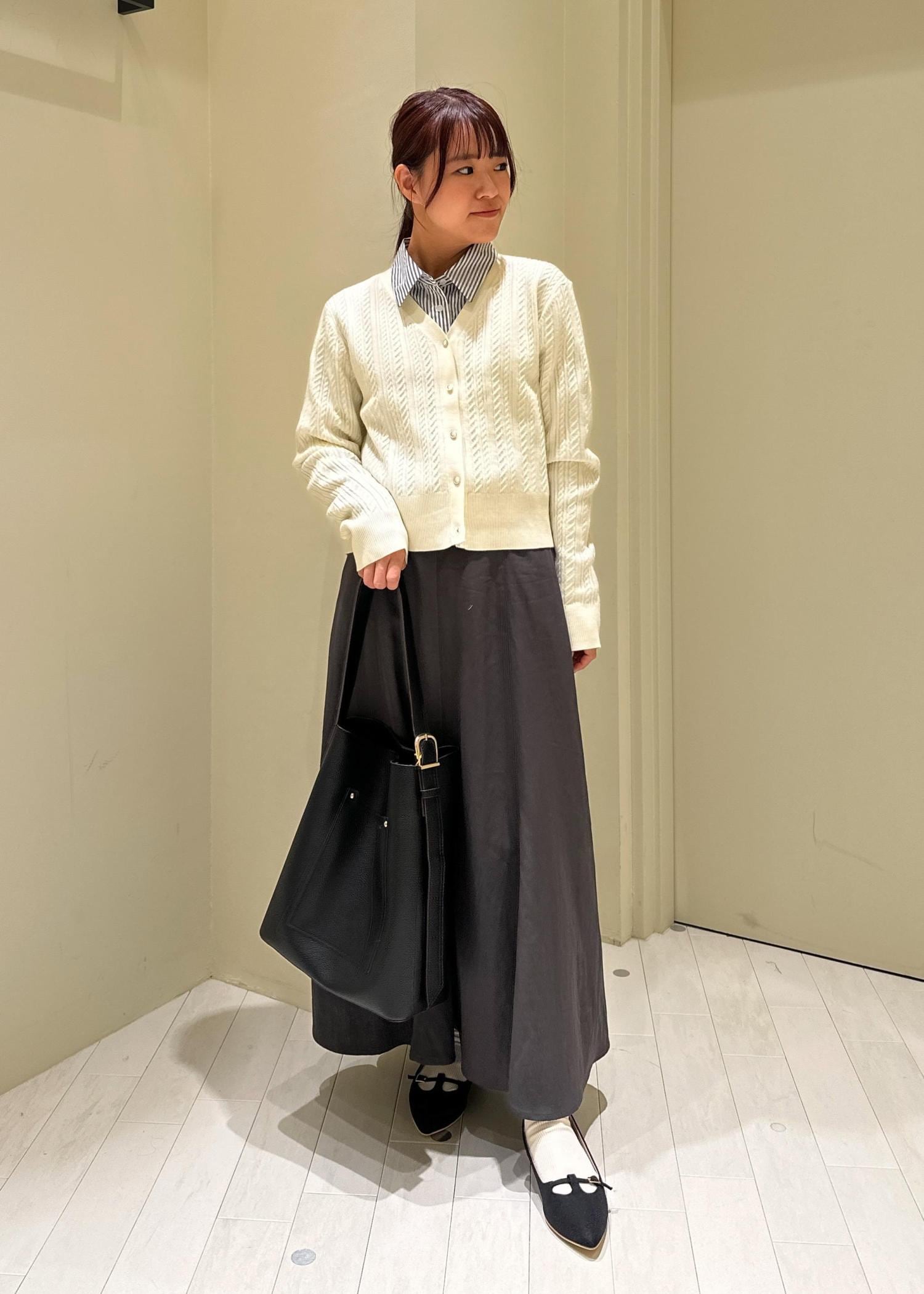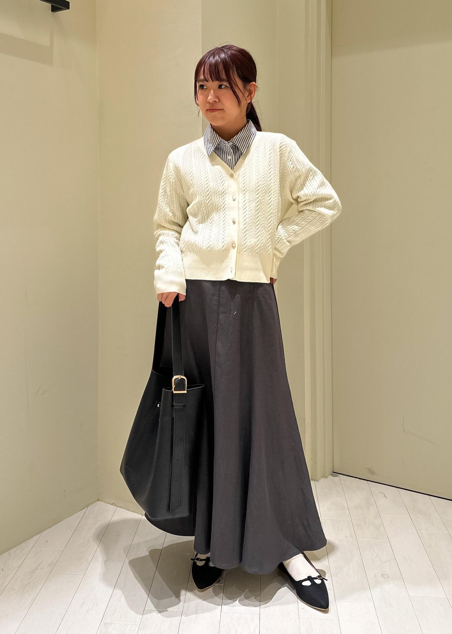 襟付きのシャツに印象の良い白のケーブルニットカーデを合わせ、きちんと感ときれいさを兼ね揃えたオフィススタイル。