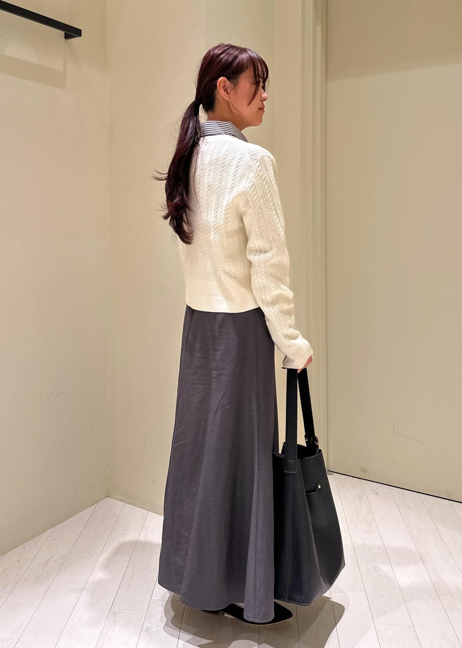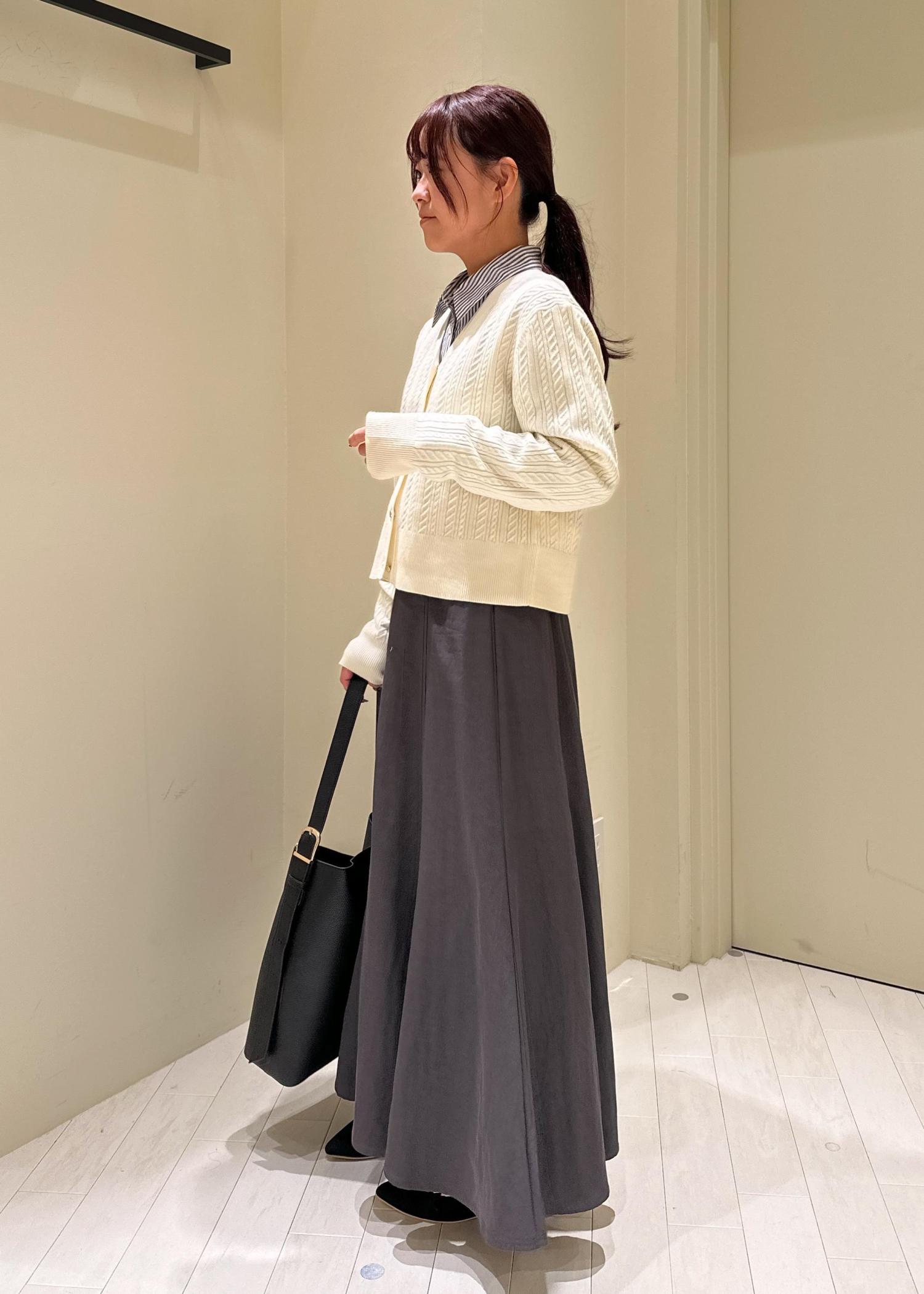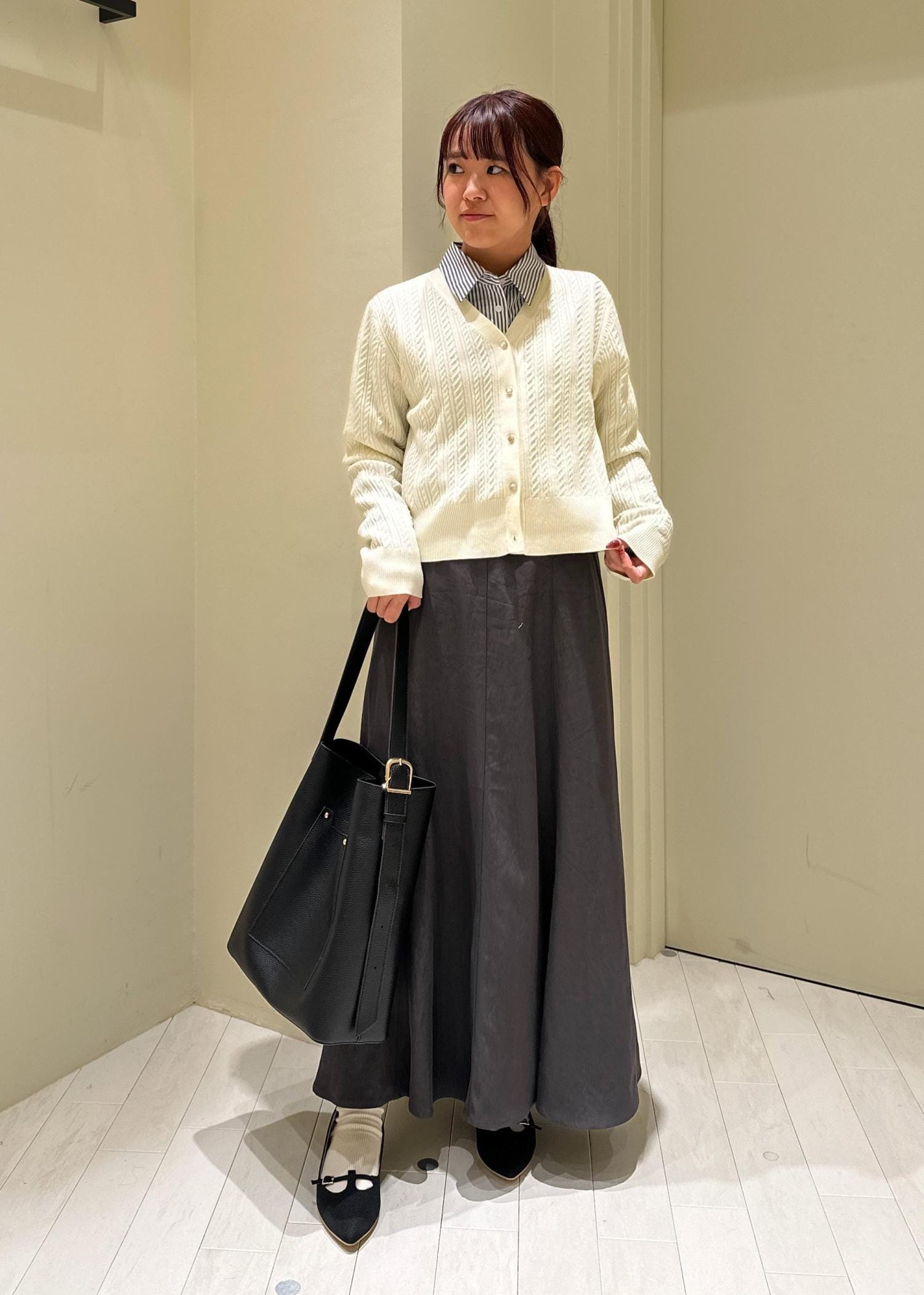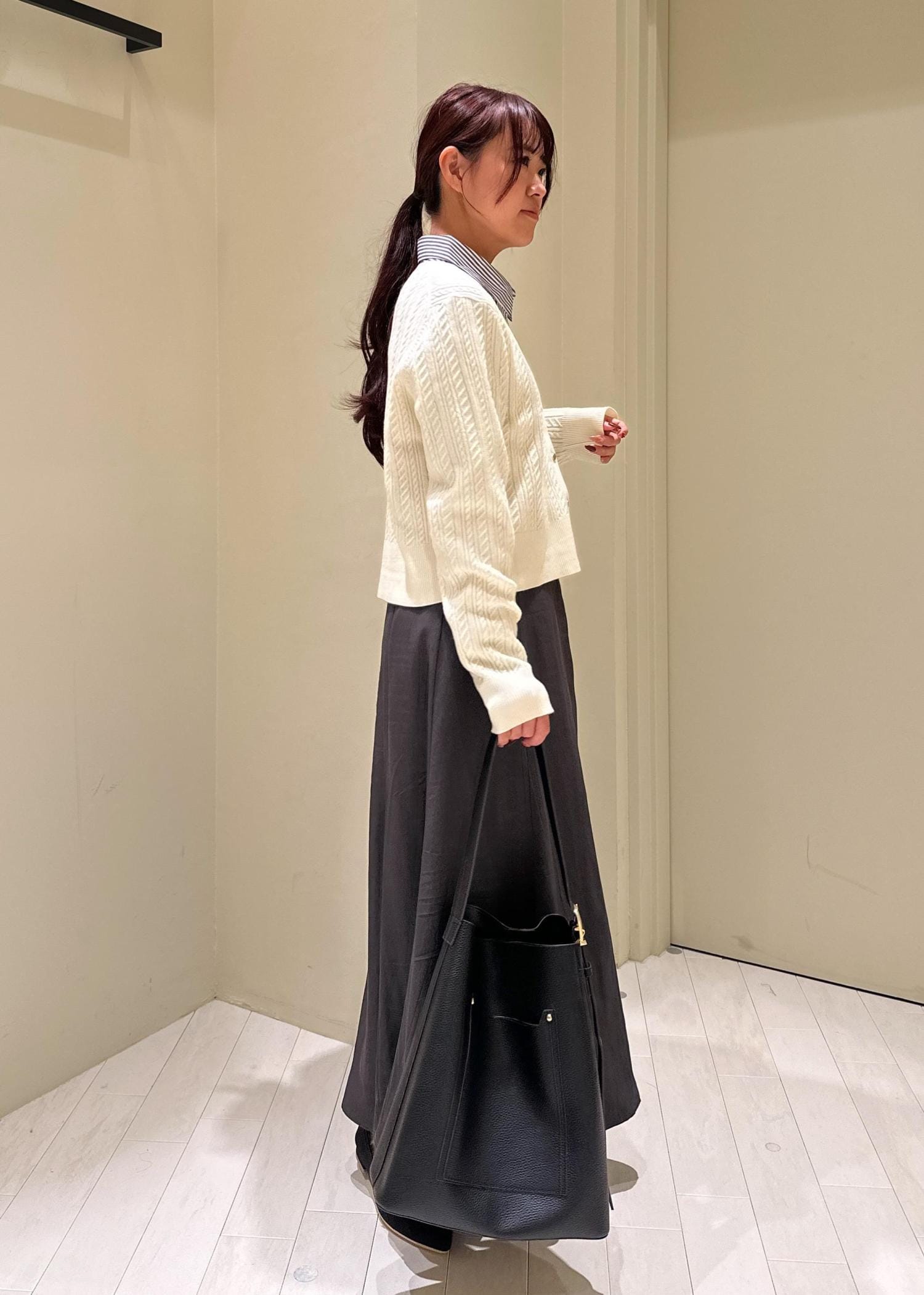襟付きのシャツに印象の良い白のケーブルニットカーデを合わせ、きちんと感ときれいさを兼ね揃えたオフィススタイル。